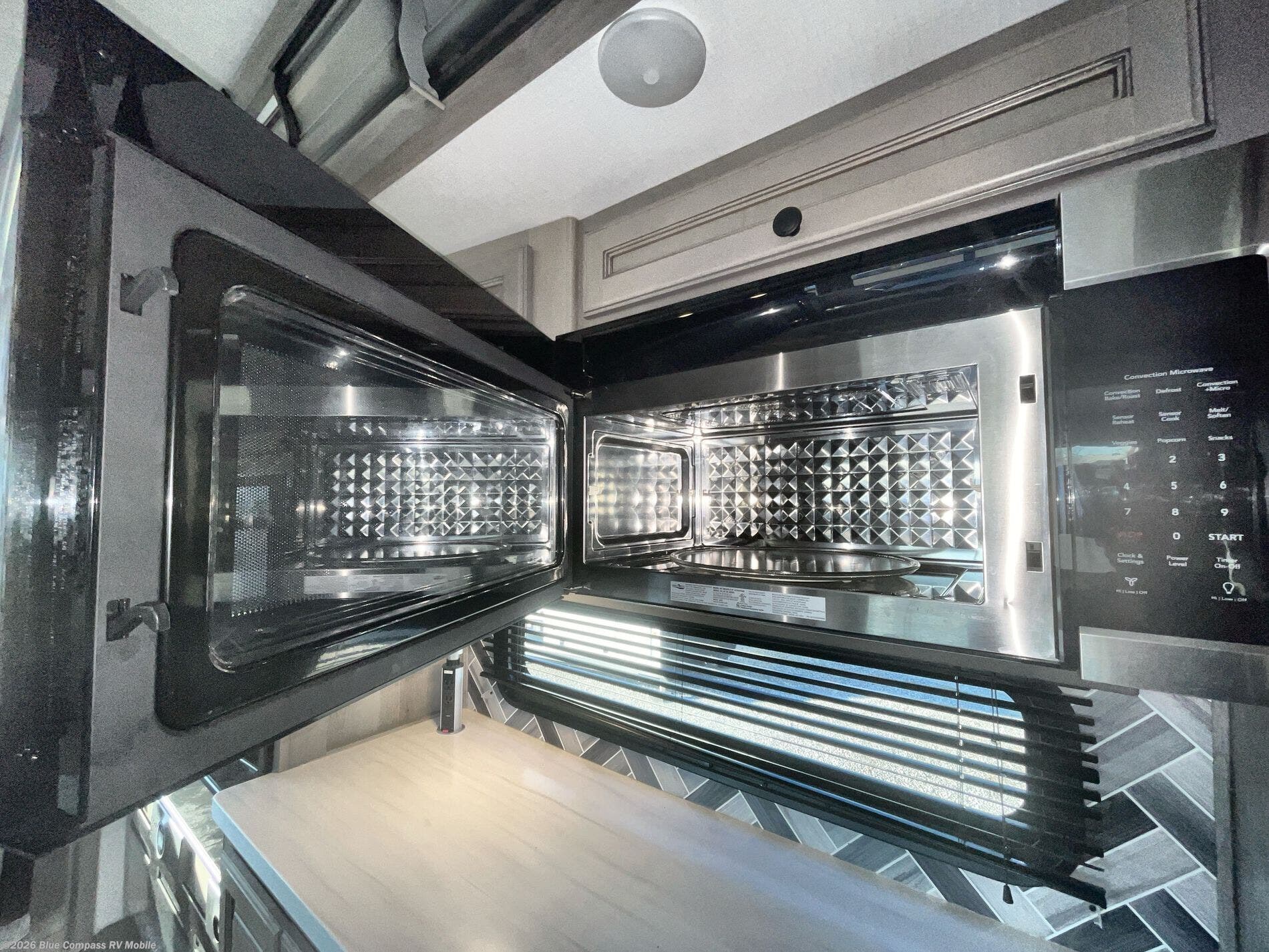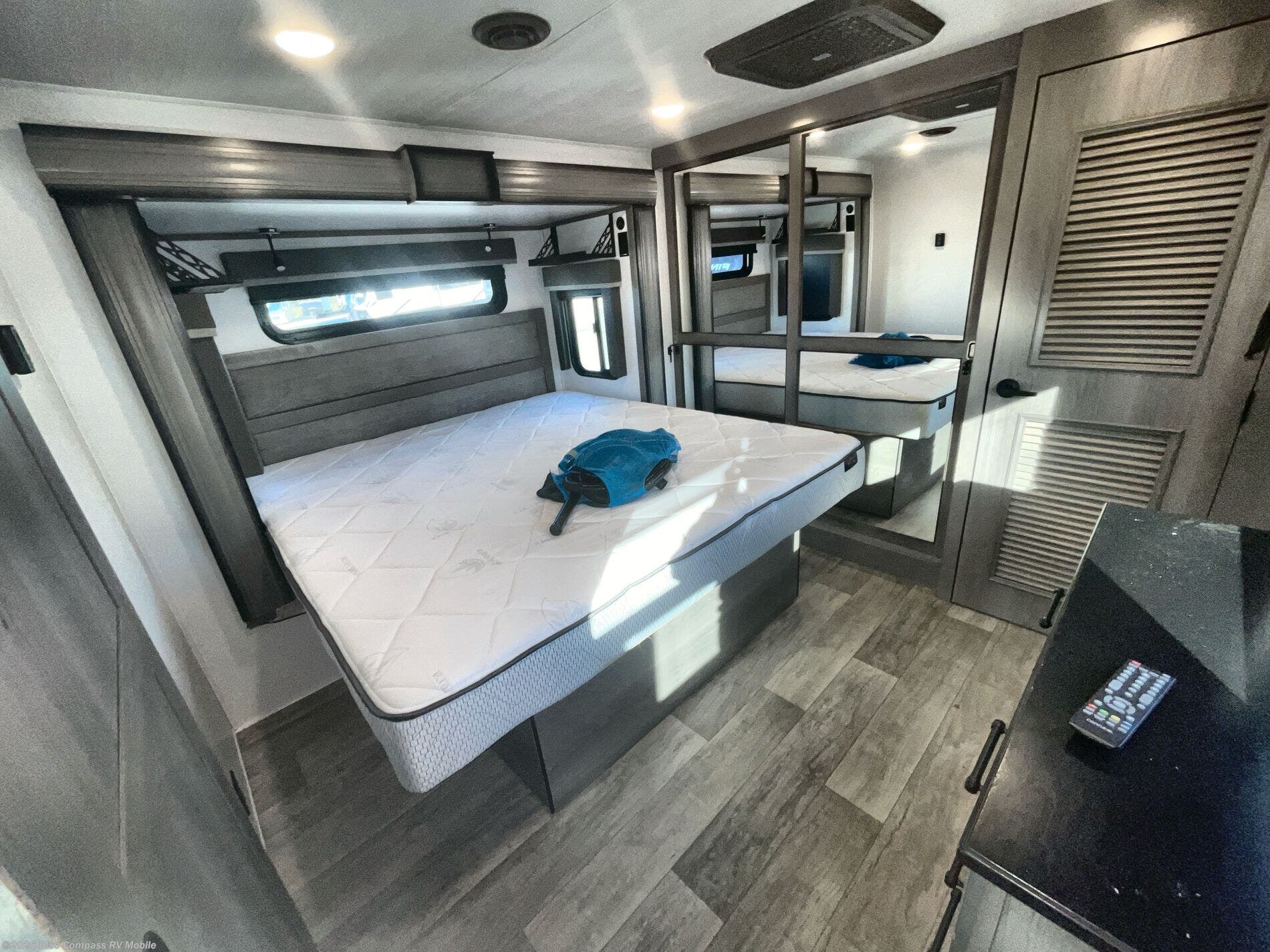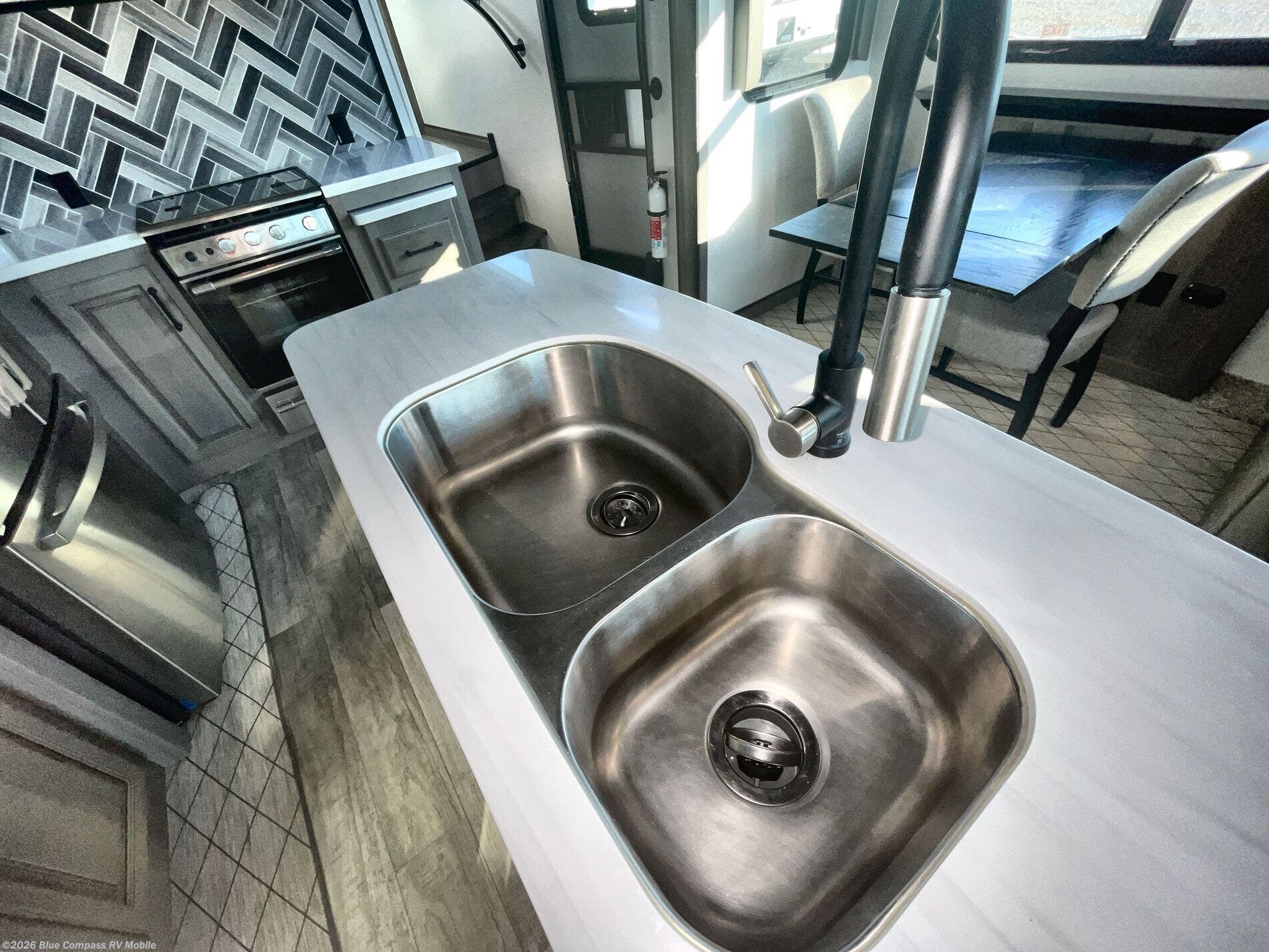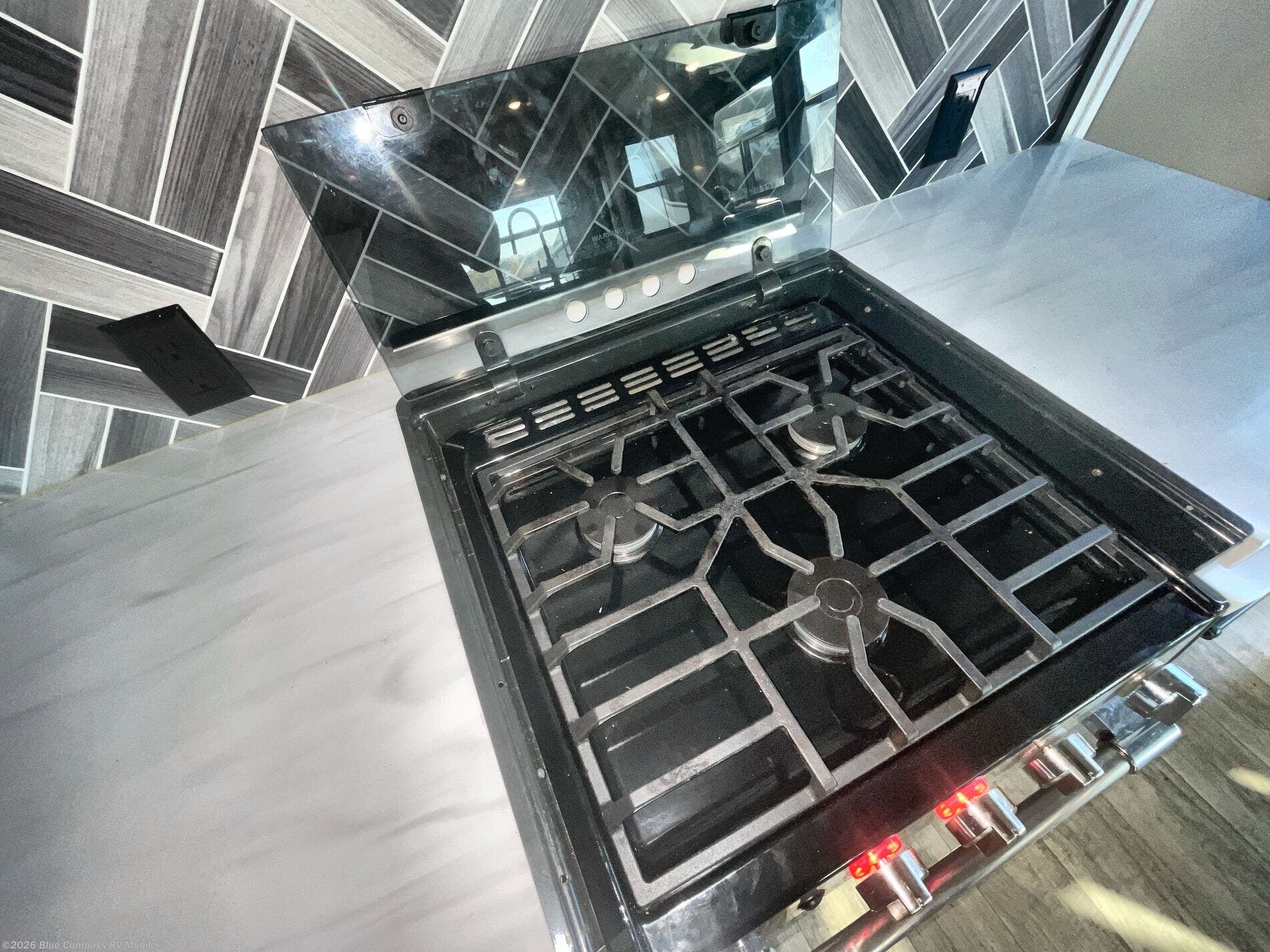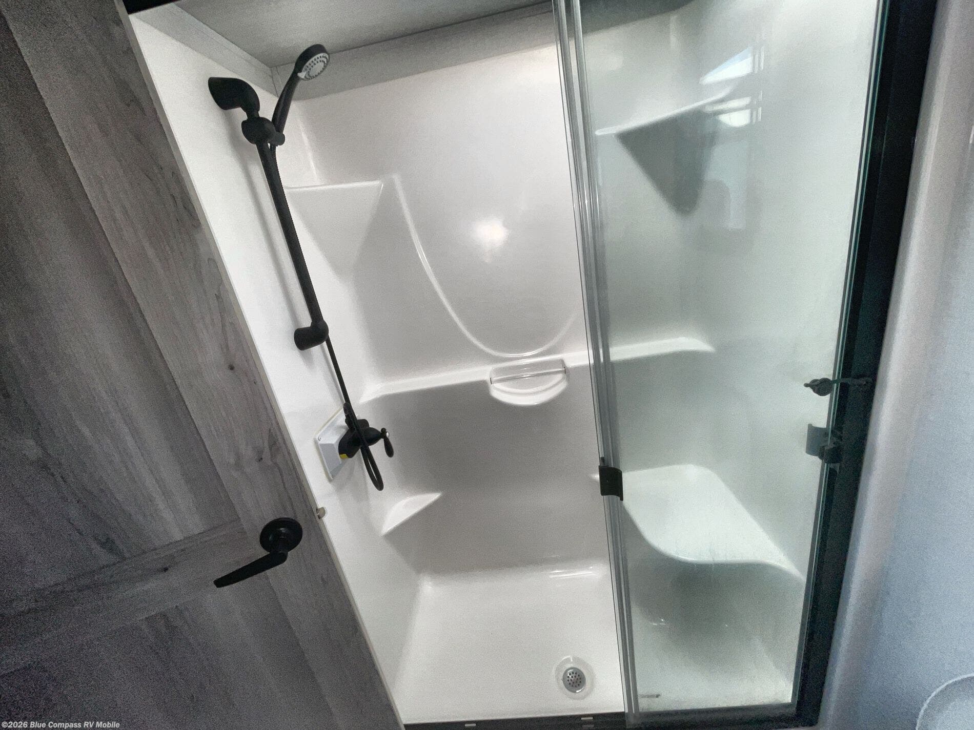 Luxury abounds throughout this fifth wheel! Starting in the kitchen with the island, two pull out pantries with extra countertop space above it, a glass top range with a pull-down spice rack in the range hood, and a pull out countertop for more prepping space. The full bathroom has a 48" x 30" fiberglass shower with a seat, decorative glass enclosure, and skylight above it for more natural lighting as two get ready at once with the dual sink vanity. Sleep like a baby in the front private bedroom on the king bed slide with storage underneath and keep your clothes looking their best with the front closet that has a clothing hamper and an area prepped to add the optional stackable washer and dryer. The rear living area offers true relaxation with a hide-a-bed sofa and power Thomas Payne theater seating across from the entertainment center with a 5,000 BTU decorative fireplace heater and 50" Smart TV to watch your favorite movies!