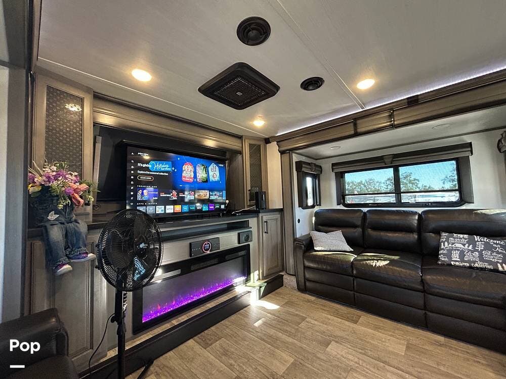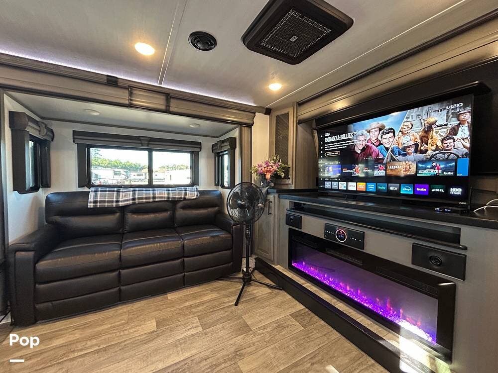 The spacious front living room features opposing seating, a telescoping 50″ Smart TV, and an electric fireplace for cozy evenings indoors.