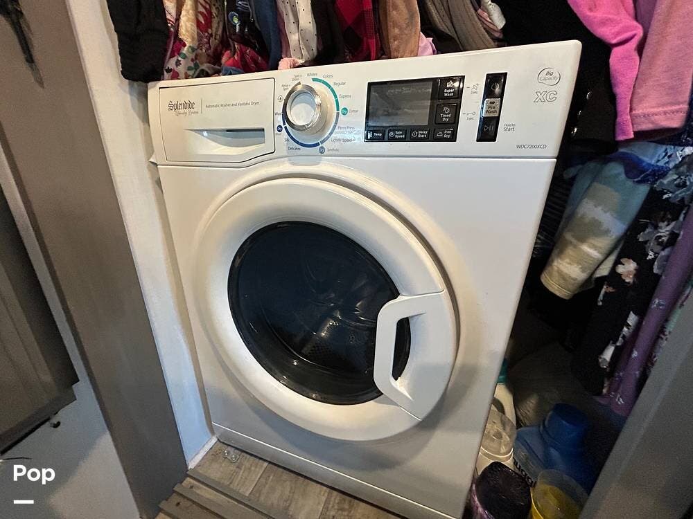 Queen-size bed with slide, large wardrobe (washer/dryer combo), dresser, and private master bathroom create a true residential feel.