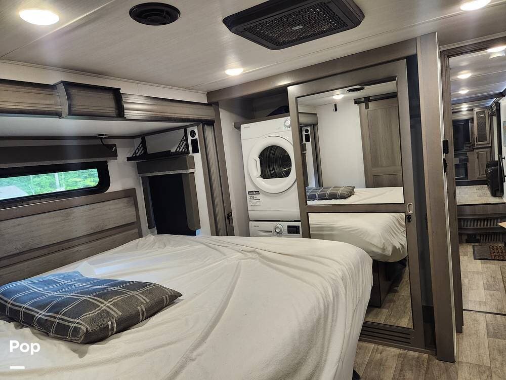 In the private quarters, you'll find a full master suite with a king-size bed slide, dresser, wardrobe, and a 32-in TV.
