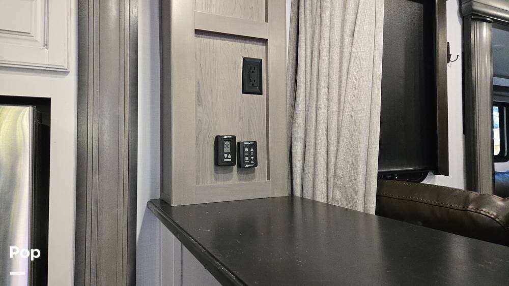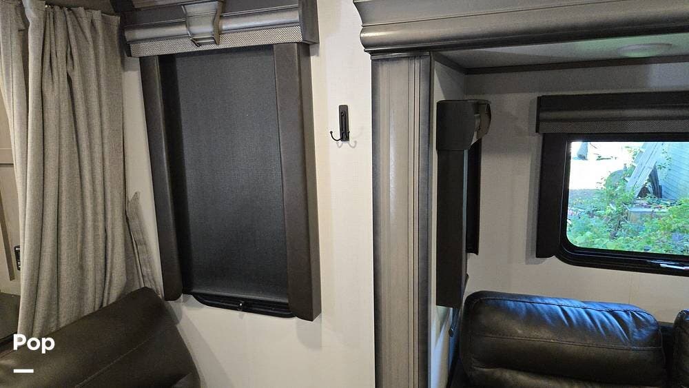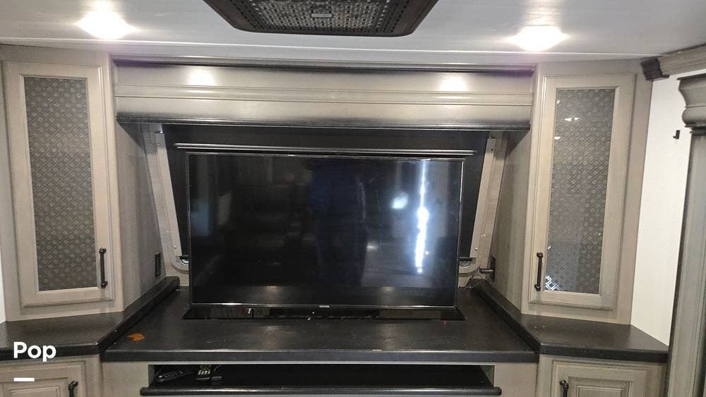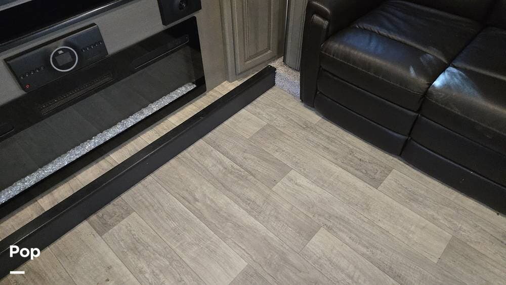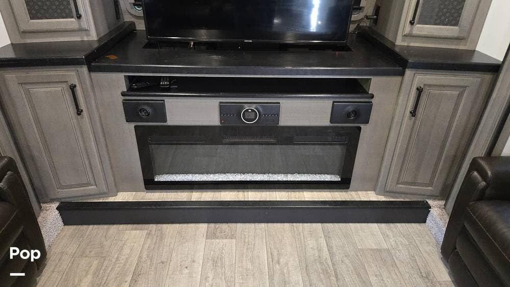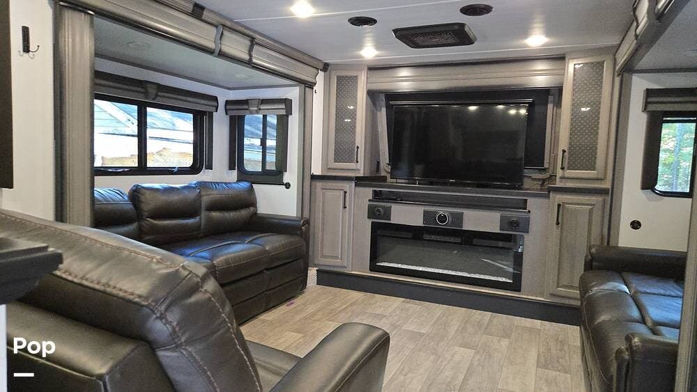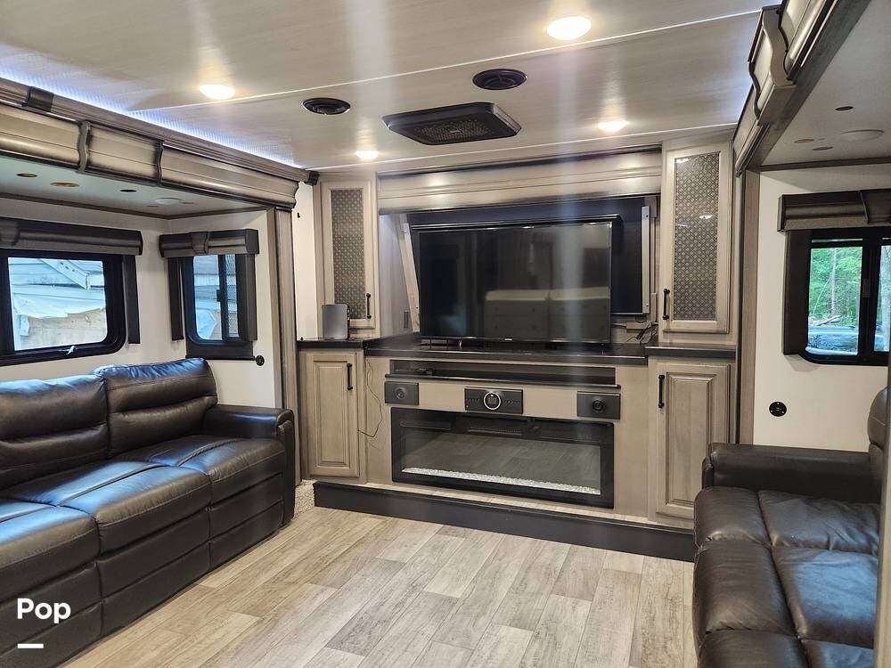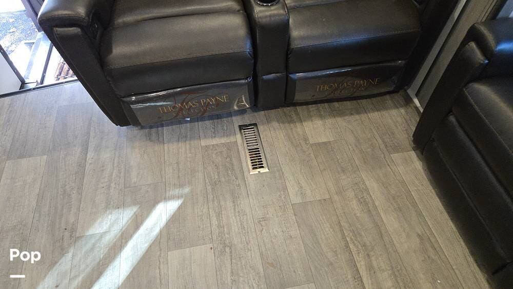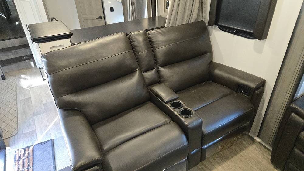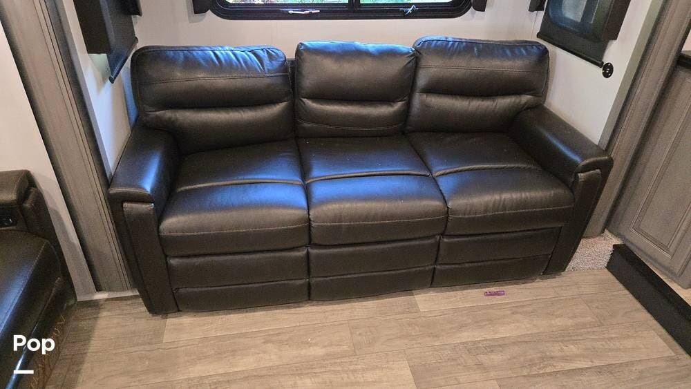 The front-living layout sets the stage for upscale RV life: when you enter, you'll find a full entertainment setup, opposing sofa slides, with theater-style reclining seats and a sizeable Smart TV,