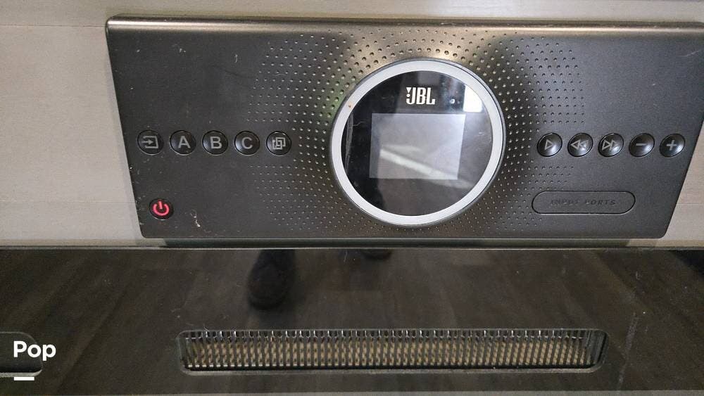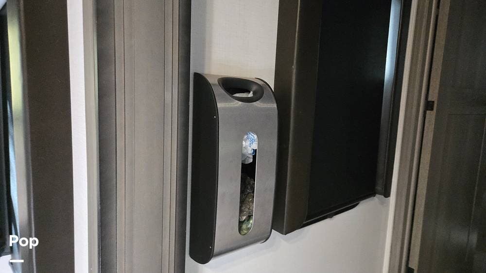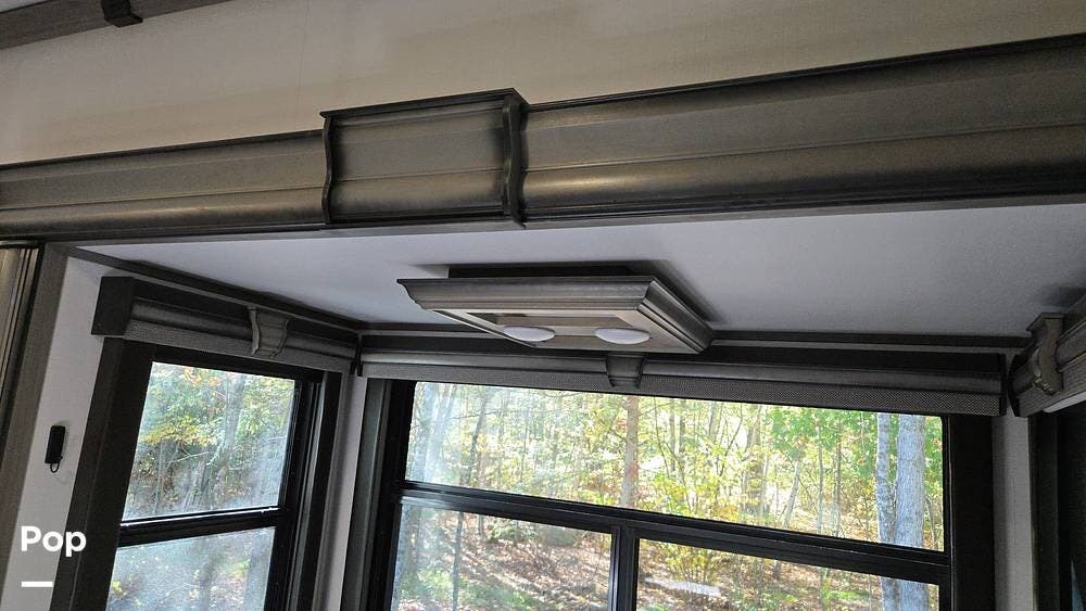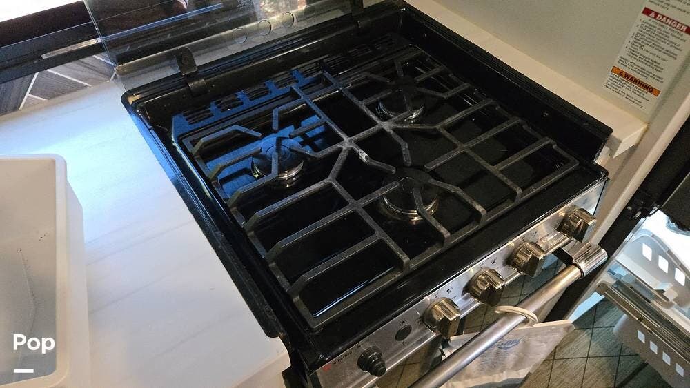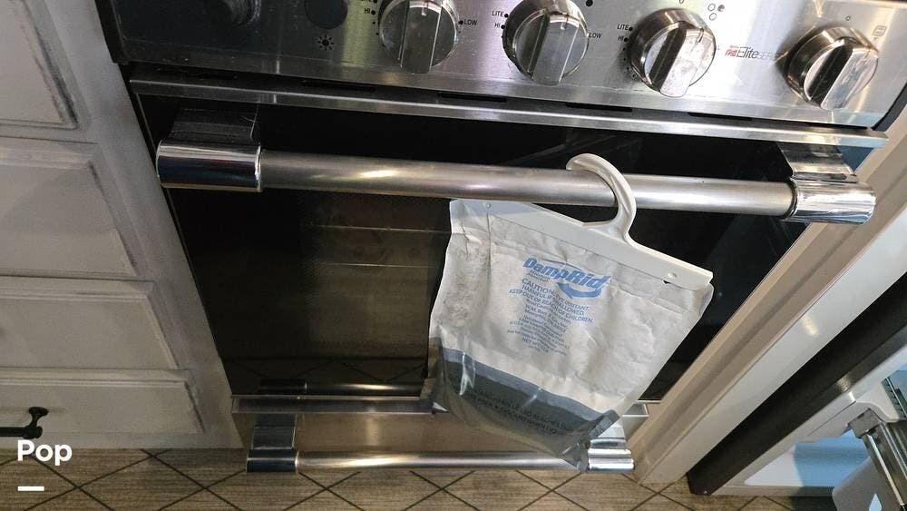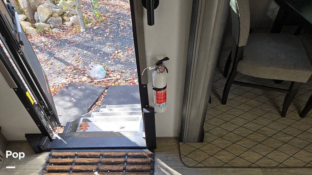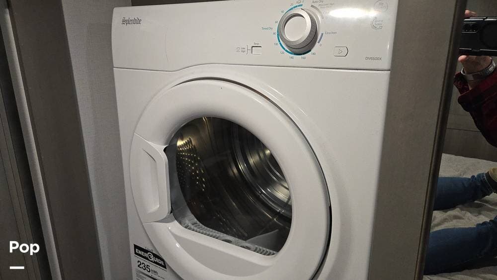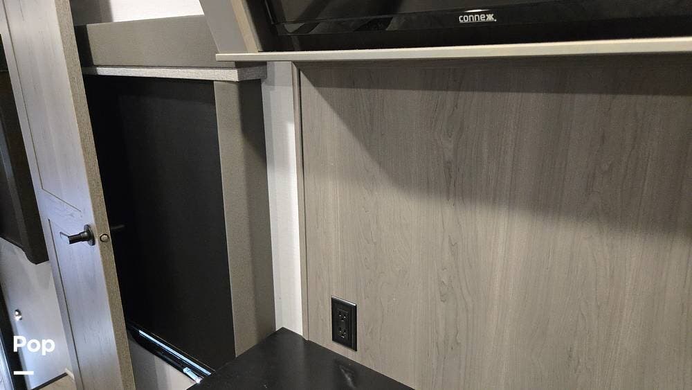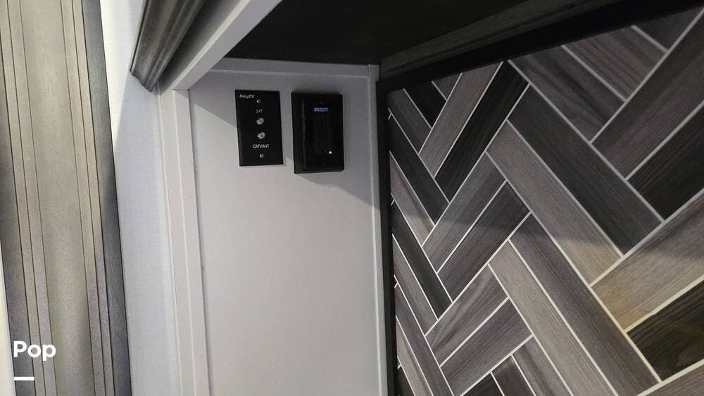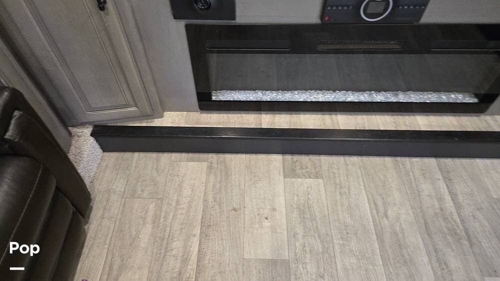 The front-living layout sets the stage for upscale RV life: when you enter, you'll find a full entertainment setup, opposing sofa slides, with theater-style reclining seats and a sizeable Smart TV,