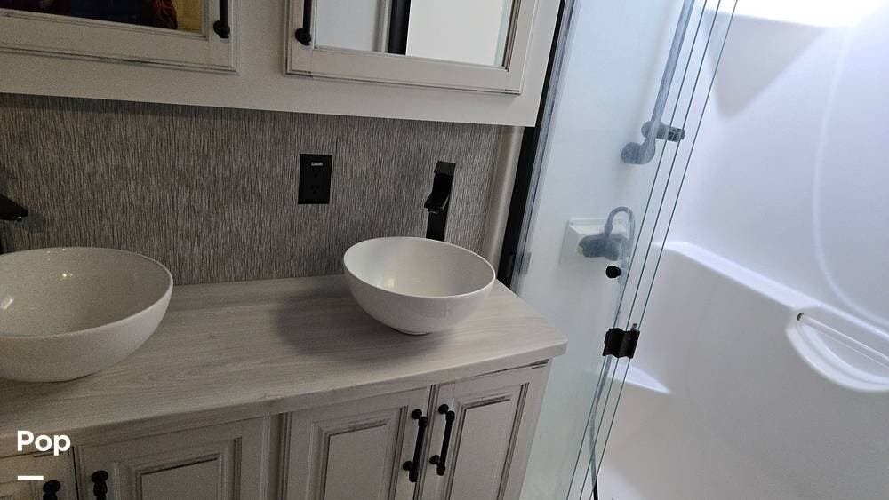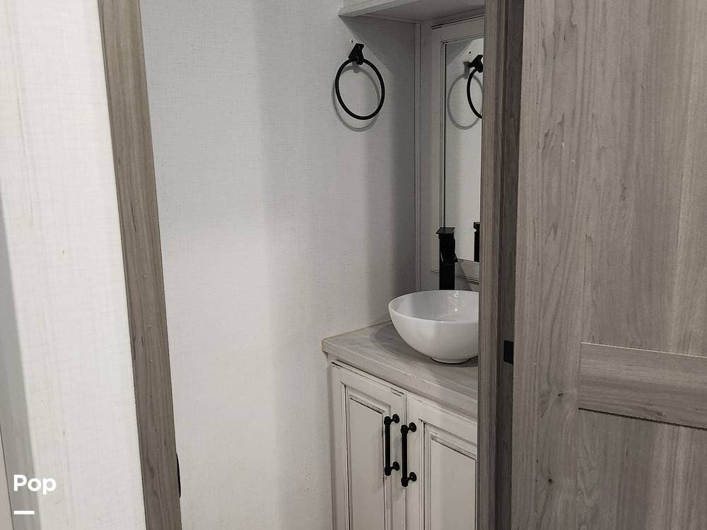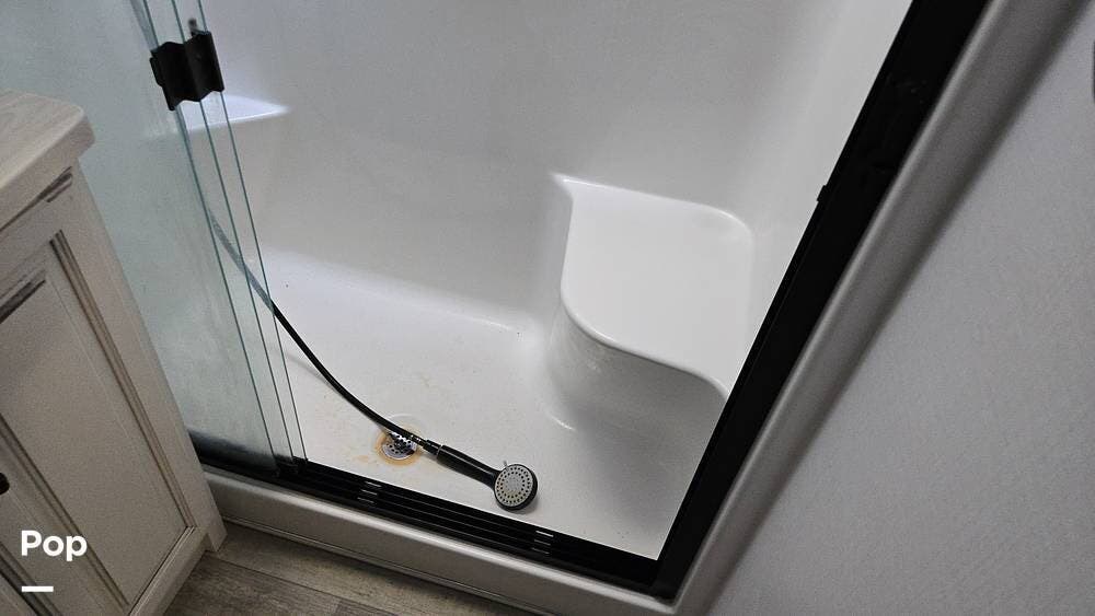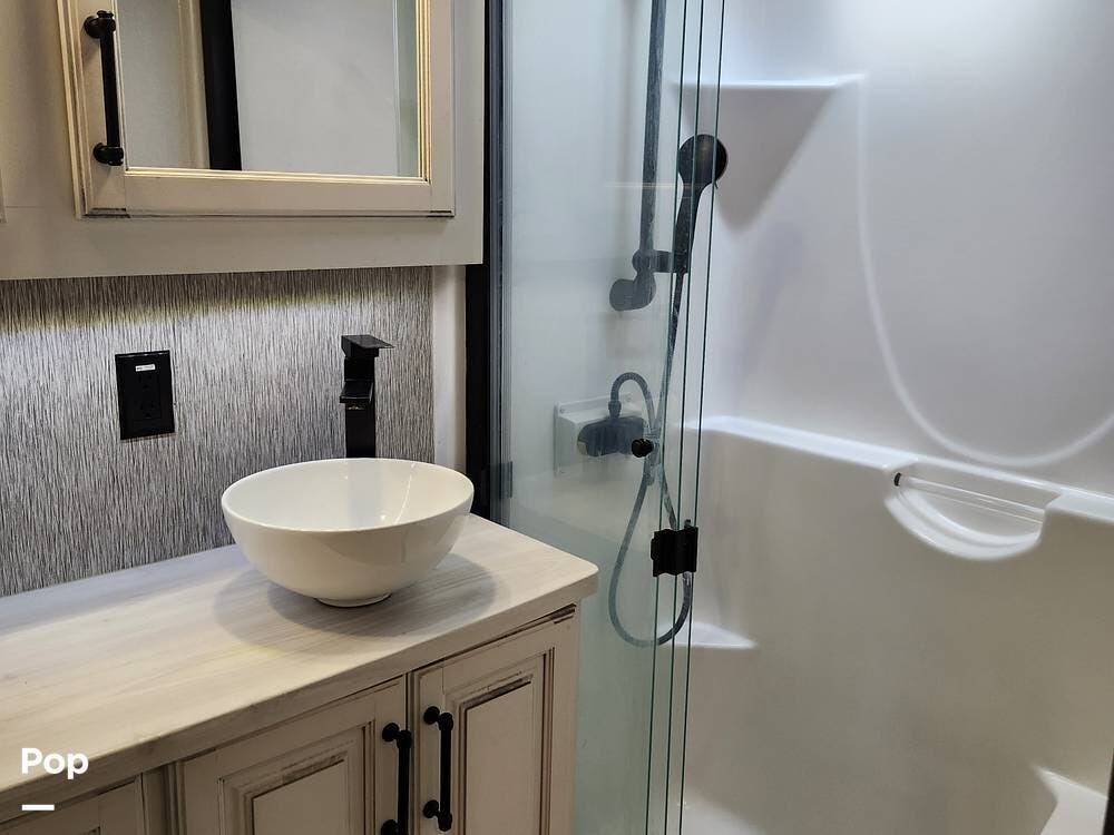 The bath-and-a-half floor plan gives you a spacious rear bathroom with a 48″ x 30″ fiberglass shower with seat, dual-sink vanity, and barn-door access from the bedroom, plus a convenient half-bath in the living/kitchen area for guests.