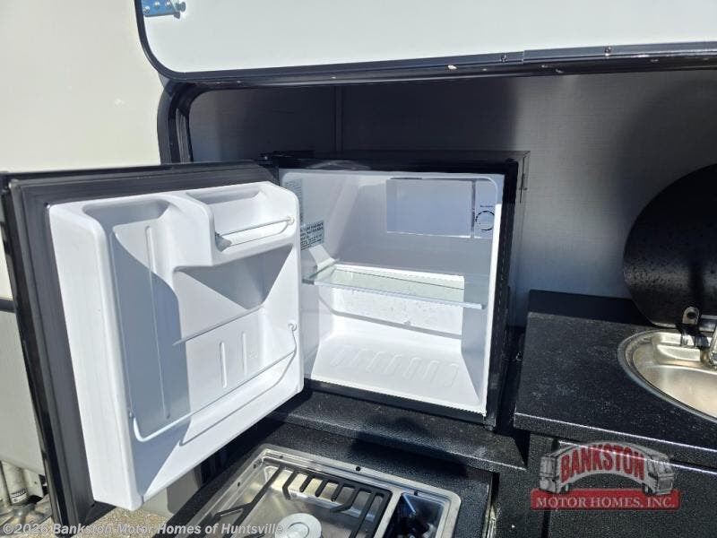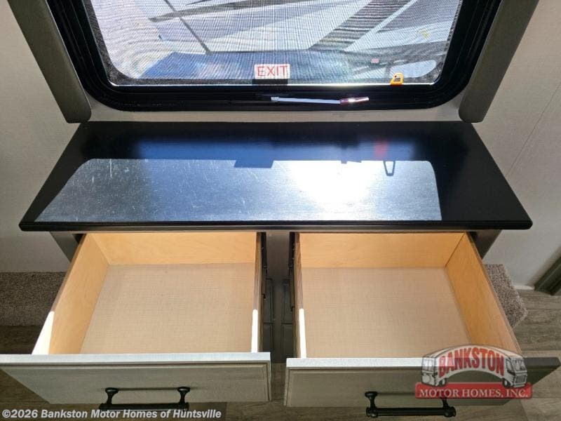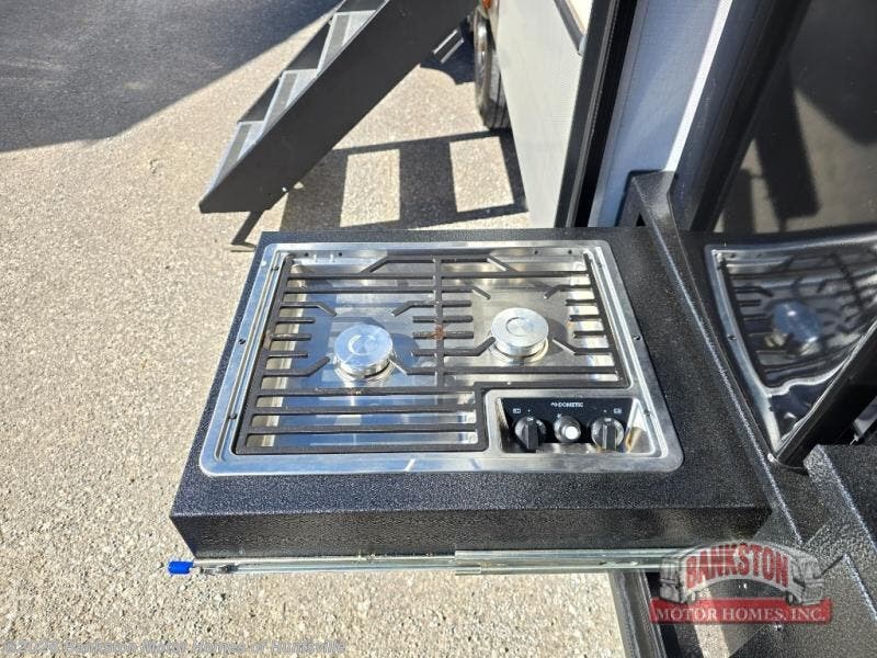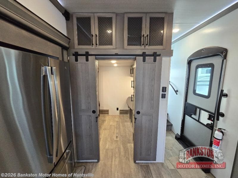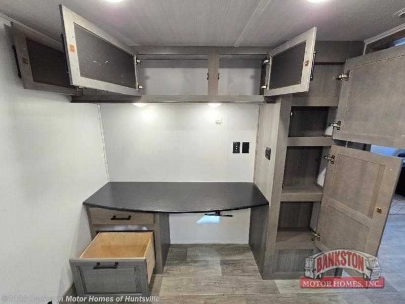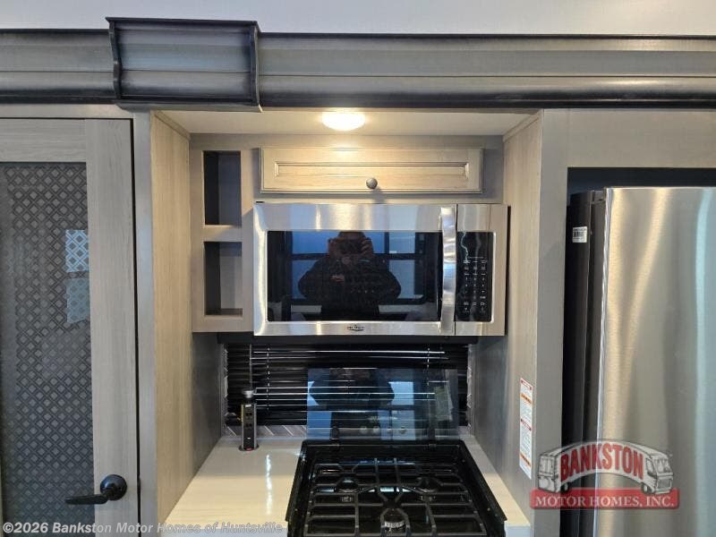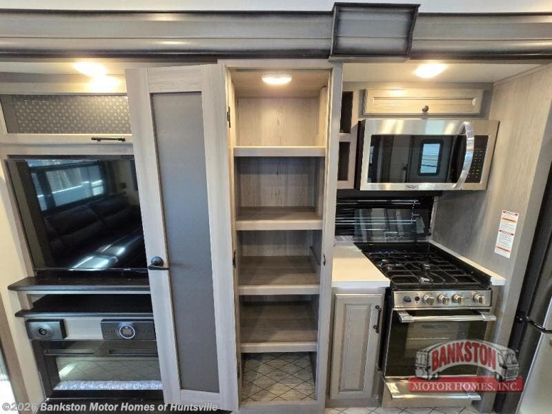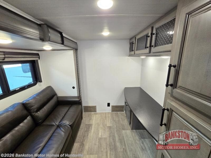 Everyone will have a comfortable place to sleep with two bedrooms in this fifth wheel! The front private bedroom has a king bed slide with storage underneath, a dresser with a 32" LCD HDTV, and a large front closet with a clothing hamper and an area prepped to add the optional stackable washer and dryer. The bonus room/middle den has a hide-a-bed sofa across from a desk so you can get some work done while you're away, plus a loft area/attic space above it all with a ladder to access it. The full bathroom has a 48" x 30" fiberglass shower with a seat and skylight above and a linen closet to keep your towels close. The chef can prepare delicious home cooked meals for everyone either indoors with the glass top range or at the outdoor kitchen with a two burner cooktop and refrigerator to keep your drink nice and cold!