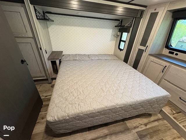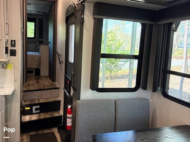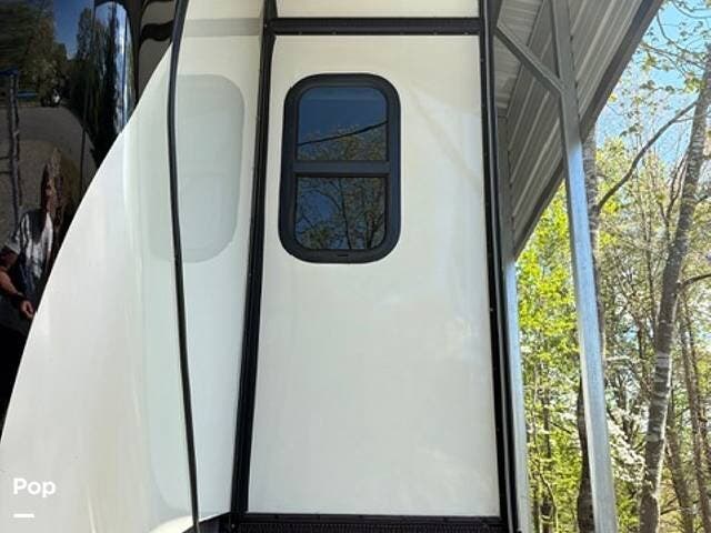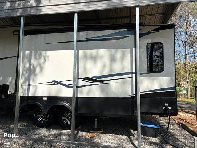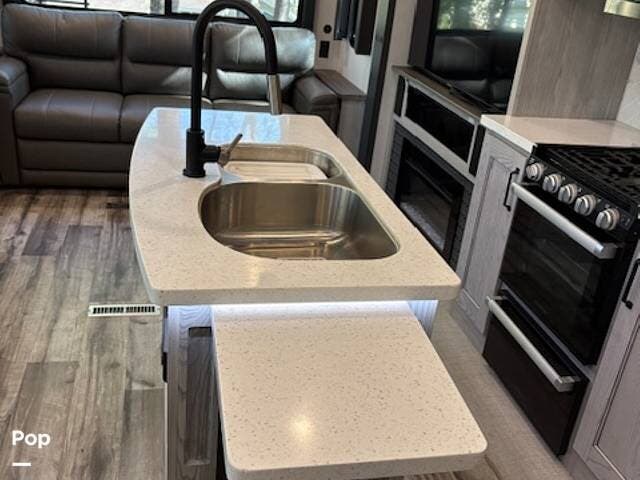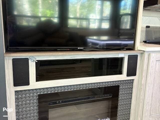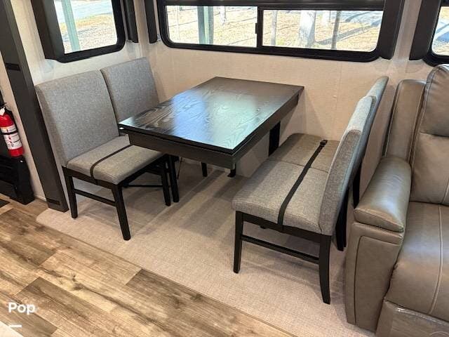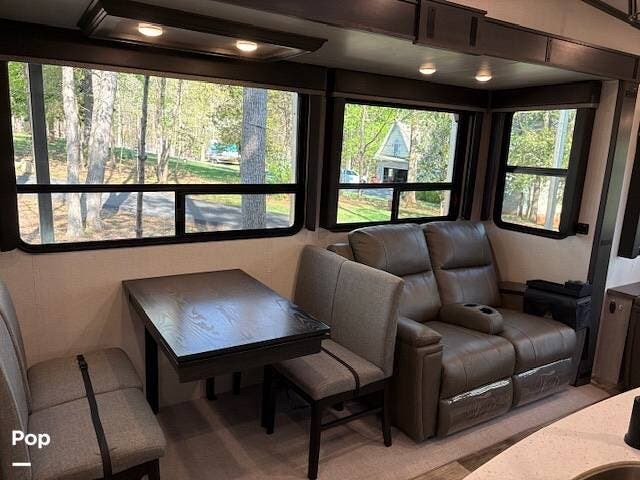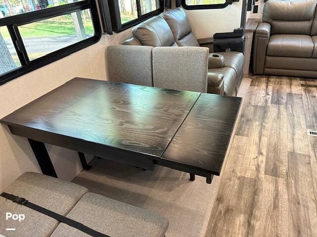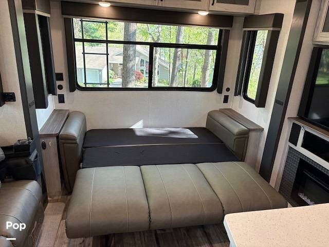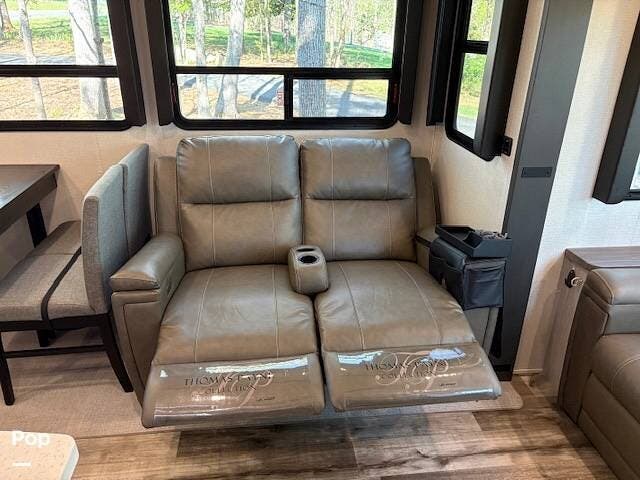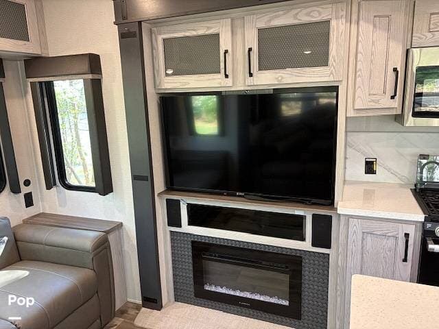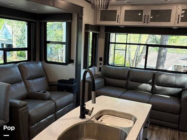 This fifth wheel truly feels like home. The rear living layout provides an open environment with theater seating, a new designer fireplace, and expansive panoramic windows. It's perfect for unwinding in comfort or entertaining guests with ease.
