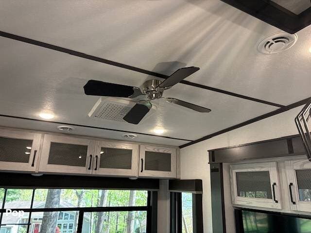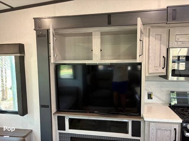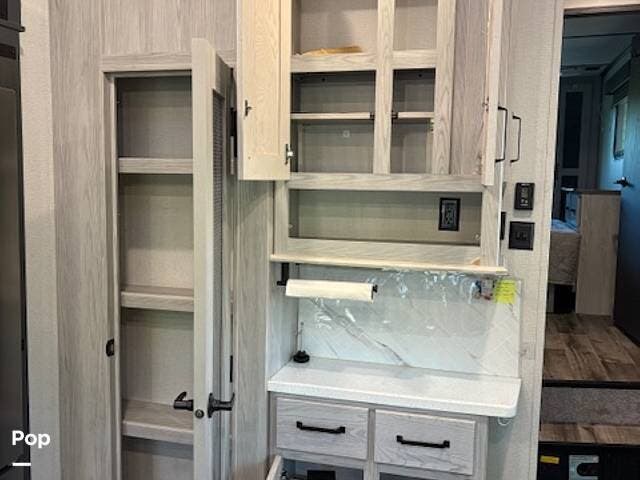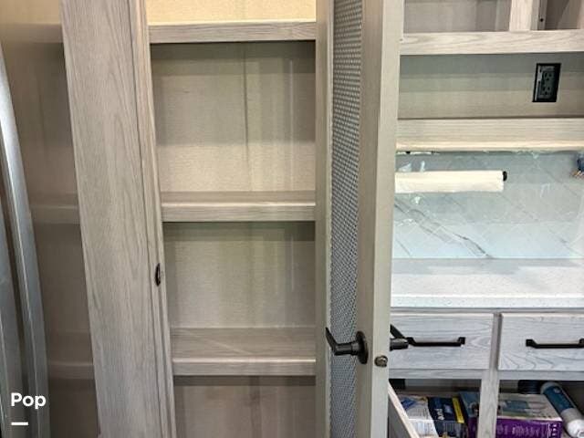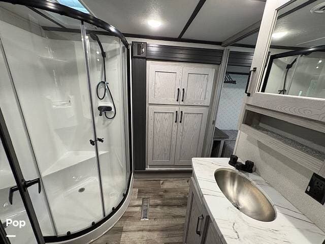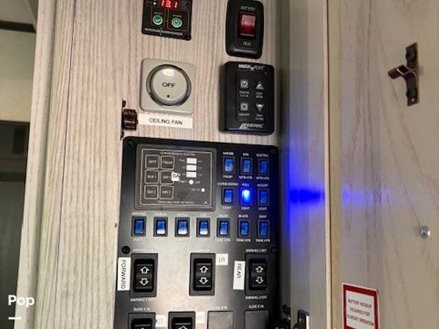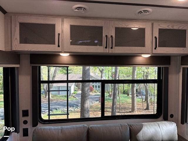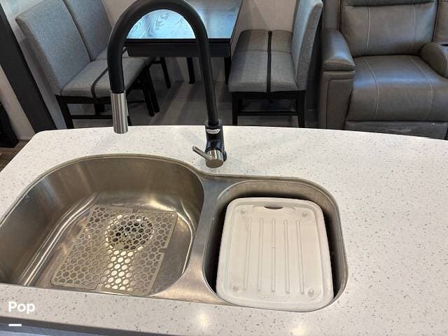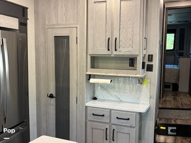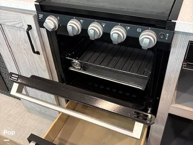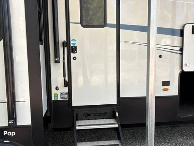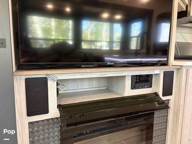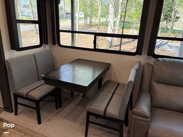 This fifth wheel truly feels like home. The rear living layout provides an open environment with theater seating, a new designer fireplace, and expansive panoramic windows. It's perfect for unwinding in comfort or entertaining guests with ease.