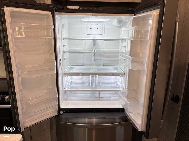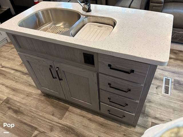 At the heart of the coach, the spacious, chef-inspired island kitchen features hardwood cabinets, solid-surface countertops, and premium stainless appliances, including a residential refrigerator and a Furrion 24'" stove. You'll also appreciate the central vacuum system!