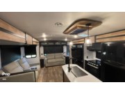 Step inside to a farmhouse-inspired interior that feels like home. The rear living area features plush seating, perfect for relaxing after a day outdoors. It flows into a modern kitchen with a large island, dual 12-volt RV refrigerators, and a cozy booth dinette. The master bedroom, with its king-sized bed in a dedicated slide, offers ample storage, including a wardrobe prepped for a washer/dryer combo, so you can travel without sacrificing convenience.