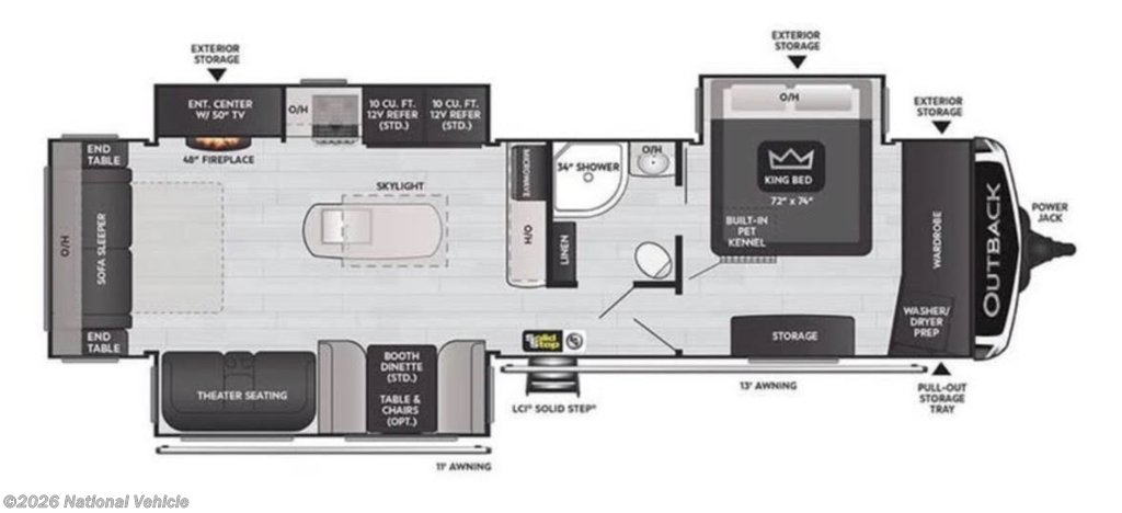 Built for durability and extended-season camping, this Outback features laminated fiberglass sidewalls, a fully walkable roof, heated enclosed underbelly, and a reinforced frame construction system. Dual power awnings with LED lighting, exterior speakers, and generous pass-through storage make outdoor living just as comfortable as the interior.