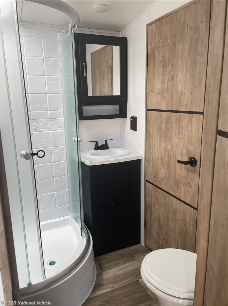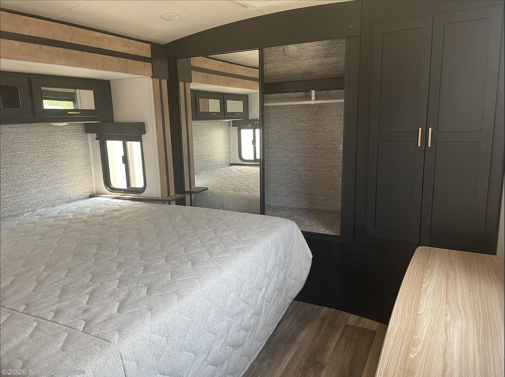 Step inside and you?re welcomed by tall arched ceilings, panoramic windows, hardwood cabinetry, and modern designer finishes. The spacious rear living area is built for relaxation and entertaining, featuring plush theater seating, a free-standing dinette, and a stunning entertainment center complete with a 50" HDTV and electric fireplace, creating a warm, residential atmosphere wherever you travel.