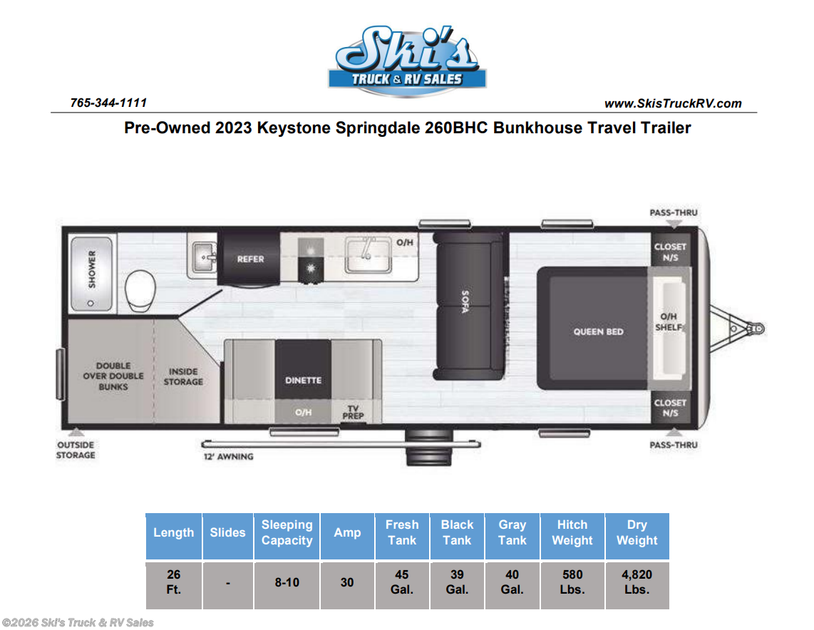 Pre-Owned 2023 Keystone Springdale 260BHC Bunkhouse Travel Trailer; 26 Foot; Sleeps 8-10; Hitch Weight: 580 Lbs.; Dry Weight: 4,820 Lbs.; 30 Amp; Manual Tongue Jack; Manual Stabilizer Jacks; 45 Gal. Fresh Water Cap.; 39 Gal. Black Water Cap.; 40 Gal. Gray Water Cap.; Two 20 Lbs. Propane Tanks with Outside Propane Port; 13,500 BTU AC; 30,000 BTU Furnace; 10 C.F. 12V Refrigerator; On Demand Propane Water Heater; Microwave; 2-Burner Stove; One TV Jack; Booth Dinette; Jack-knife Sofa; Queen Bed; Double Bunks; One Bathroom with Shower; 12 Foot Power Awning with LED Lights; Exterior Storage; Spare Tire; Battery Disconnect; Screen Def.; Screenshot; As-Is; Small Dent in Metal (Rear); Financing Available; Nice Pre-Owned Bunkhouse Travel Trailer for the Price: $11,995. Call 765-344-1111 or visit us online at for more information and photos.
