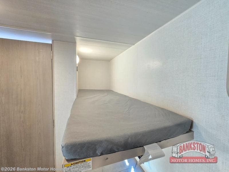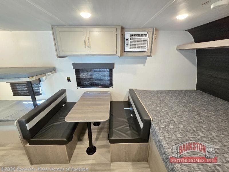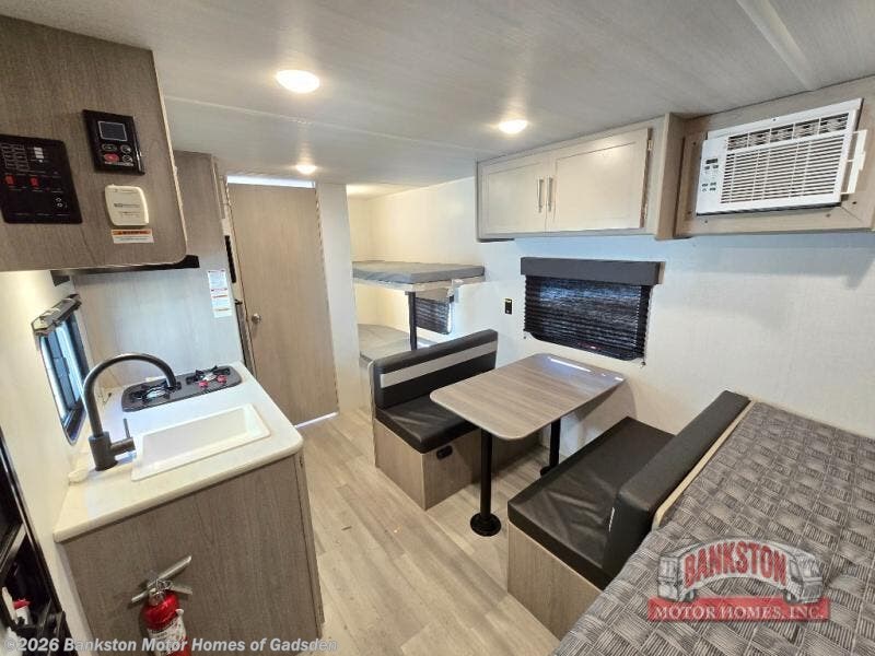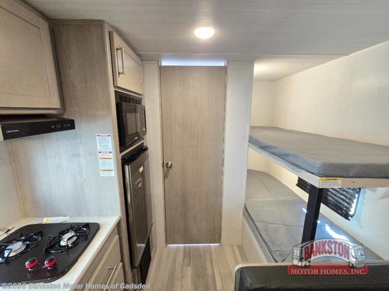Get ready for outdoor fun with your favorite people when you have this trailer in tow! Once at your campsite, you can easily setup the 10' power awning, grab your camping chairs from the pass-through storage, and relax or start playing. The cook will love the galley kitchen with the two burner cooktop, plus the pantry and 6 cu. ft. refrigerator to stow away all the food. If you like, you can eat inside at the booth dinette which doubles as sleeping space, and of course the kids will love the bunk beds next to the full bathroom. And you will sleep like a queen up front.
