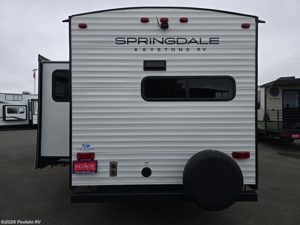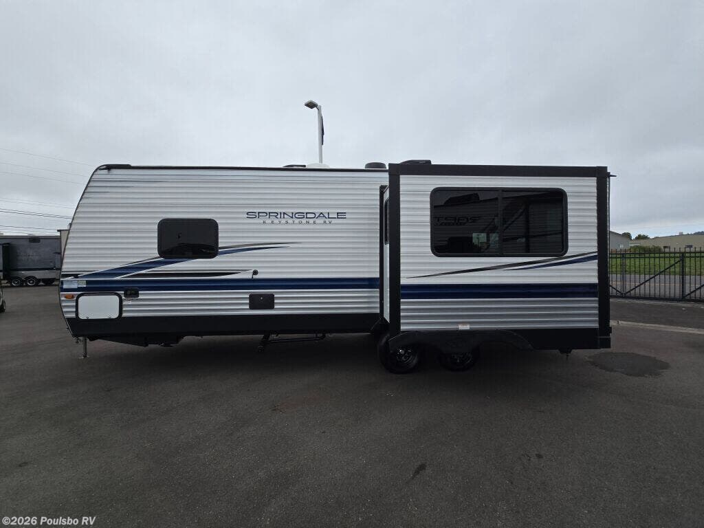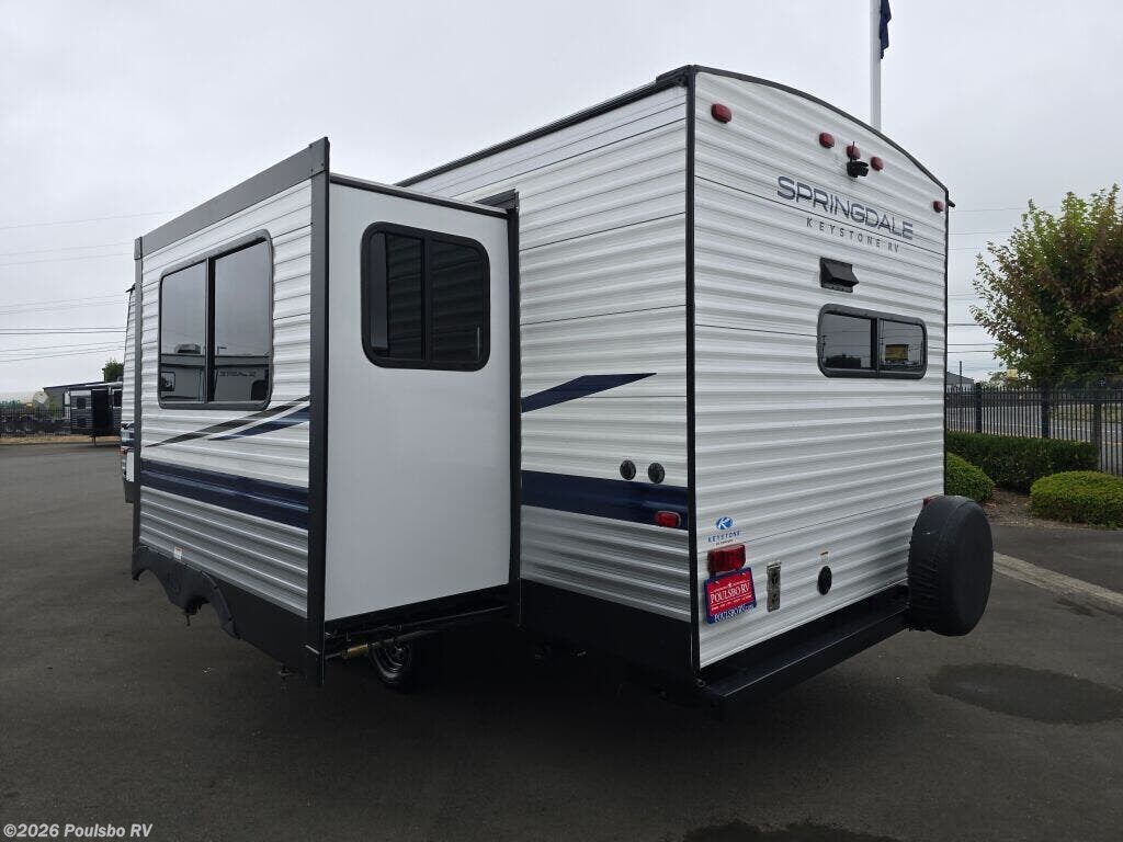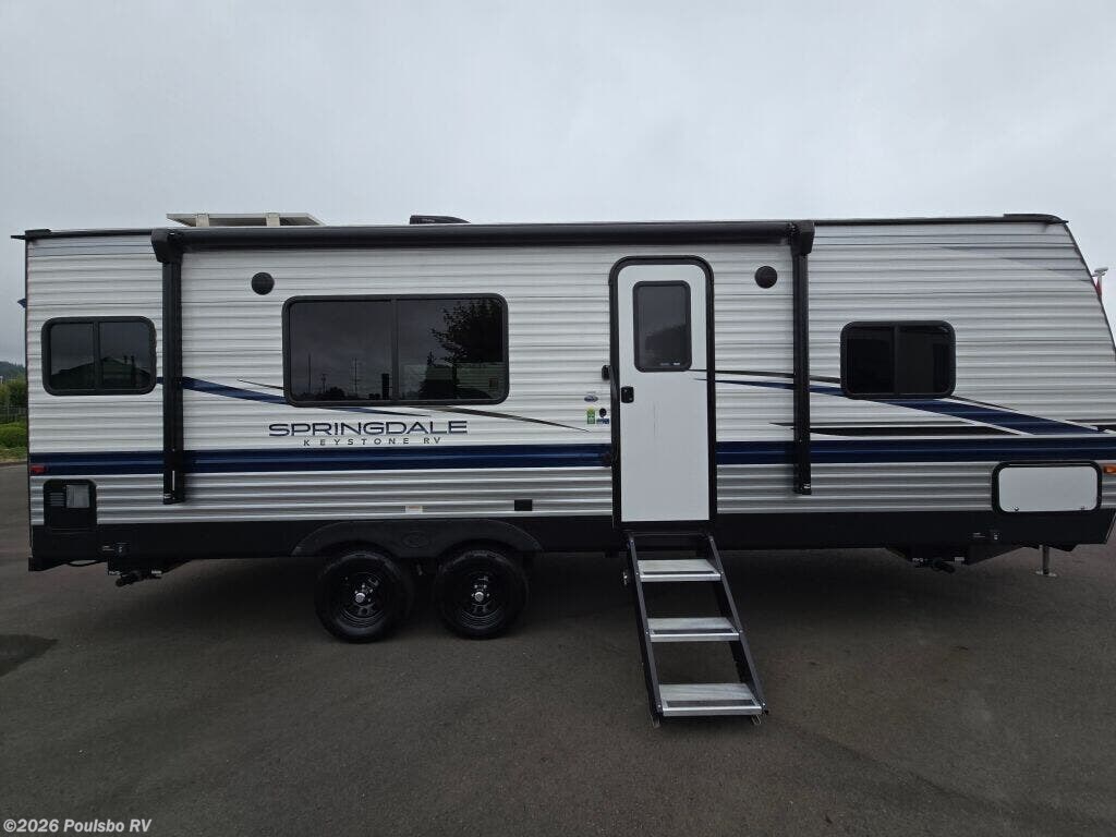 Introducing the 2023 Keystone Springdale 242RKWE, a well-crafted travel trailer that offers both comfort and efficiency for your RVing adventures. This unit is perfect for families or groups seeking a cozy escape with a sleeping capacity of six. Designed with a length of 28.54 feet, it strikes a balance between spacious living areas and easy maneuverability. In good condition, this used RV is ready to hit the road and create memories. The living area is thoughtfully designed to ensure relaxation and enjoyment, featuring a slide-out that enhances the interior space, providing room for family gatherings or peaceful evenings. This travel trailer comes equipped with front and rear power leveling jacks, which make setup at your campsite a breeze. The 5827-pound dry weight combined with a hitch weight of 730 pounds facilitates easy towing, allowing you to experience the great outdoors without the hassle. Inside, the layout accommodates various living situations, making it an ideal choice for adventurous families. With smart storage solutions and convenient amenities, this trailer maximizes space for all your travel essentials. Take advantage of a well-equipped kitchen area for meal preparation while enjoying modern comforts, making it feel just like home on the road. As a family-owned, award-winning local RV dealer with multiple locations in Sumner, Everett, Kent, and Mt. Vernon Washington, Poulsbo RV is here to help you find the perfect RV. Stock#: CC5261, VIN: 4YDTSGL27PG101175.