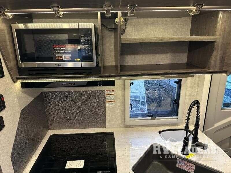 You can take the whole family to a new location with this Lance travel trailer! This trailer has space to sleep eight people with the help of the front queen bed, the U-shaped dinette, and the set of double-size bunks. You'll also have an easy time feeding everyone when you add the optional exterior kitchen because it will give you two kitchens to use. Now you can grill chicken outside and make quick meals inside in the stainless steel microwave. A large slide keeps the interior comfortable with enough space to walk from the front to the back, and the full bathroom is right next to the bunks for late-night bathroom breaks.