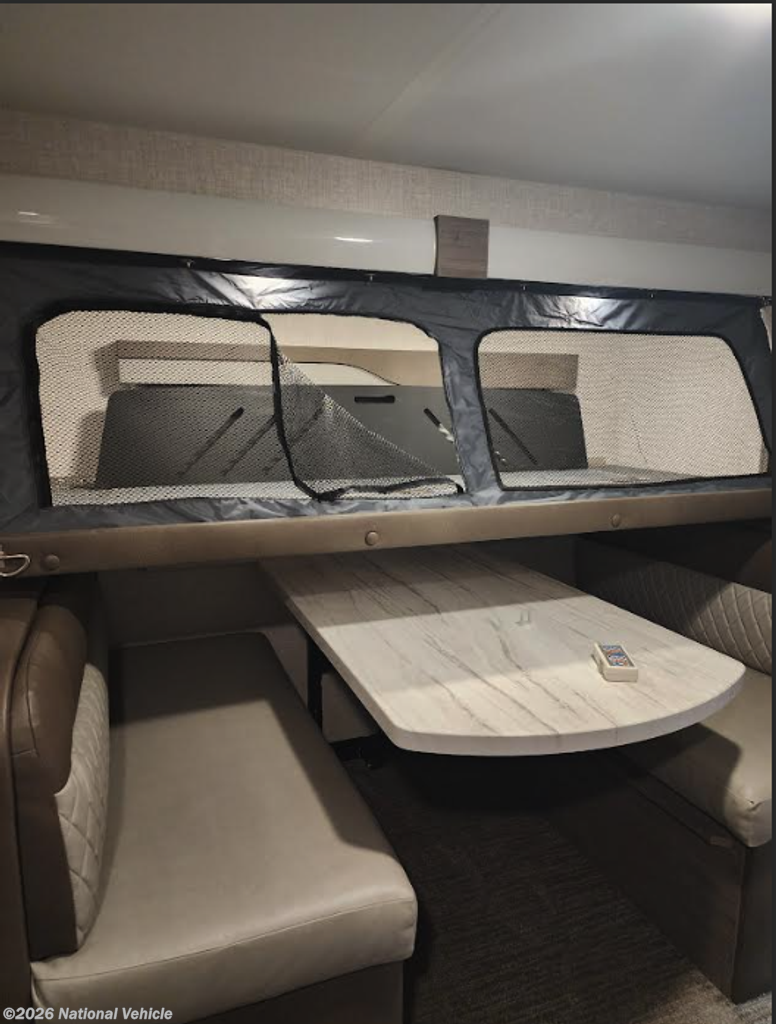 The slideout allows for a facing bench dinette that accommodates four people while converting into a bed that sleeps two. Plus, fold down bunk / mattress.
