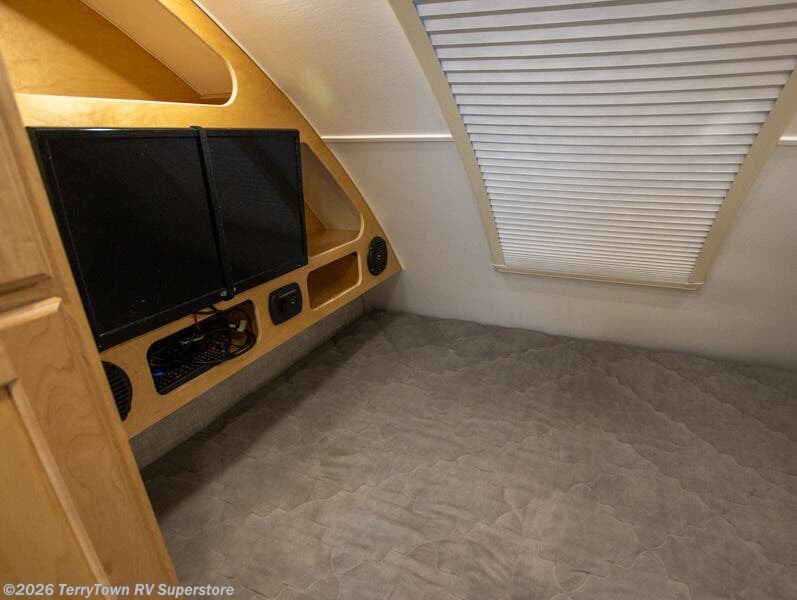 This Little Guy teardrop trailer has an impressive 6' 7" interior height, so even though your trailer is little, you don't have to be little to enjoy it. The large pass-through storage compartment gives you more space to bring along extra gear, and the 2" rear receiver can hold bike racks or storage racks. The exterior entertainment center comes with a TV mount, two 5" outdoor speakers, and HDMI, Coax, and power outlets. The kitchen has a microwave and two-burner stove, so you'll never go hungry, and the dinette can turn into a bed for one other person. If you add the optional Rough Rider Package, you can get 15" off-road tires and wheels and a 2.5" axle riser for added clearance.
