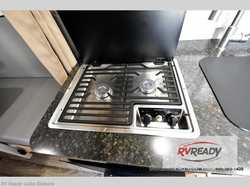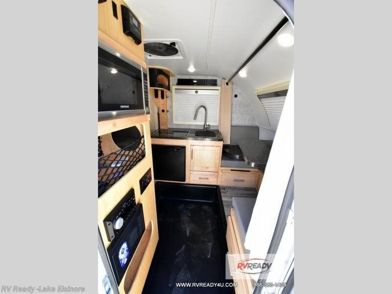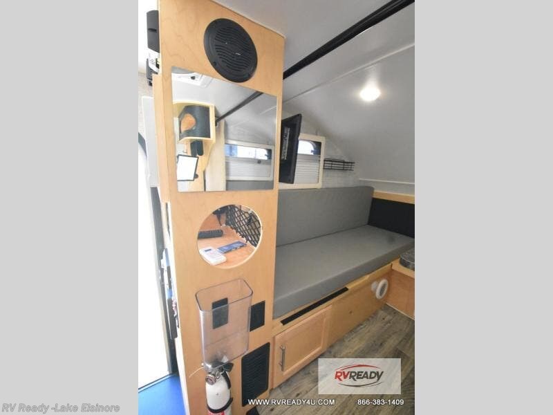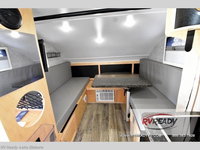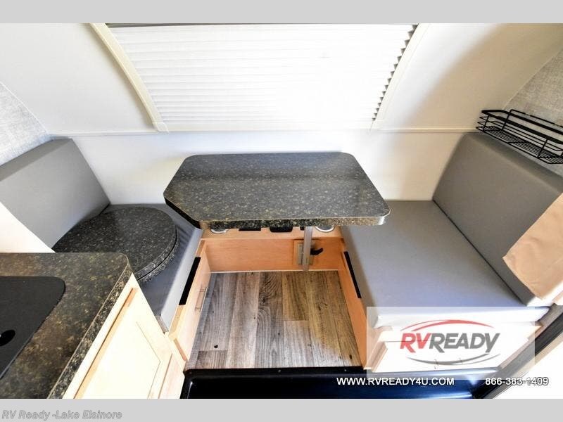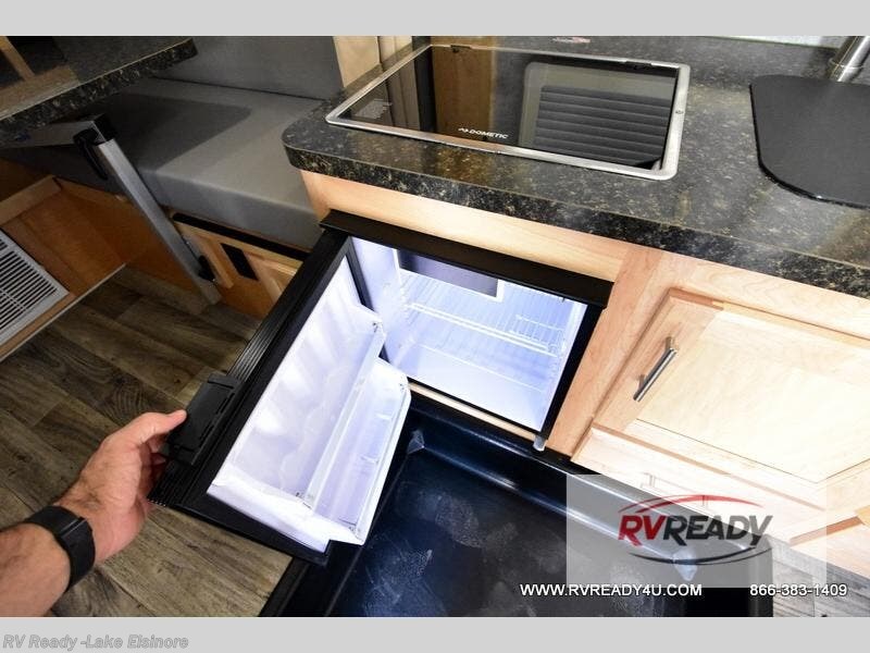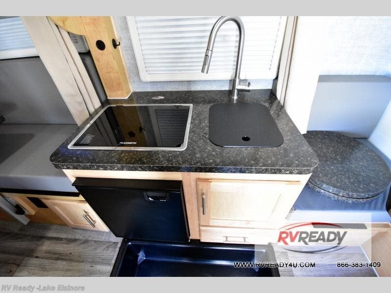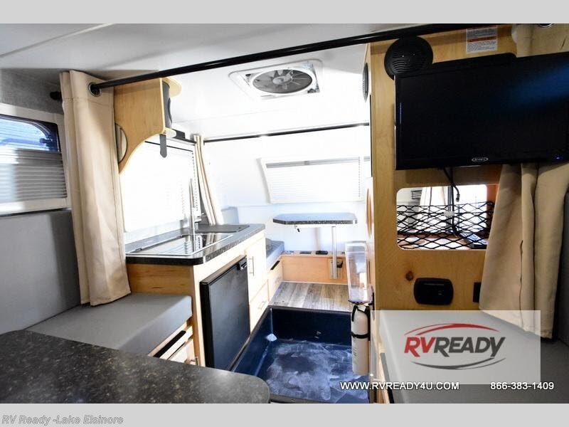 This Little Guy teardrop trailer can store away in your garage without any hesitation! With a dry weight starting at 1,860 lbs., you'll find no problem towing this trailer with your SUV or crossover, and the cozy yet spacious interior offers you 5' 9" of standing room. This trailer can sleep three adults, but it can also seat six adults for a night of fun. The floor-to-ceiling storage cabinet is beneficial for storing any items you want to bring along, and the well-equipped kitchen offers you a Contoure stainless steel microwave, a two-burner glass-top stove, and a 1.9-cubic foot Dometic absorption refrigerator.