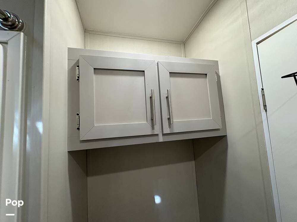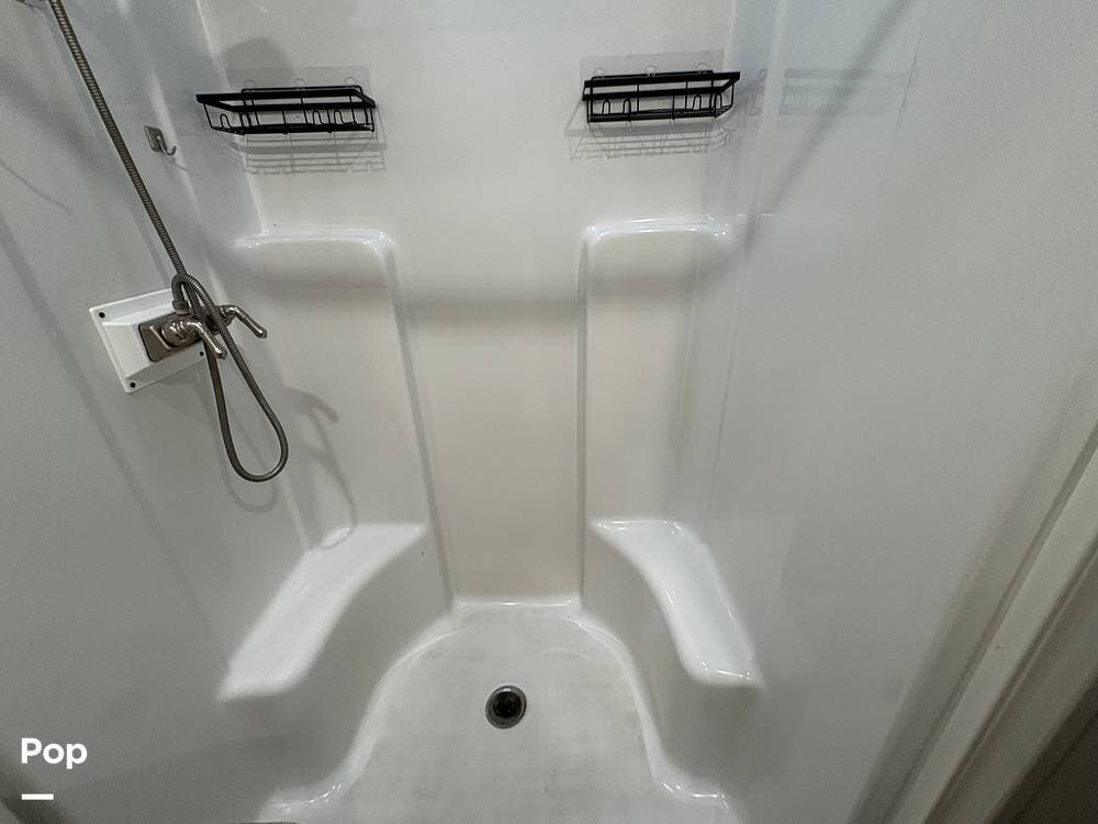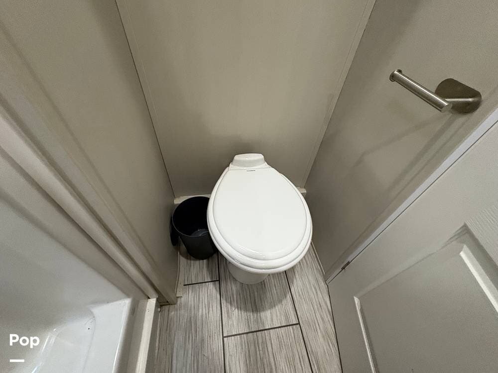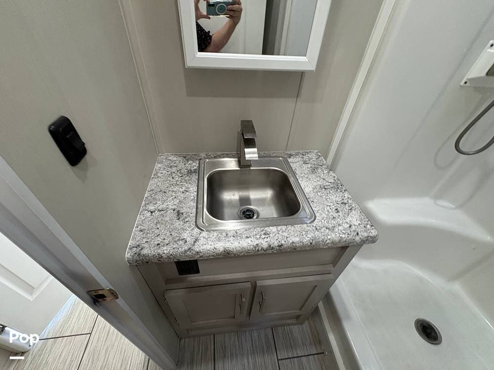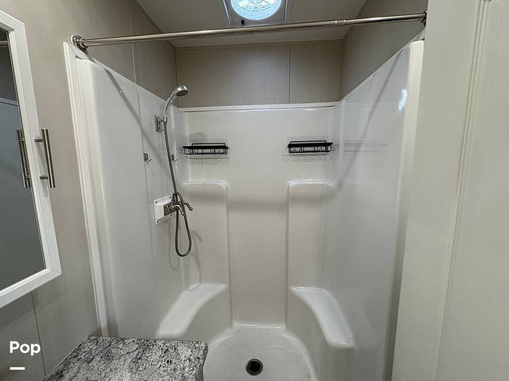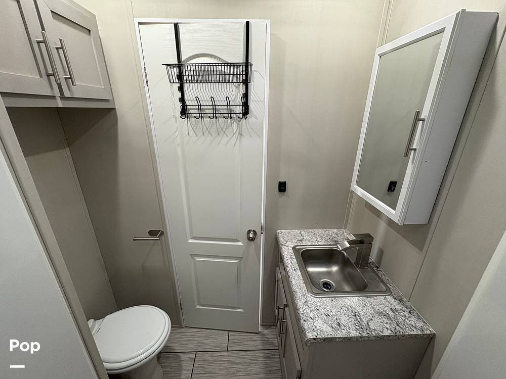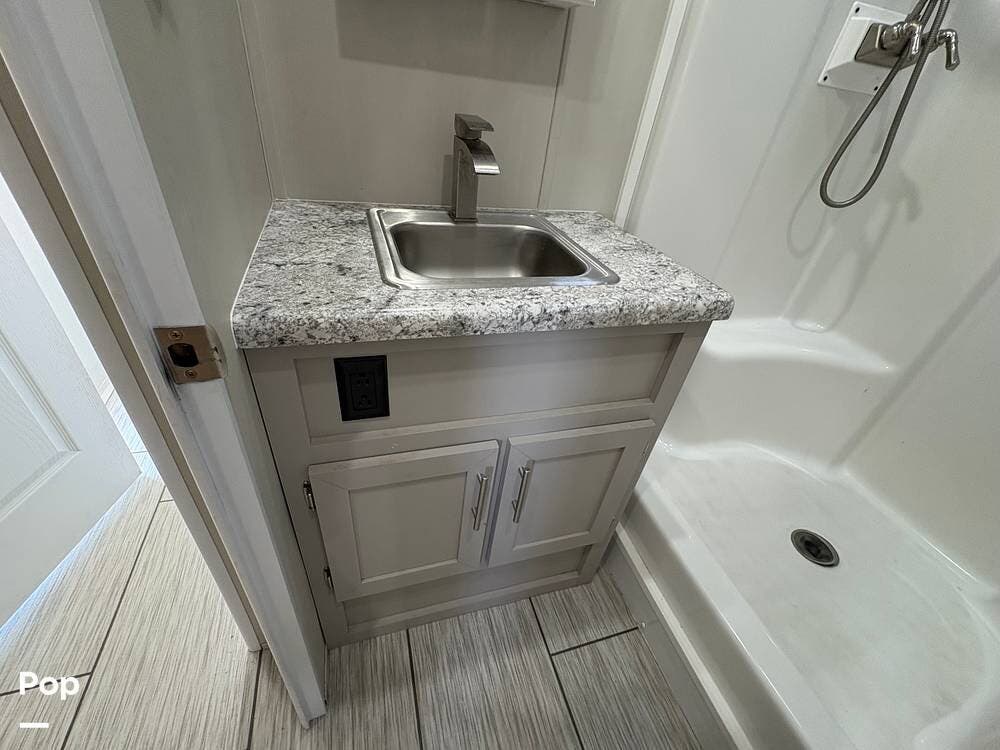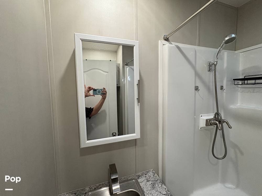 The full bathroom includes a shower, toilet, and vanity for everyday convenience. Modern finishes, LED lighting, and available upgrades such as enhanced insulation make this coach adaptable to your travel style.