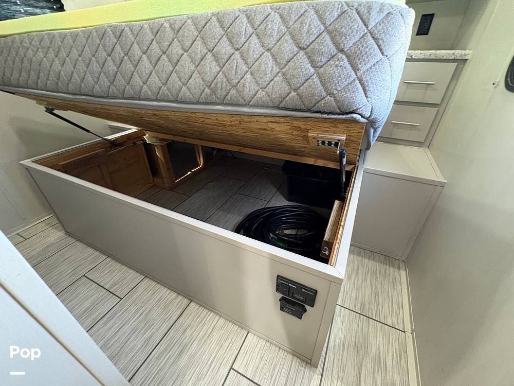 A private front bedroom with a walk-around bed, plenty of storage, and a TV provides a cozy retreat.