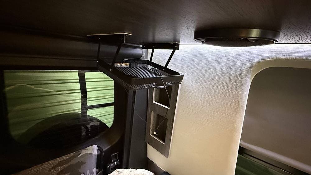 In the rear, the sleeping area offers flexibility and comfort with the power sofa system that converts into a full bed at the touch of a button. Surrounding cabinetry, reading lights, and USB charging ports make this space functional for both rest and relaxation. Integrated climate control keeps the cabin comfortable year-round, while the quiet lithium-ion power system enables extended off-grid use without a generator.