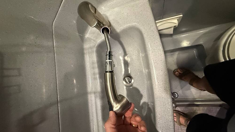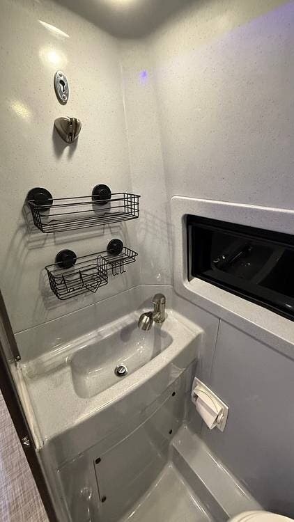 The bathroom is compact yet fully equipped with a wet bath design that includes a stainless-steel sink, toilet, and shower with a handheld sprayer. High-quality fixtures, solid-surface walls, and built-in storage contribute to a clean, modern look. A tankless water heater ensures you'll always have on-demand hot water for showers and kitchen use.