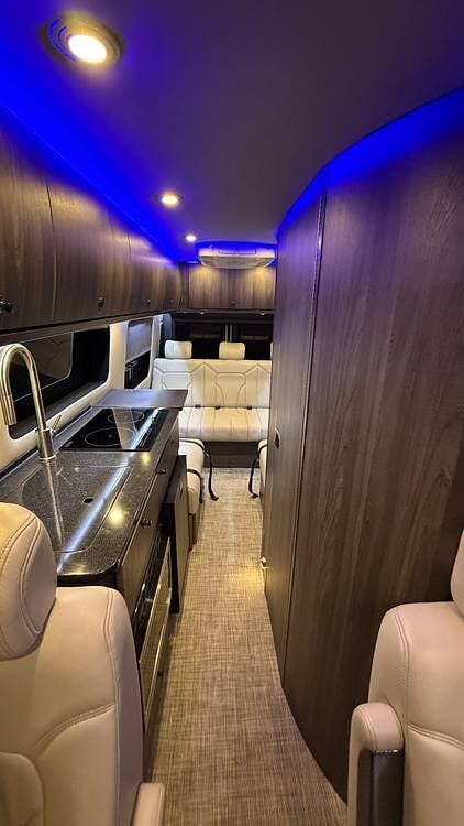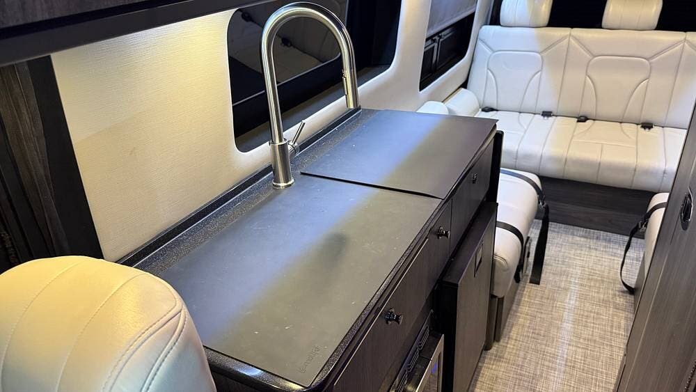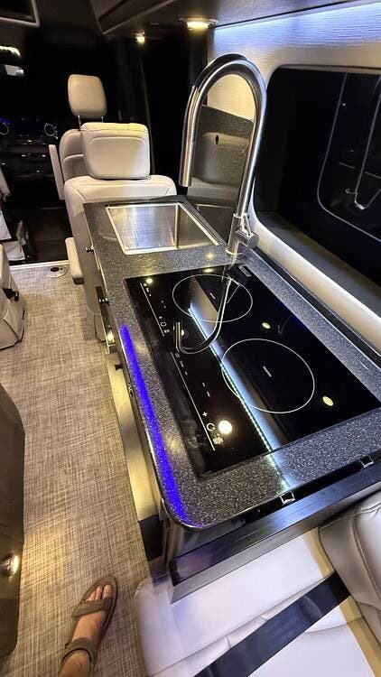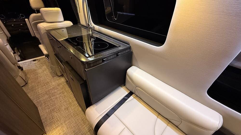 The kitchen area is designed for both style and practicality, featuring a solid-surface countertop, stainless-steel sink, dual-burner induction cooktop, and a convection microwave oven. A mini refrigerator with a freezer compartment provides storage for fresh ingredients, while overhead cabinets offer space for dishes and cookware. Thoughtful touches like under-cabinet lighting and a backsplash add to the residential feel, making it easy to prepare meals wherever your travels take you.