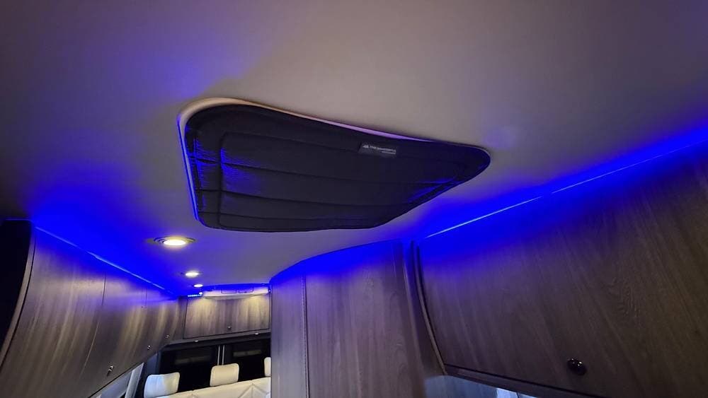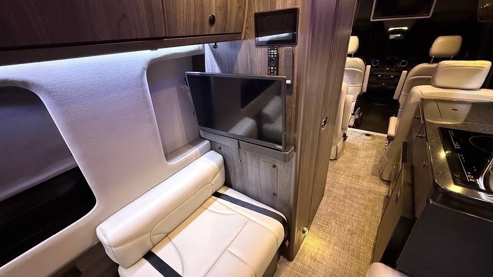 Beautiful hardwood cabinetry, LED accent lighting, and soft-touch walls create a refined atmosphere, while large windows and a power shade system provide both light and privacy. The multiplex control system allows you to manage lighting, temperature, and power functions from a single touchscreen or mobile device, ensuring effortless operation on the road.