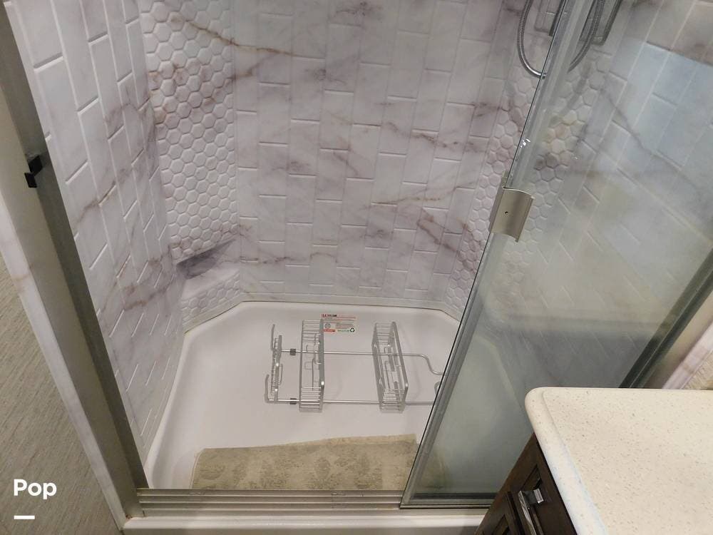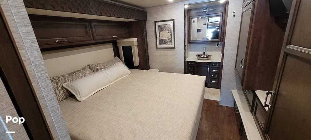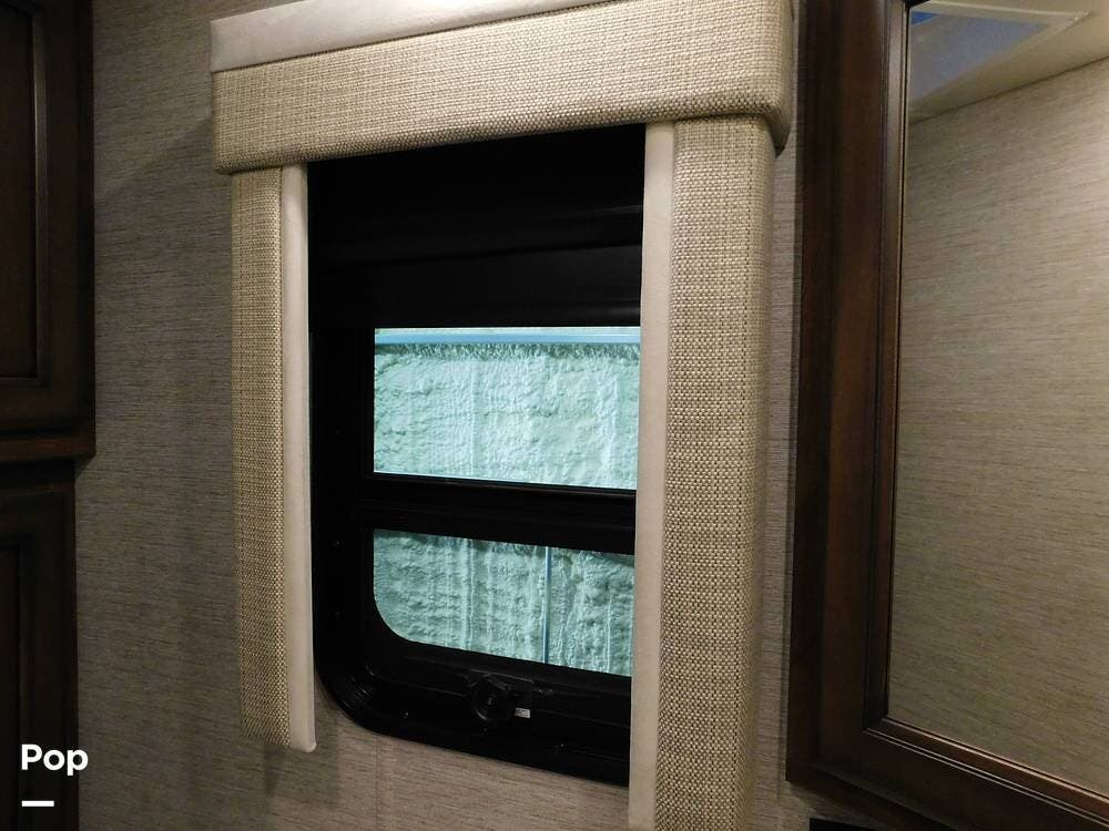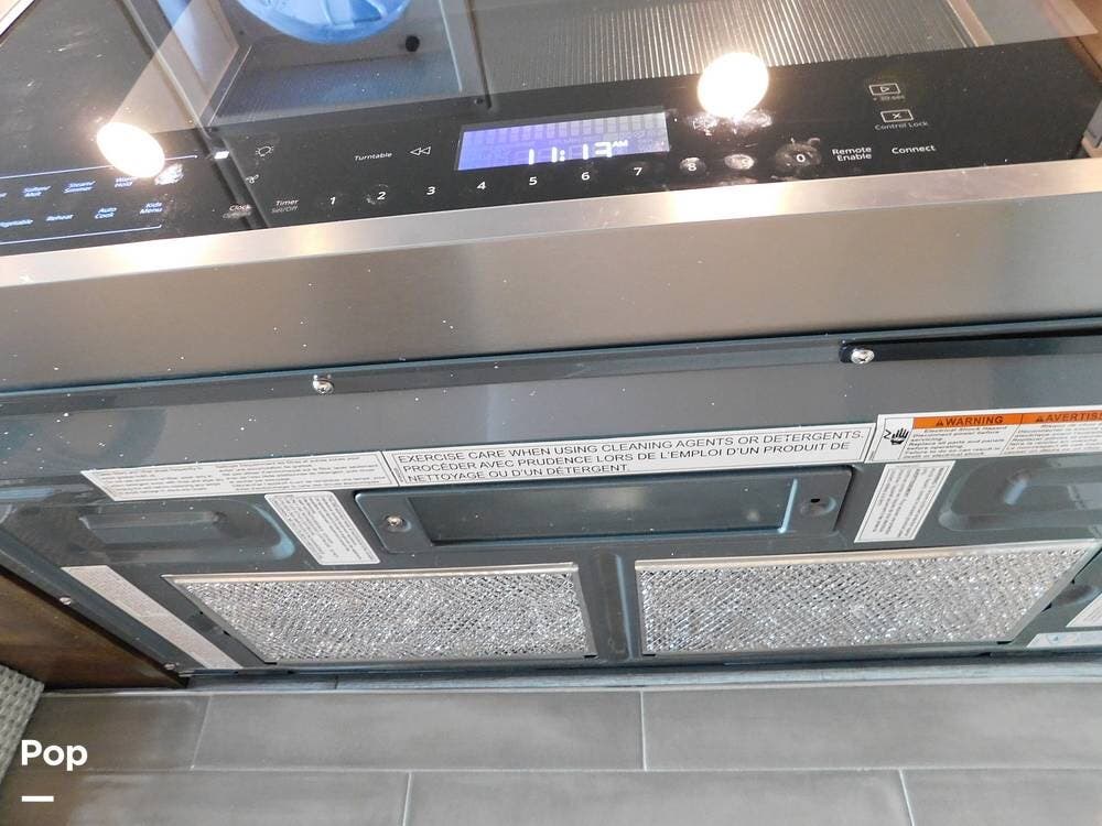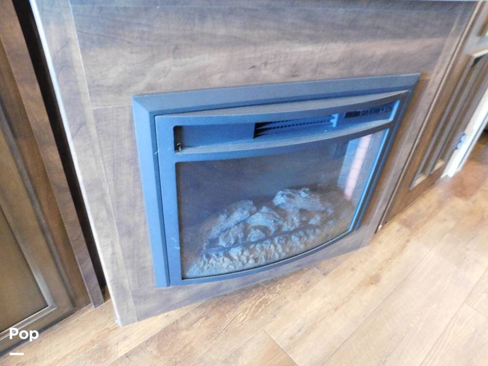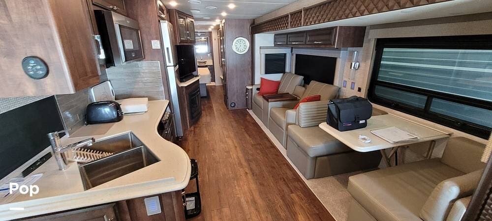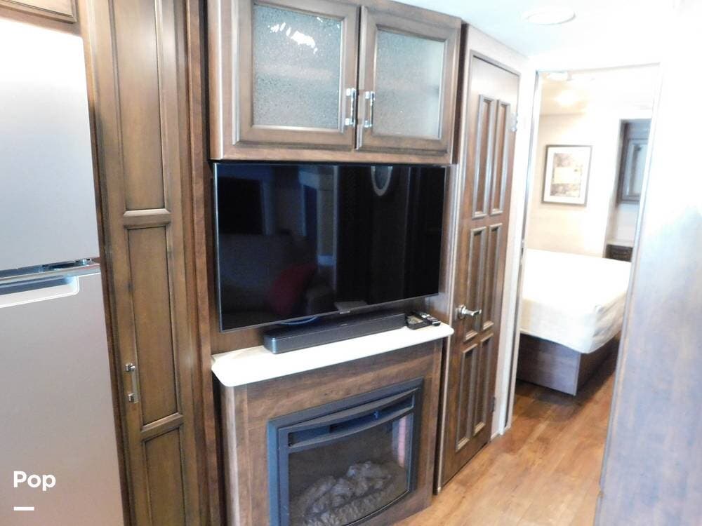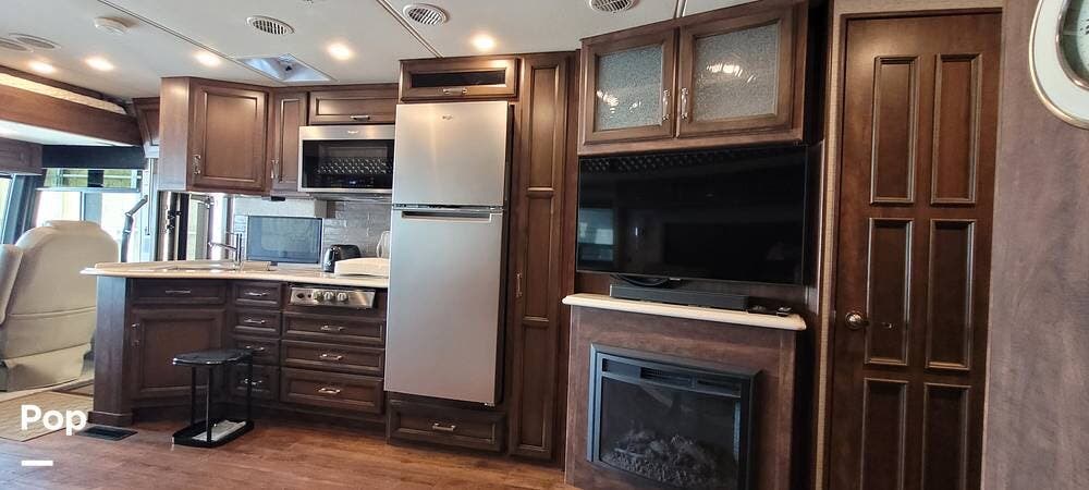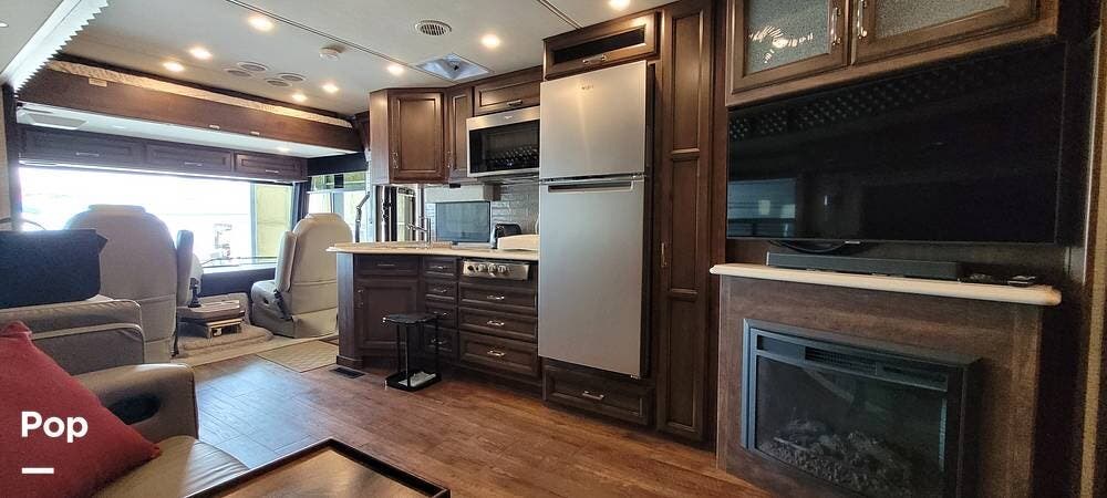 Inside, the Bay Star 3609 exudes a residential ambiance with carefully selected finishes and attention to detail. The main living area is designed for comfort and convenience, featuring theatre seating with a handmade black walnut TV tray, upgraded, larger fireplace, and a booth dinette that provides flexibility for dining or entertaining. Large panoramic windows flood the space with natural light while offering scenic views of the surroundings.