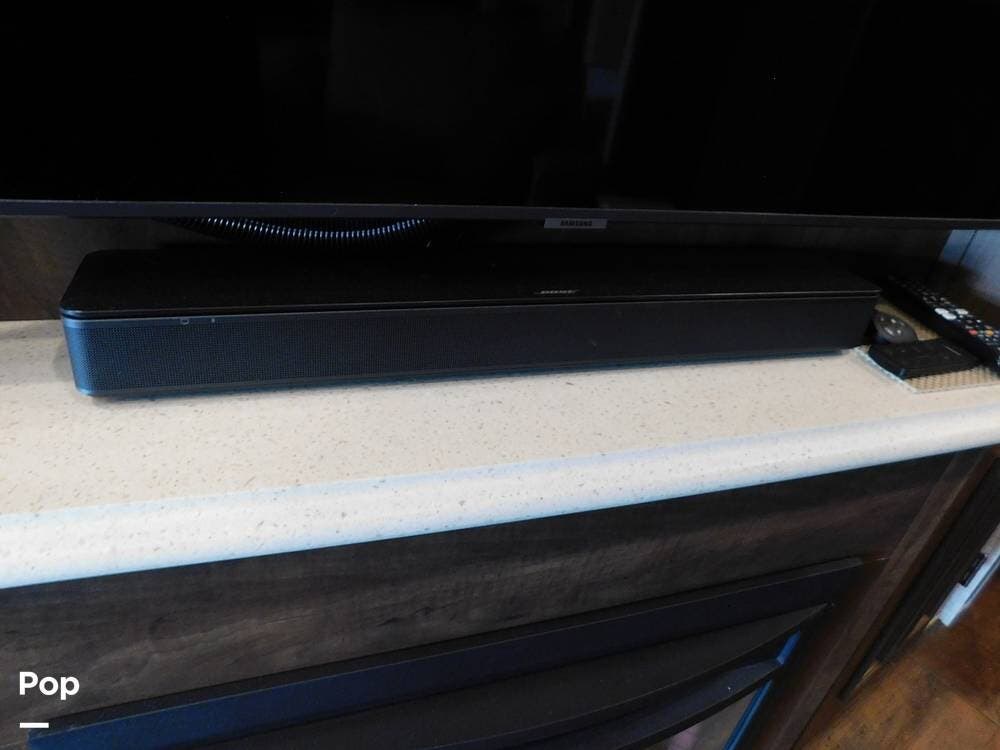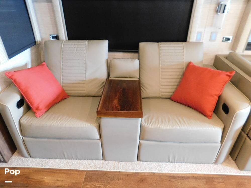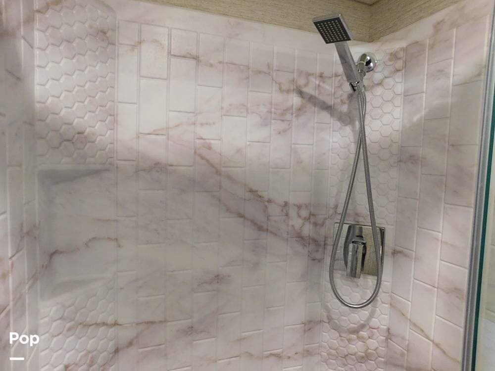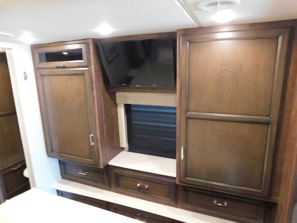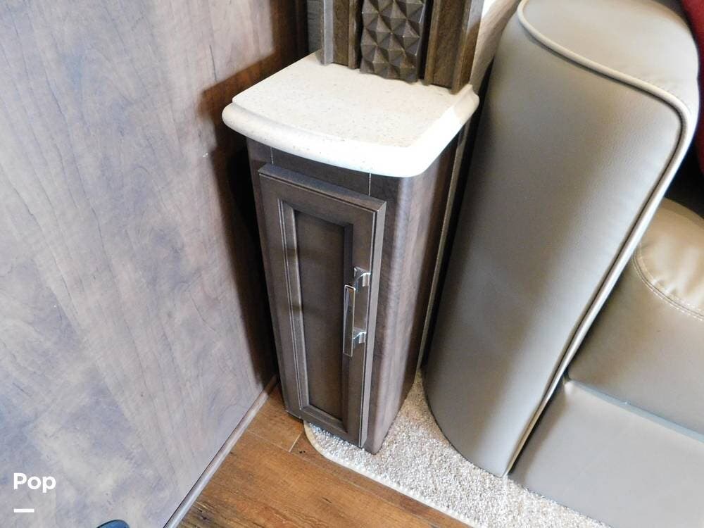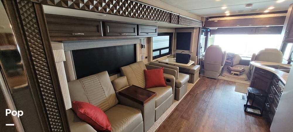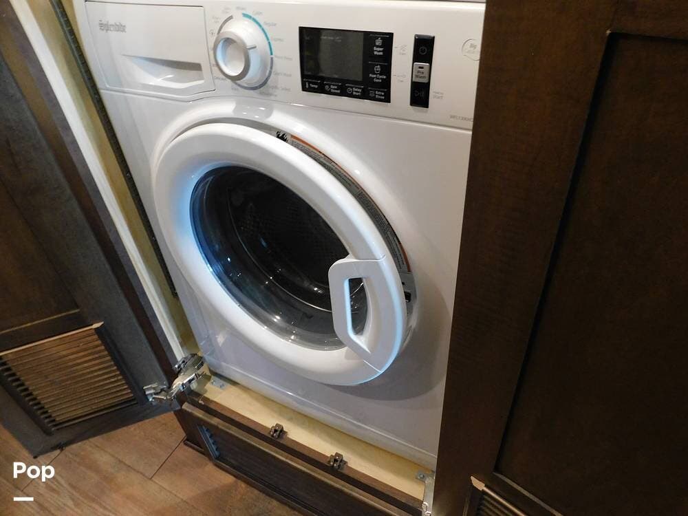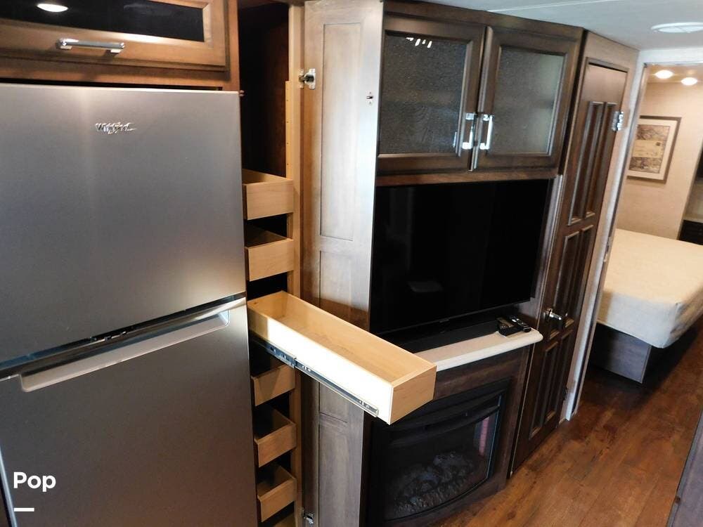 Inside, the Bay Star 3609 exudes a residential ambiance with carefully selected finishes and attention to detail. The main living area is designed for comfort and convenience, featuring theatre seating with a handmade black walnut TV tray, upgraded, larger fireplace, and a booth dinette that provides flexibility for dining or entertaining. Large panoramic windows flood the space with natural light while offering scenic views of the surroundings.