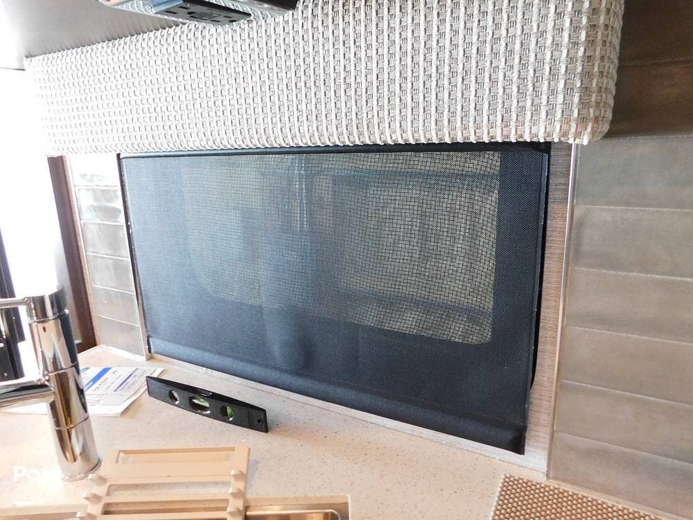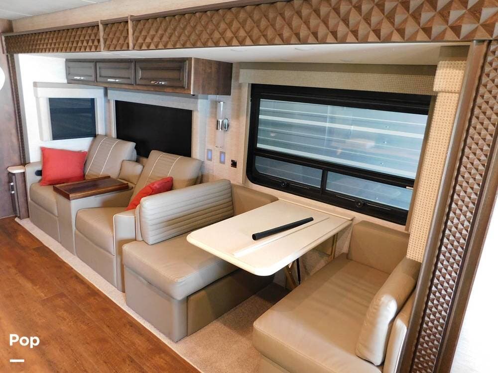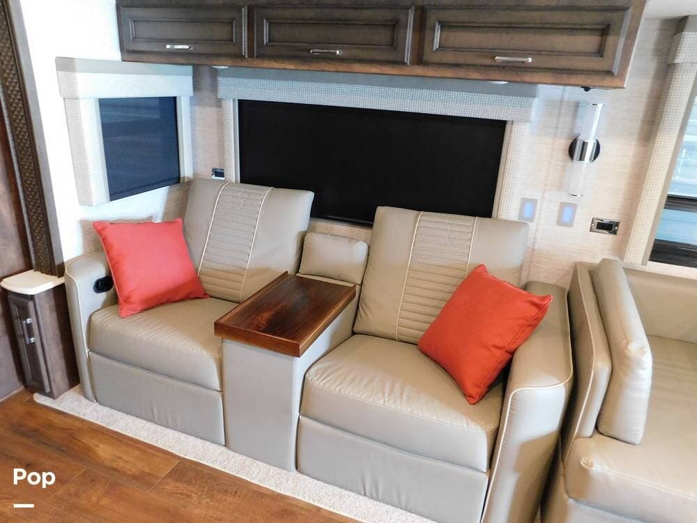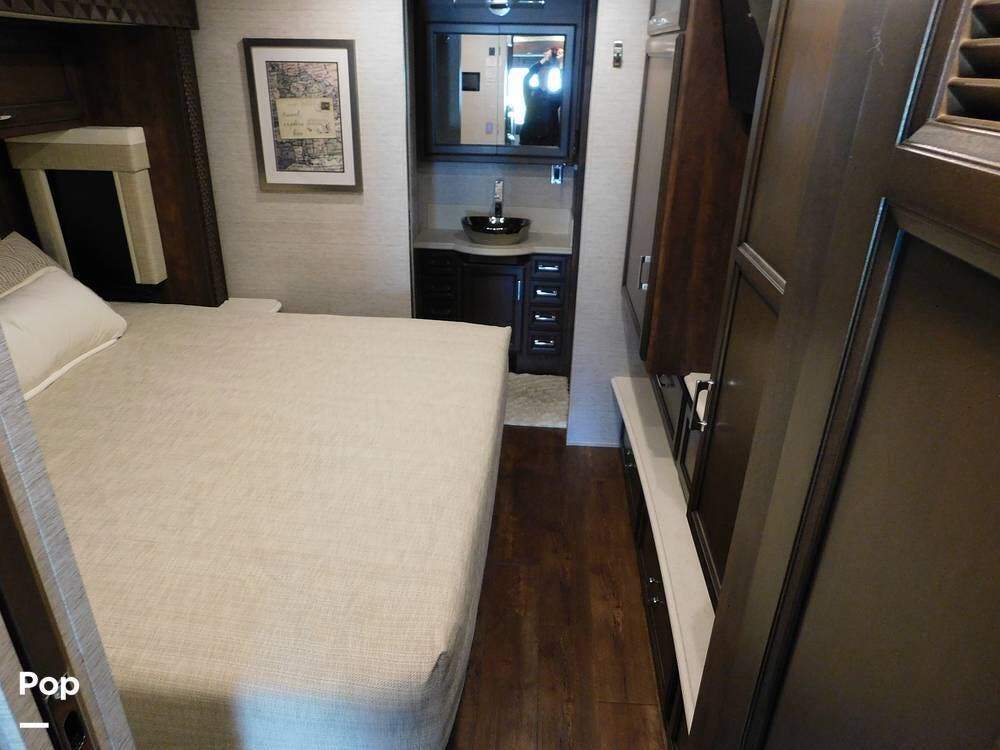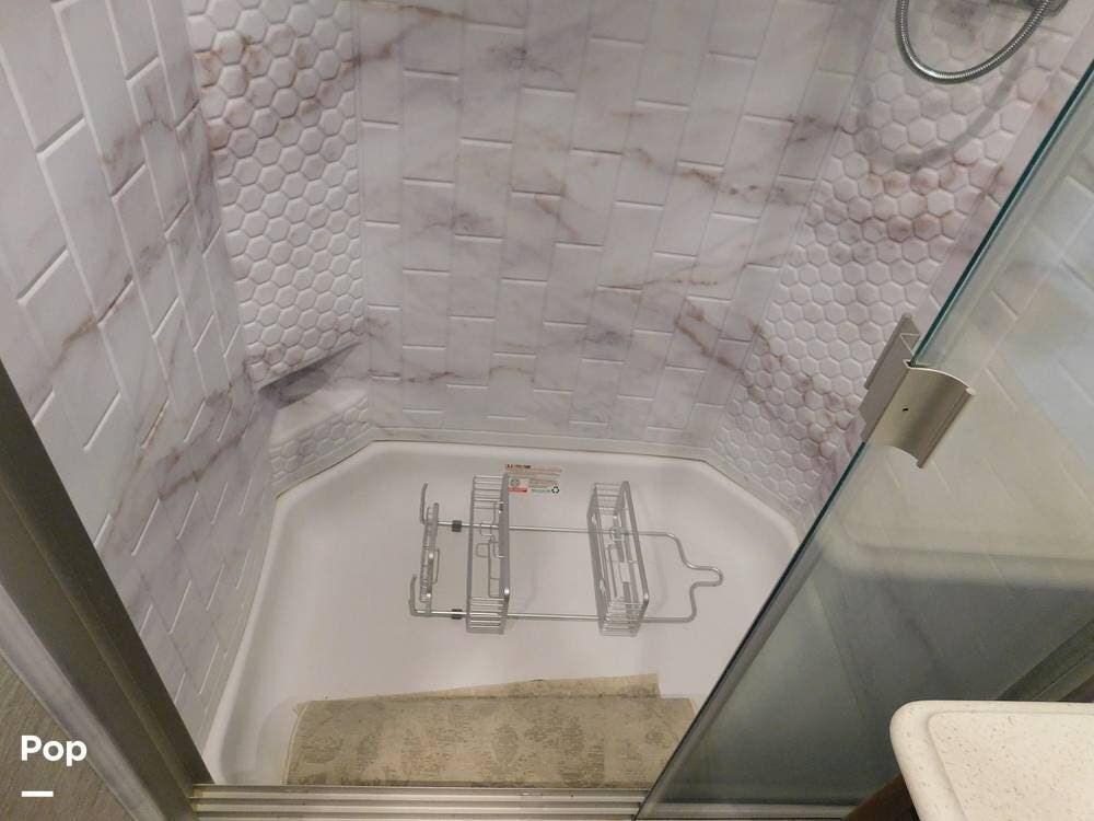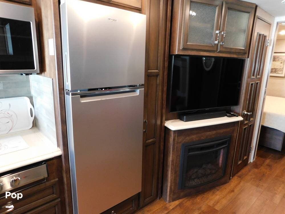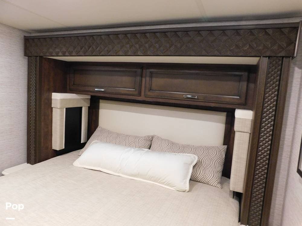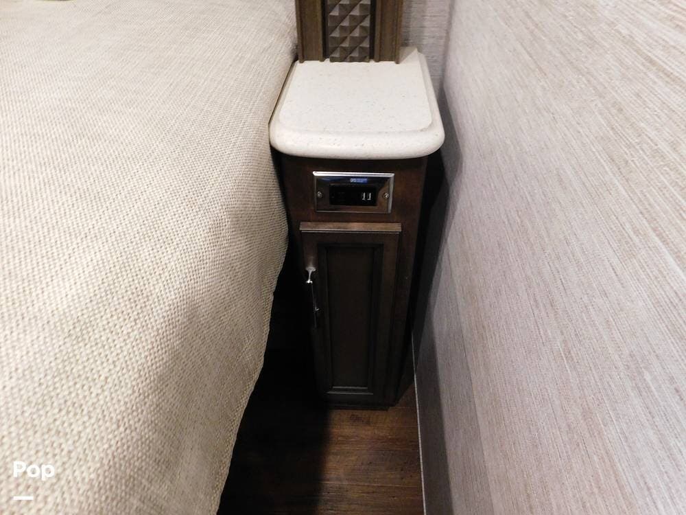 Inside, the Bay Star 3609 exudes a residential ambiance with carefully selected finishes and attention to detail. The main living area is designed for comfort and convenience, featuring theatre seating with a handmade black walnut TV tray, upgraded, larger fireplace, and a booth dinette that provides flexibility for dining or entertaining. Large panoramic windows flood the space with natural light while offering scenic views of the surroundings.