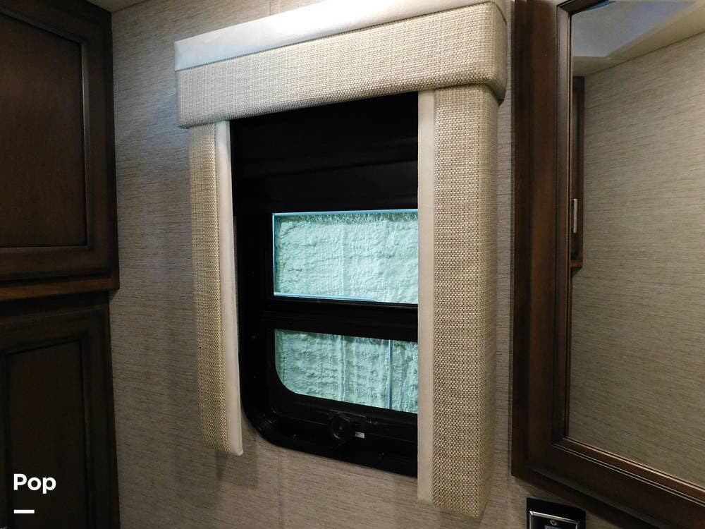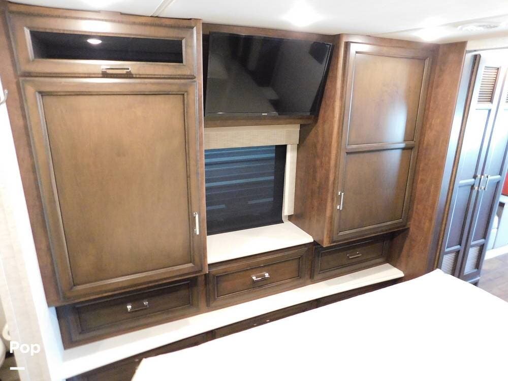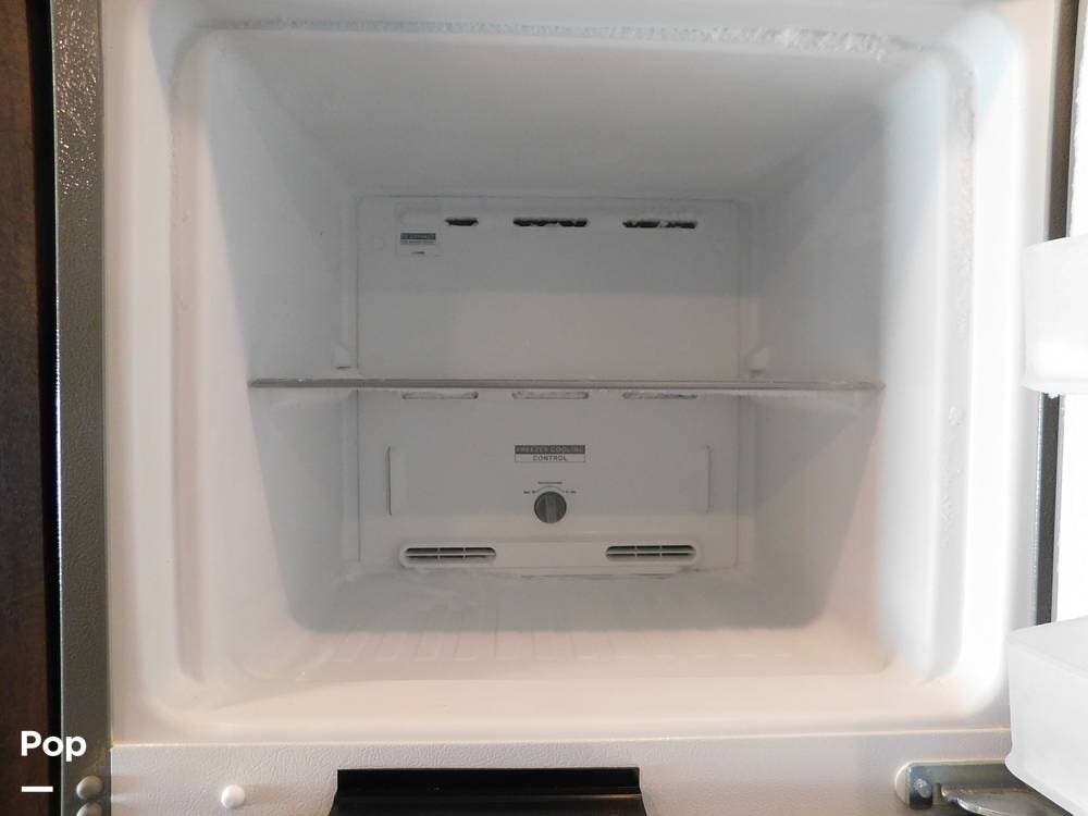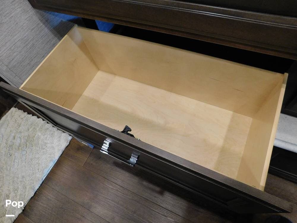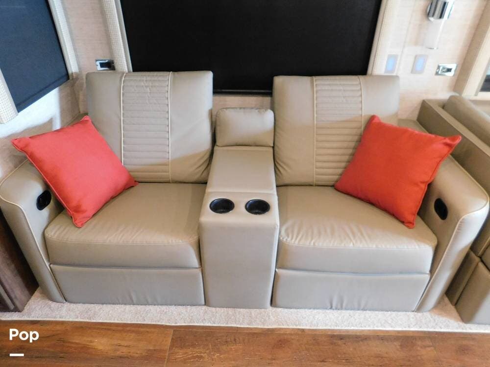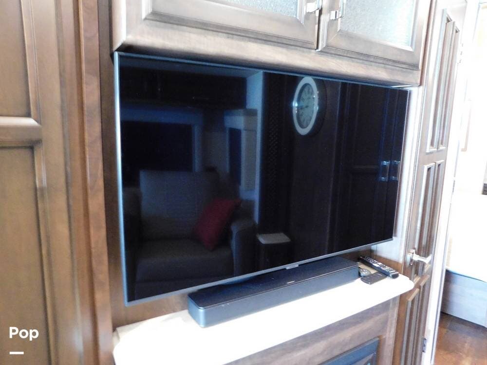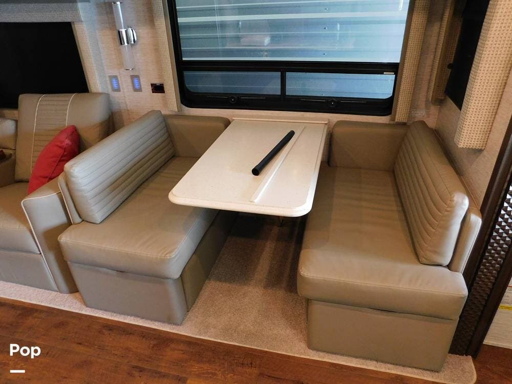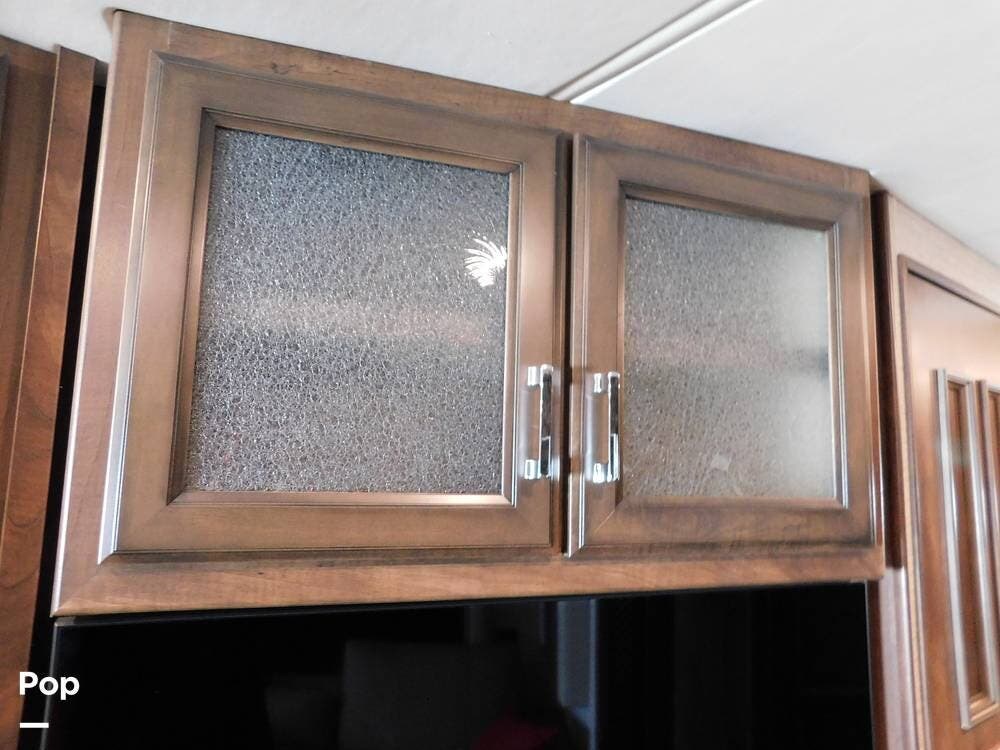 Inside, the Bay Star 3609 exudes a residential ambiance with carefully selected finishes and attention to detail. The main living area is designed for comfort and convenience, featuring theatre seating with a handmade black walnut TV tray, upgraded, larger fireplace, and a booth dinette that provides flexibility for dining or entertaining. Large panoramic windows flood the space with natural light while offering scenic views of the surroundings.