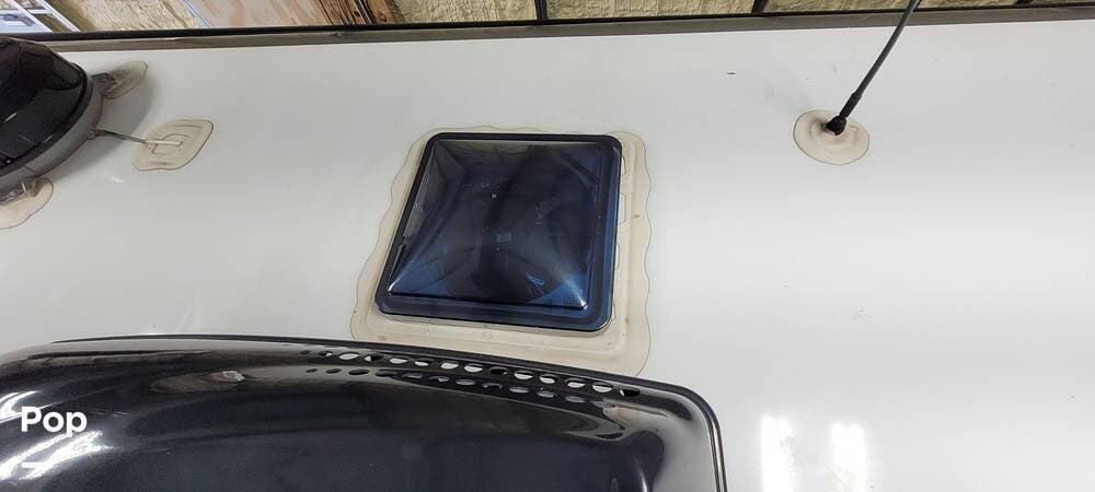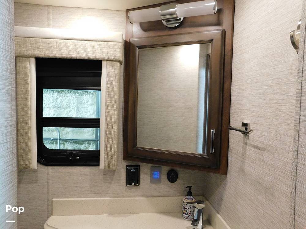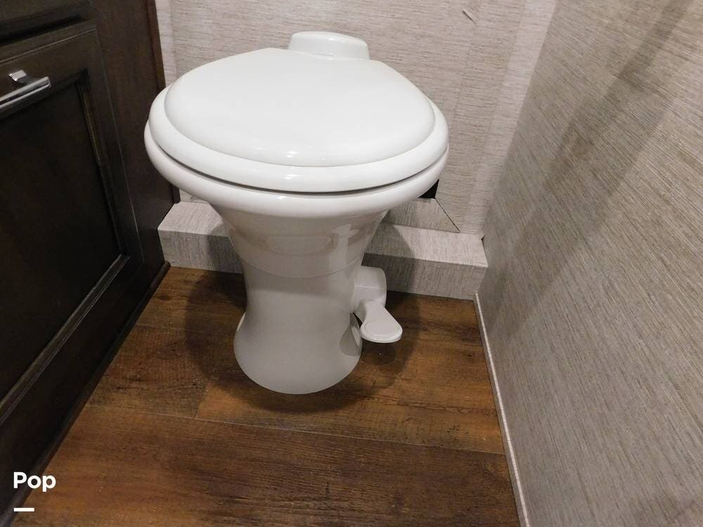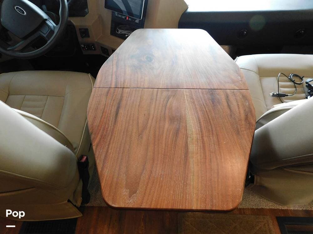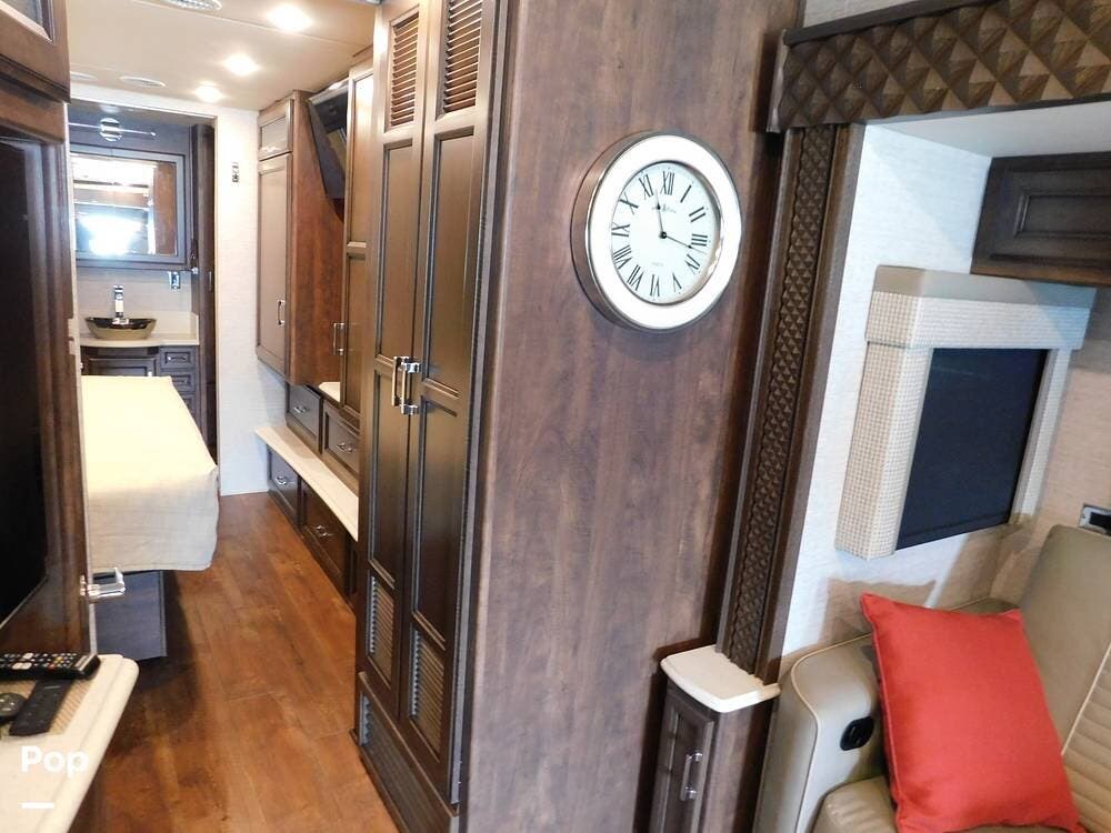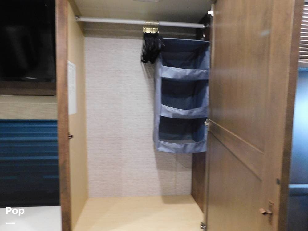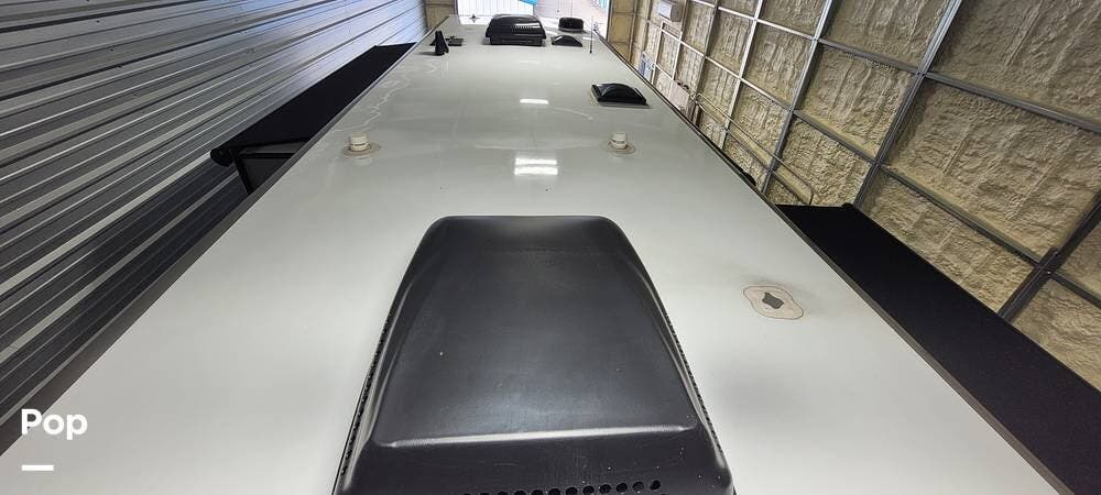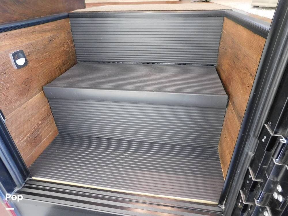 Inside, the Bay Star 3609 exudes a residential ambiance with carefully selected finishes and attention to detail. The main living area is designed for comfort and convenience, featuring theatre seating with a handmade black walnut TV tray, upgraded, larger fireplace, and a booth dinette that provides flexibility for dining or entertaining. Large panoramic windows flood the space with natural light while offering scenic views of the surroundings.