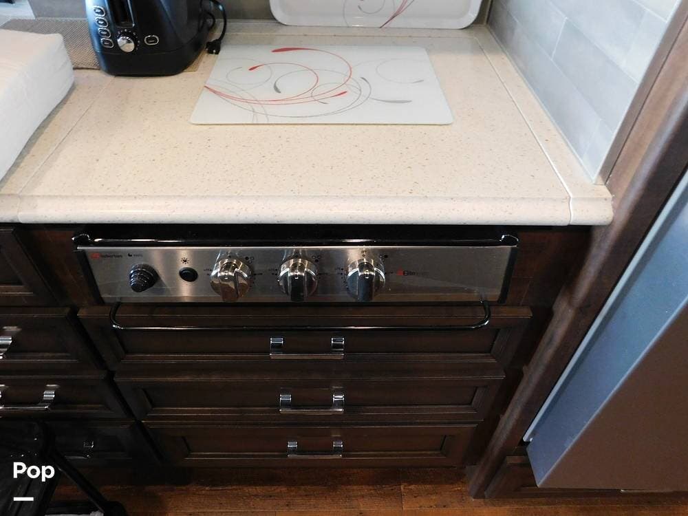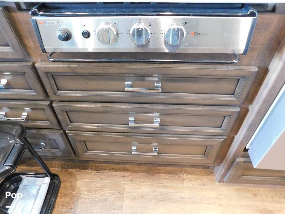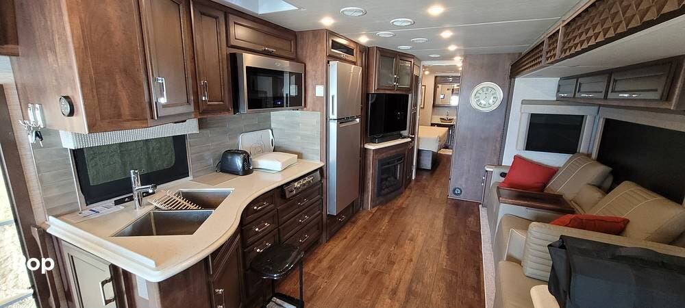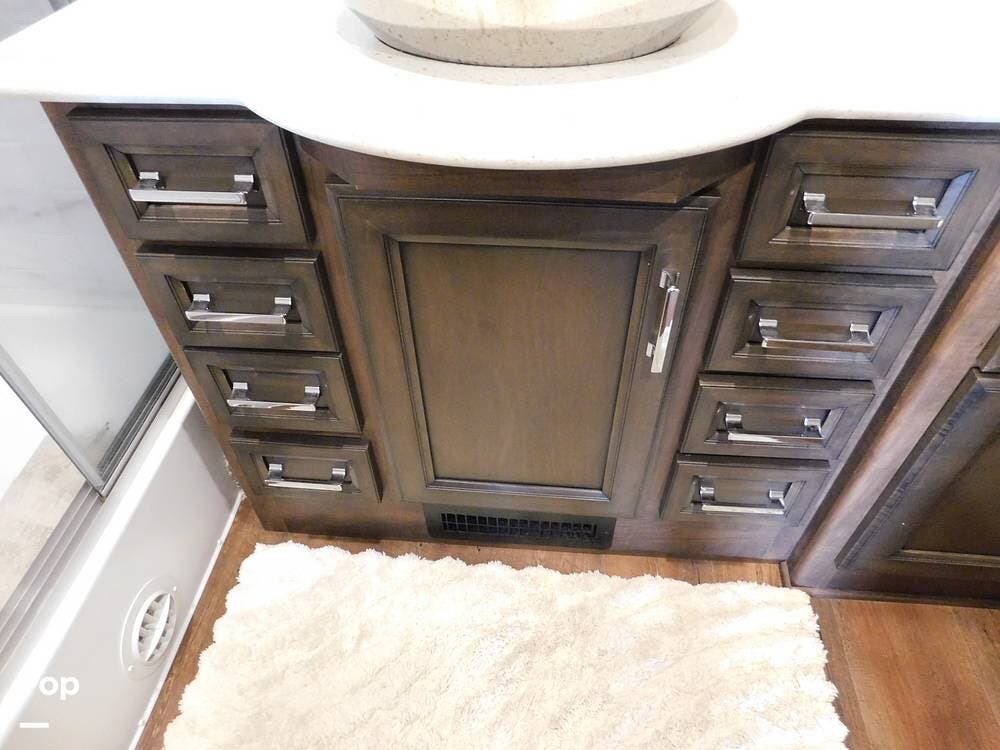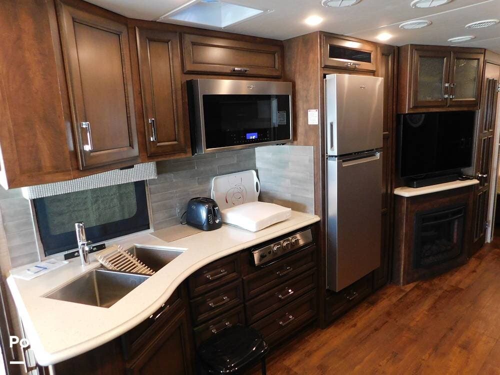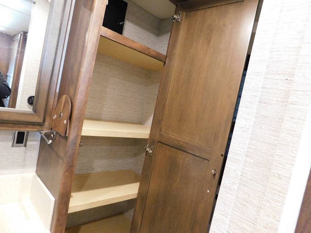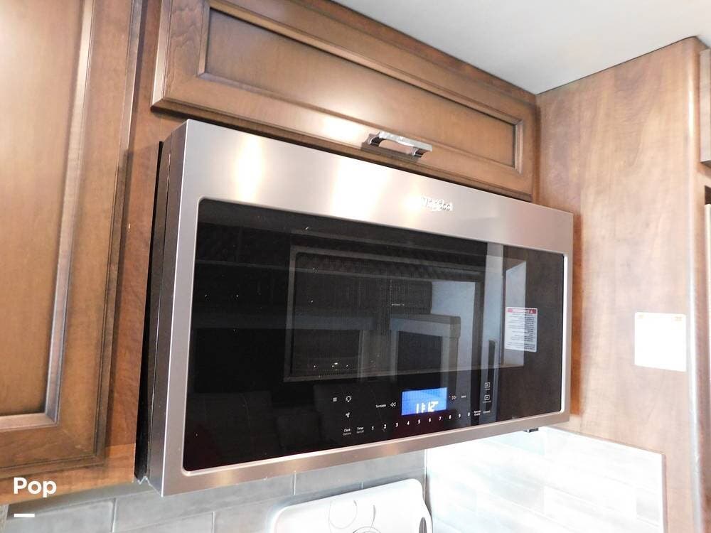 The fully equipped kitchen is tailored for culinary enthusiasts, boasting solid-surface countertops, a three-burner gas cooktop, a convection microwave oven, and a residential-style refrigerator. Ample cabinetry and pantry space make it easy to store kitchen essentials and groceries, making meal preparation on the road effortless.