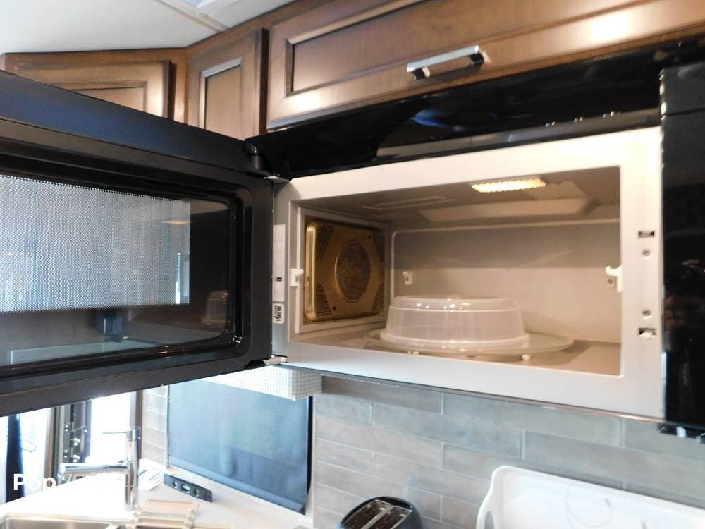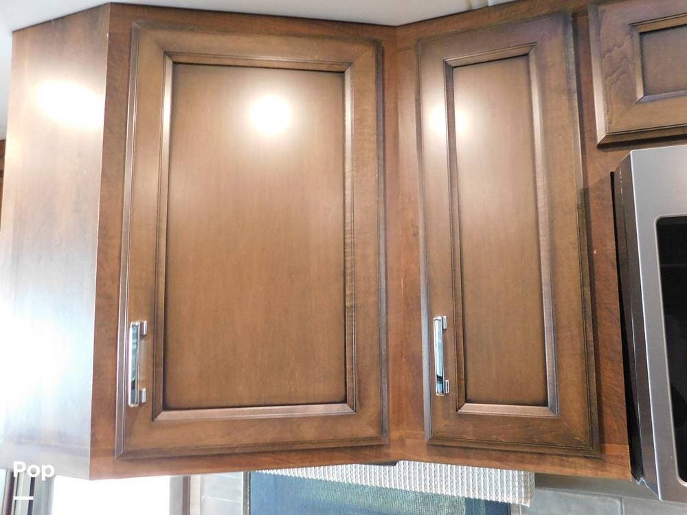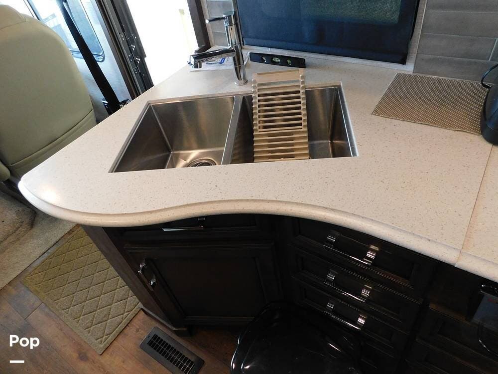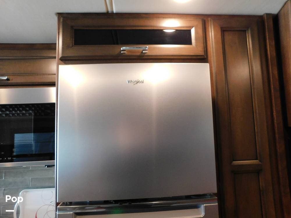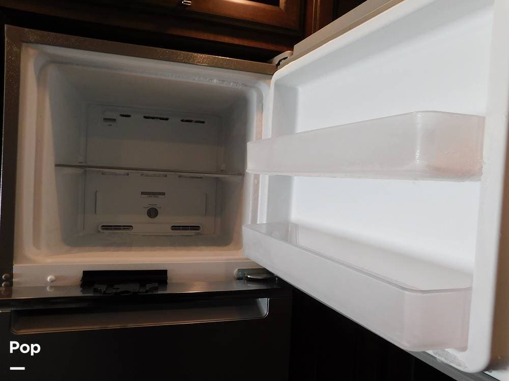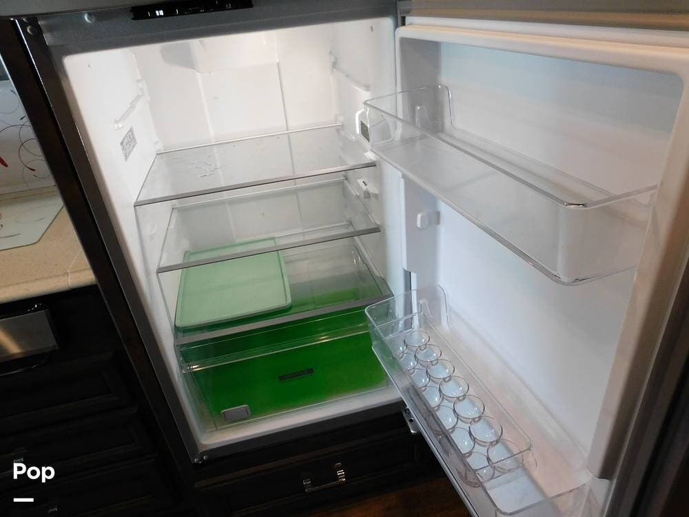 The fully equipped kitchen is tailored for culinary enthusiasts, boasting solid-surface countertops, a three-burner gas cooktop, a convection microwave oven, and a residential-style refrigerator. Ample cabinetry and pantry space make it easy to store kitchen essentials and groceries, making meal preparation on the road effortless.