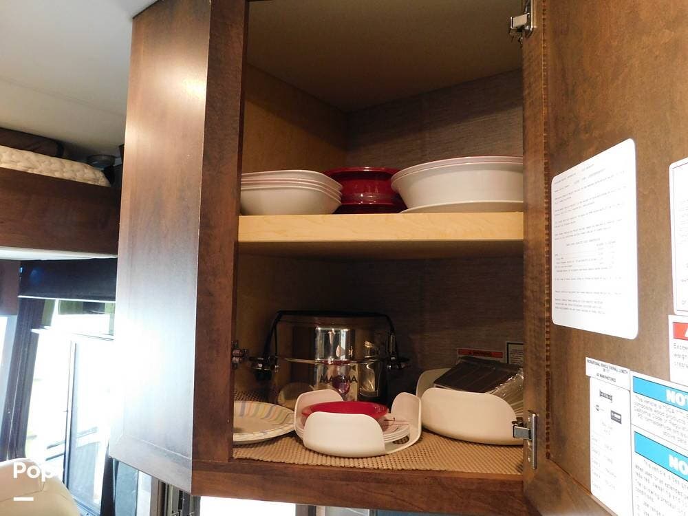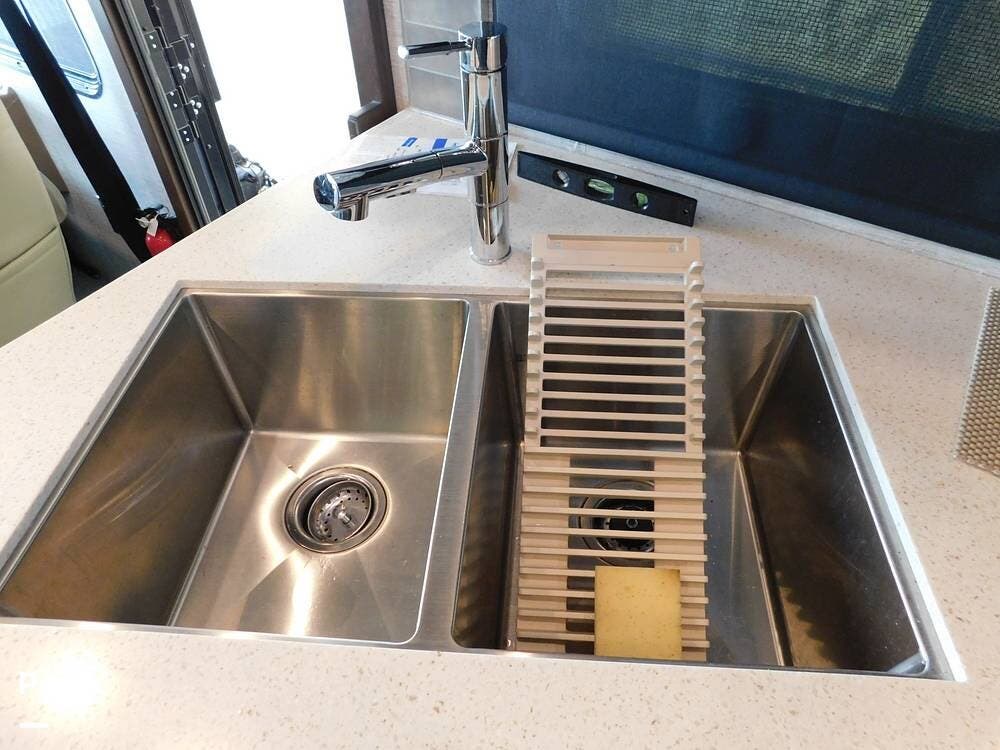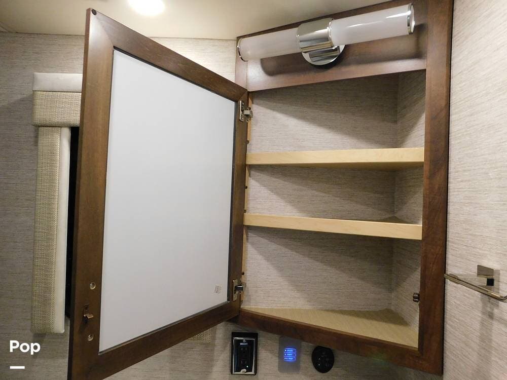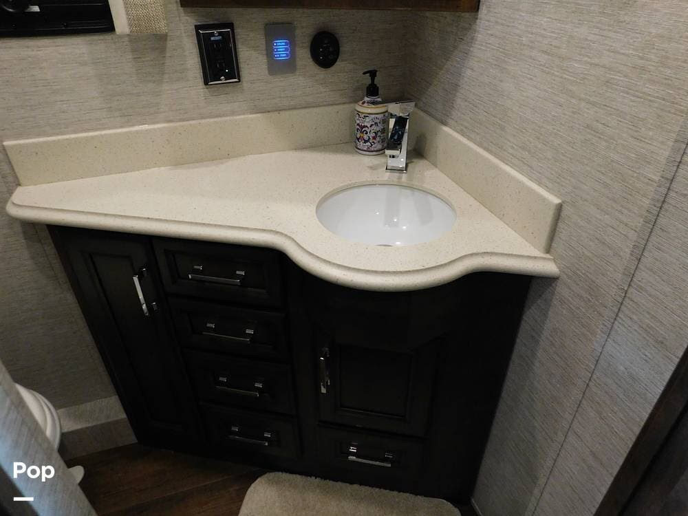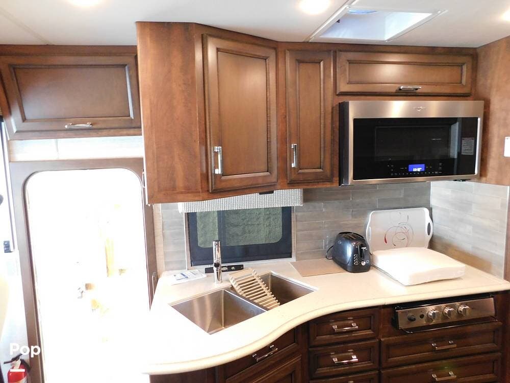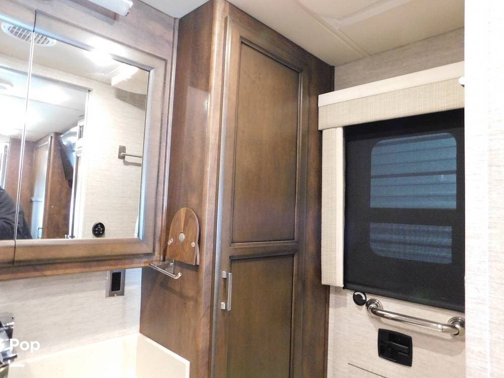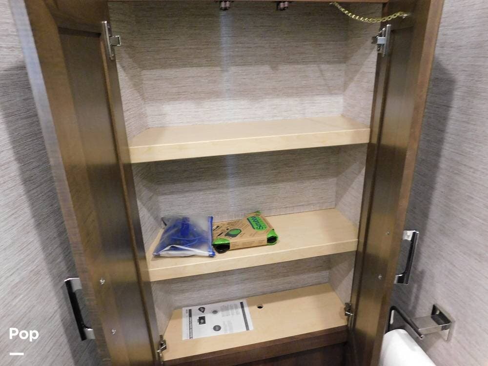 The fully equipped kitchen is tailored for culinary enthusiasts, boasting solid-surface countertops, a three-burner gas cooktop, a convection microwave oven, and a residential-style refrigerator. Ample cabinetry and pantry space make it easy to store kitchen essentials and groceries, making meal preparation on the road effortless.