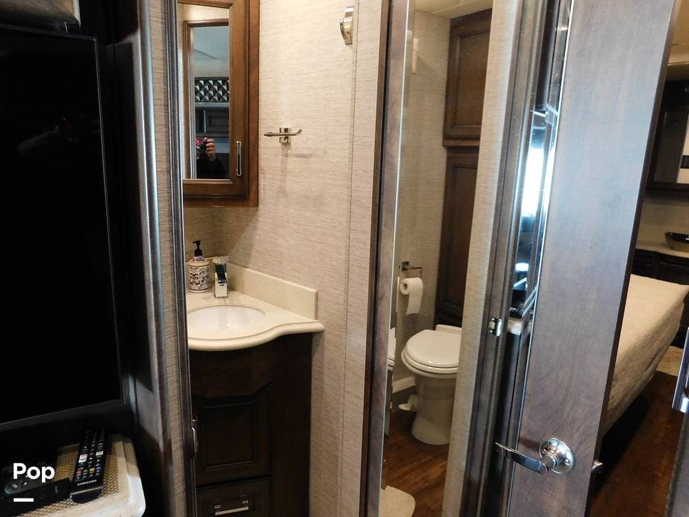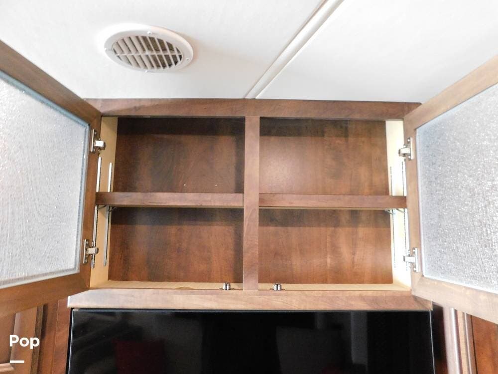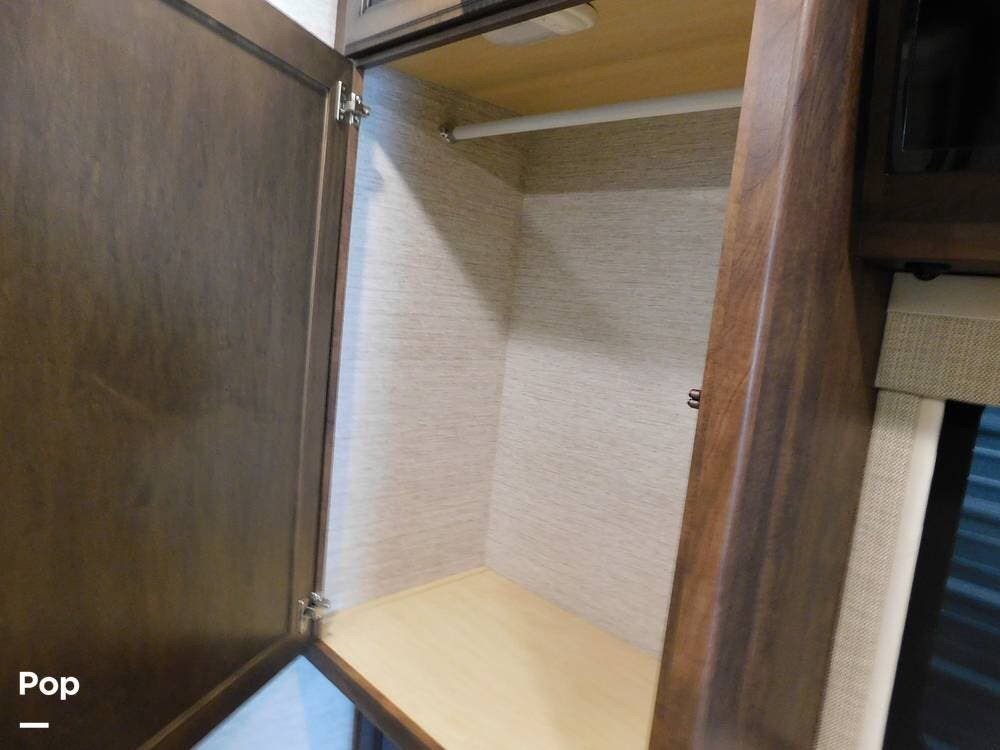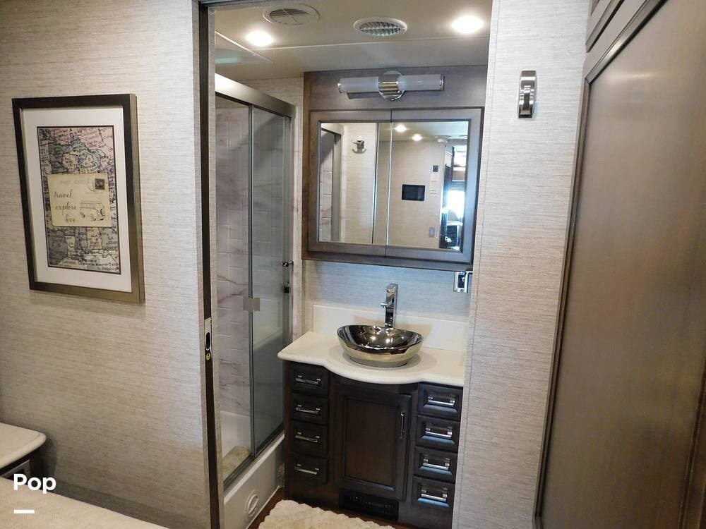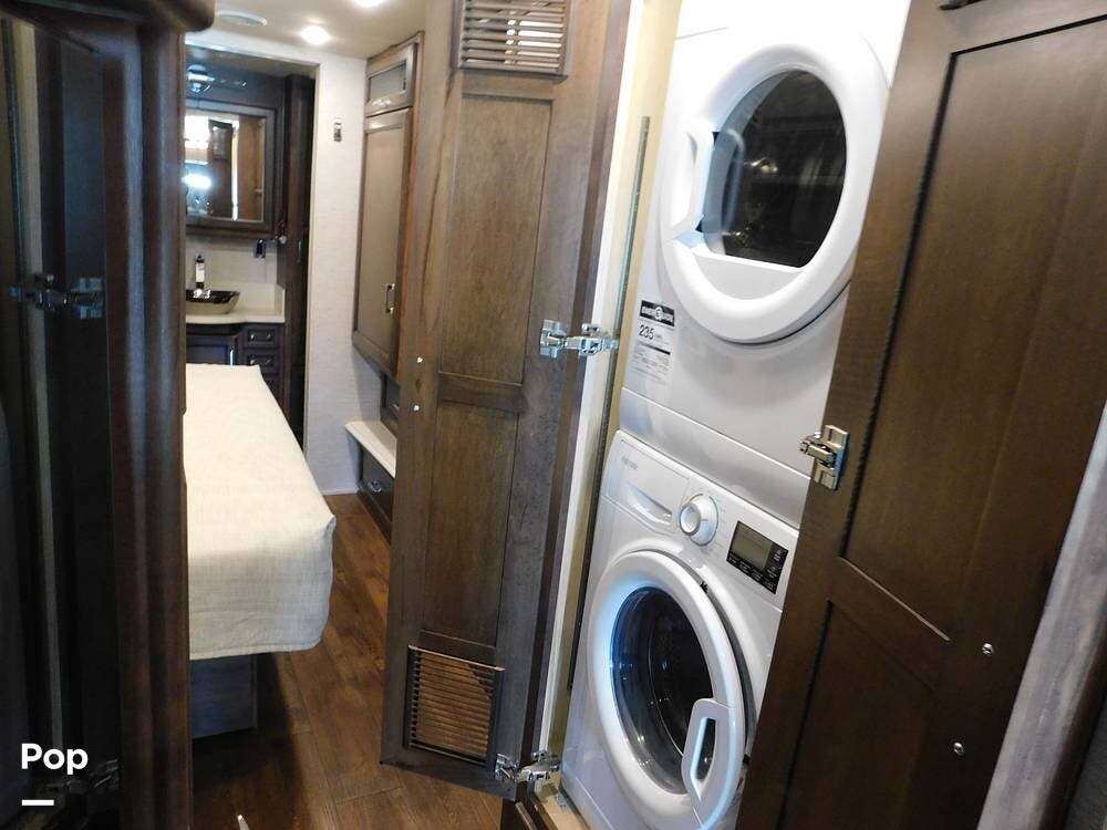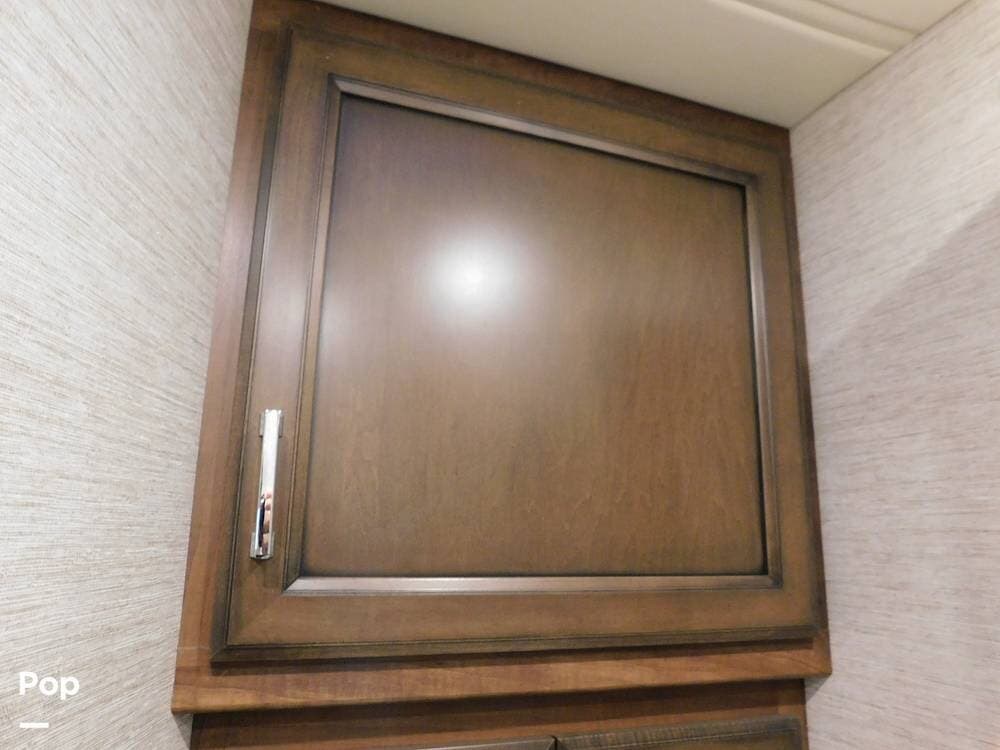 The fully equipped kitchen is tailored for culinary enthusiasts, boasting solid-surface countertops, a three-burner gas cooktop, a convection microwave oven, and a residential-style refrigerator. Ample cabinetry and pantry space make it easy to store kitchen essentials and groceries, making meal preparation on the road effortless.