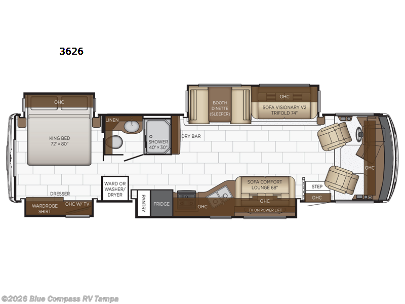 Four slide outs make this motorhome both spacious and comfortable for all your excursions! The passenger workstation will be big plus if you need to telecommute on the way to the campground, and your guests can stay comfortable on the comfort lounge, the booth dinette, and the Visionary V2 tri-fold sofa. This model includes a wardrobe right across from the full bath that can be optioned out for an optional Splendide stacked washer and dryer, and the rear private bedroom will feel just like home with its king bed and shirt wardrobe. There is even a bedroom LED TV, along with the living room LED TV on power lift!