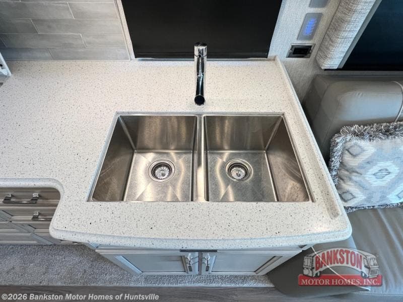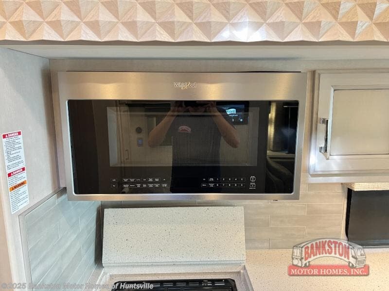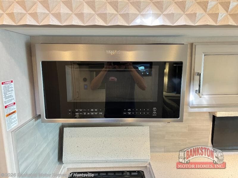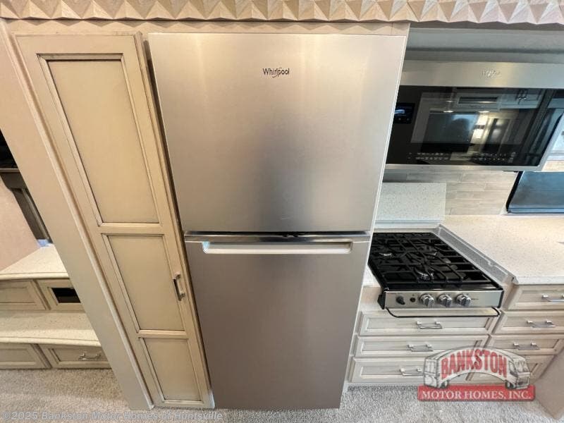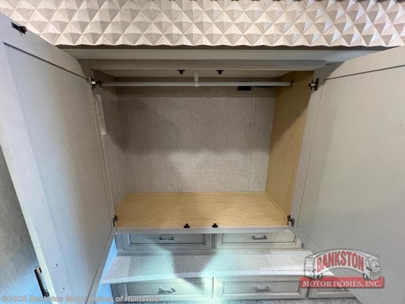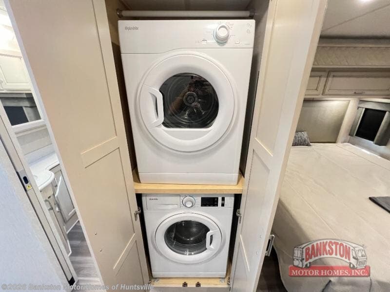 This coach is the perfect companion to take across states since it will feel just like home. There is a full-wall slide that will open up your living space, plus two additional slides so you won't feel confined. You will love the master bedroom and the full rear bath that includes a linen closet for clean towels, and there is a mid-coach half bath with a wardrobe that can be optioned out for an optional Splendide stacked washer and dryer. The chef of your group will have a 30" convection microwave and a three burner cooktop to prepare meals each day, and there is a booth dinette where you can all dine together. You might want to relax on the 74" sofa after dinner and watch a movie on the TV on power lift!