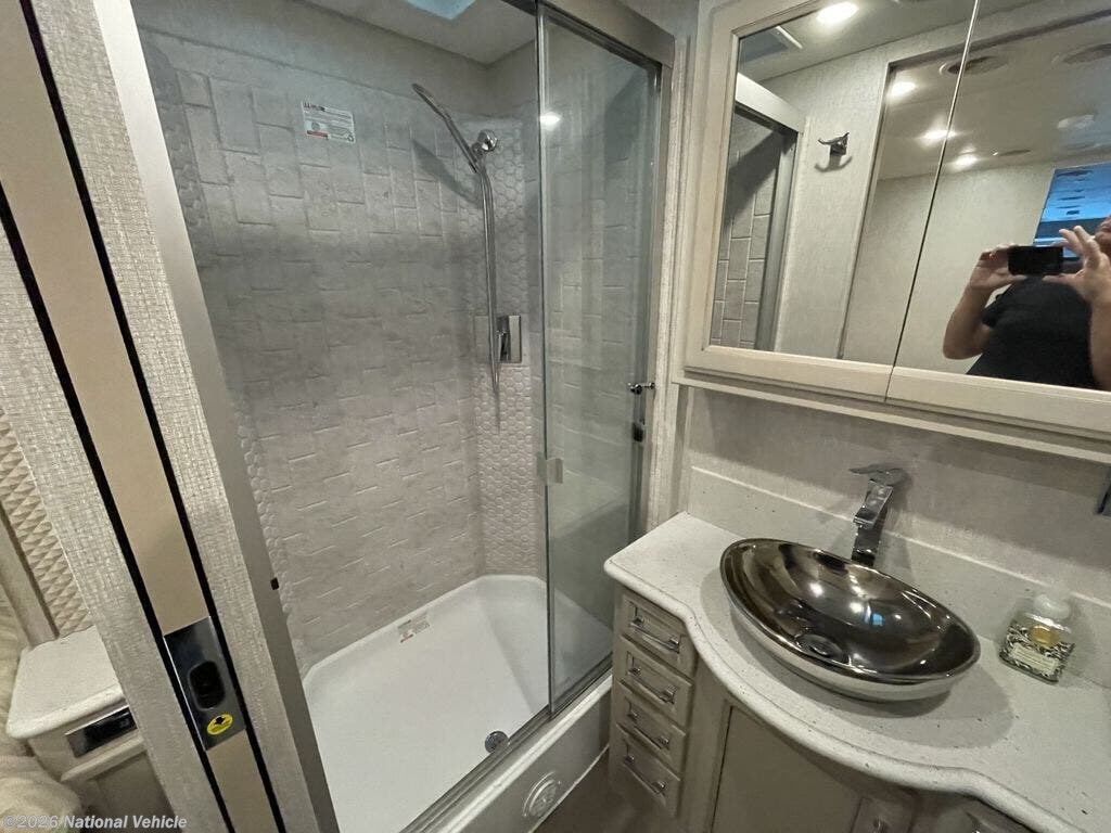 This coach is the perfect companion to take across states since it will feel just like home. There is a full-wall slide that will open up your living space, plus two additional slides so you won't feel confined. You will love the master bedroom and the full rear bath that includes a linen closet for clean towels, and there is a mid-coach half bath with a wardrobe that includes Splendide stacked washer and dryer. The chef of your group will have a 30" convection microwave and a three burner cooktop to prepare meals each day, and there is a booth dinette where you can all dine together. You might want to relax on the 74" sofa after dinner and watch a movie on the TV on power lift!