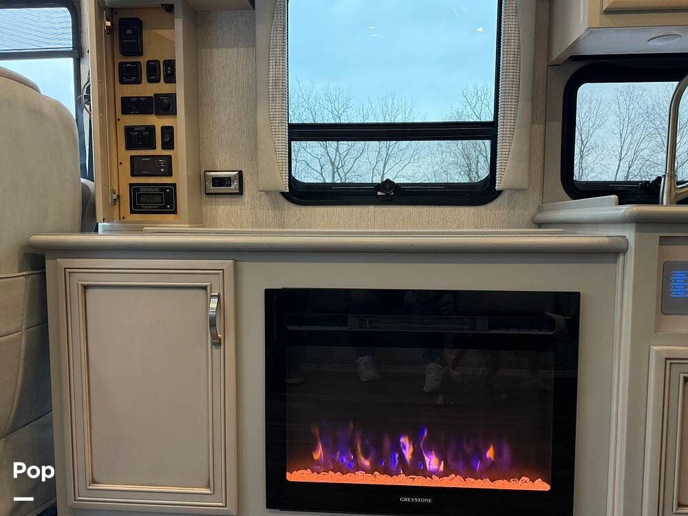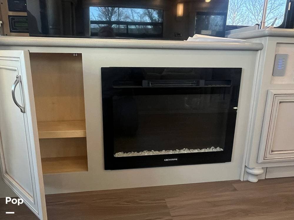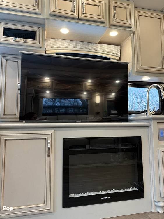 Step back into the living area and find Villa Comfort Fit furniture, including a jack-knife sofa across from a Samsung 4K LED TV on a motorized lift paired with a Bose soundbar system and an electric fireplace, available for added warmth and ambiance.