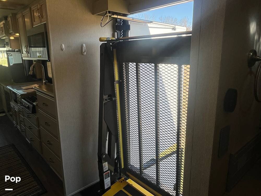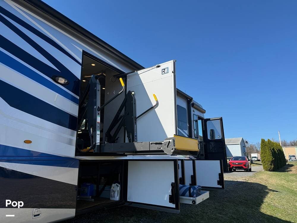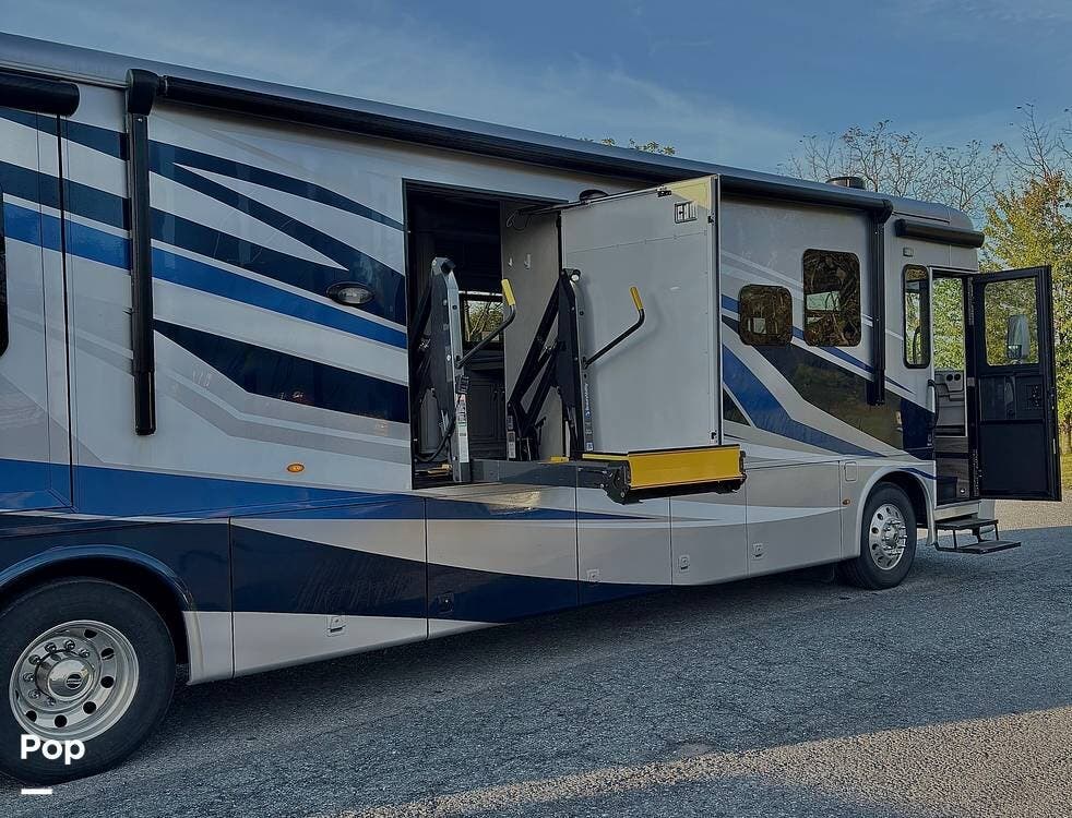 The 2023 Newmar Kountry Star 4011 is a 40-foot Class A diesel motorhome designed with a focus on luxury, comfort, and accessibility. Built on a Freightliner XCR chassis with a 360-HP Cummins engine and Comfort Drive adaptive steering, it provides a smooth driving experience, while the interior is intentionally designed for easy navigation, featuring wide aisles and, in this specific model, a BraunAbility wheelchair lift.
