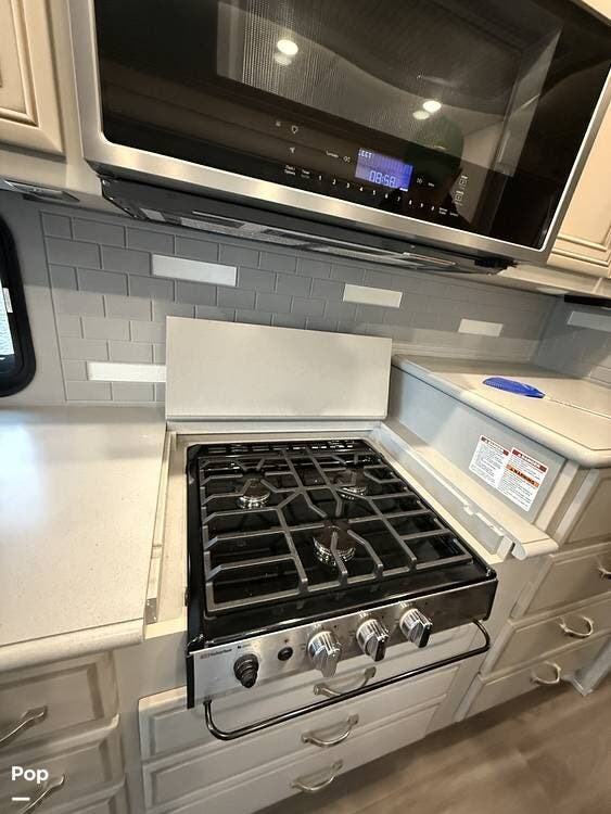 The kitchen is equipped with a 30-inch convection stainless steel microwave, a three-burner recessed cooktop, and a 19.7 cu. ft. residential-style refrigerator, polished solid surface countertops with a stainless steel undermount sink, and ample storage provided through glacier-glazed maple flat-design cabinetry with soft-close doors.