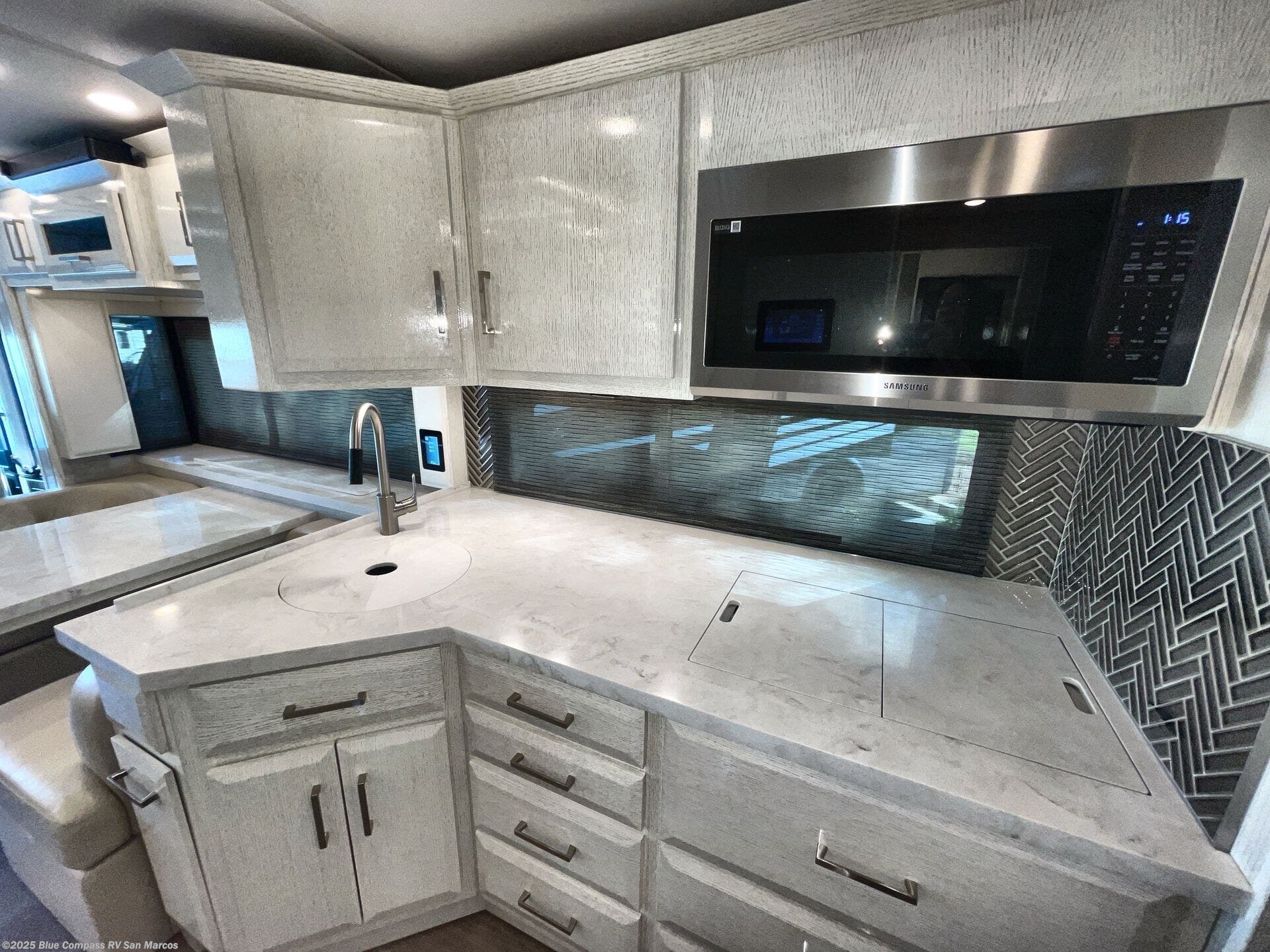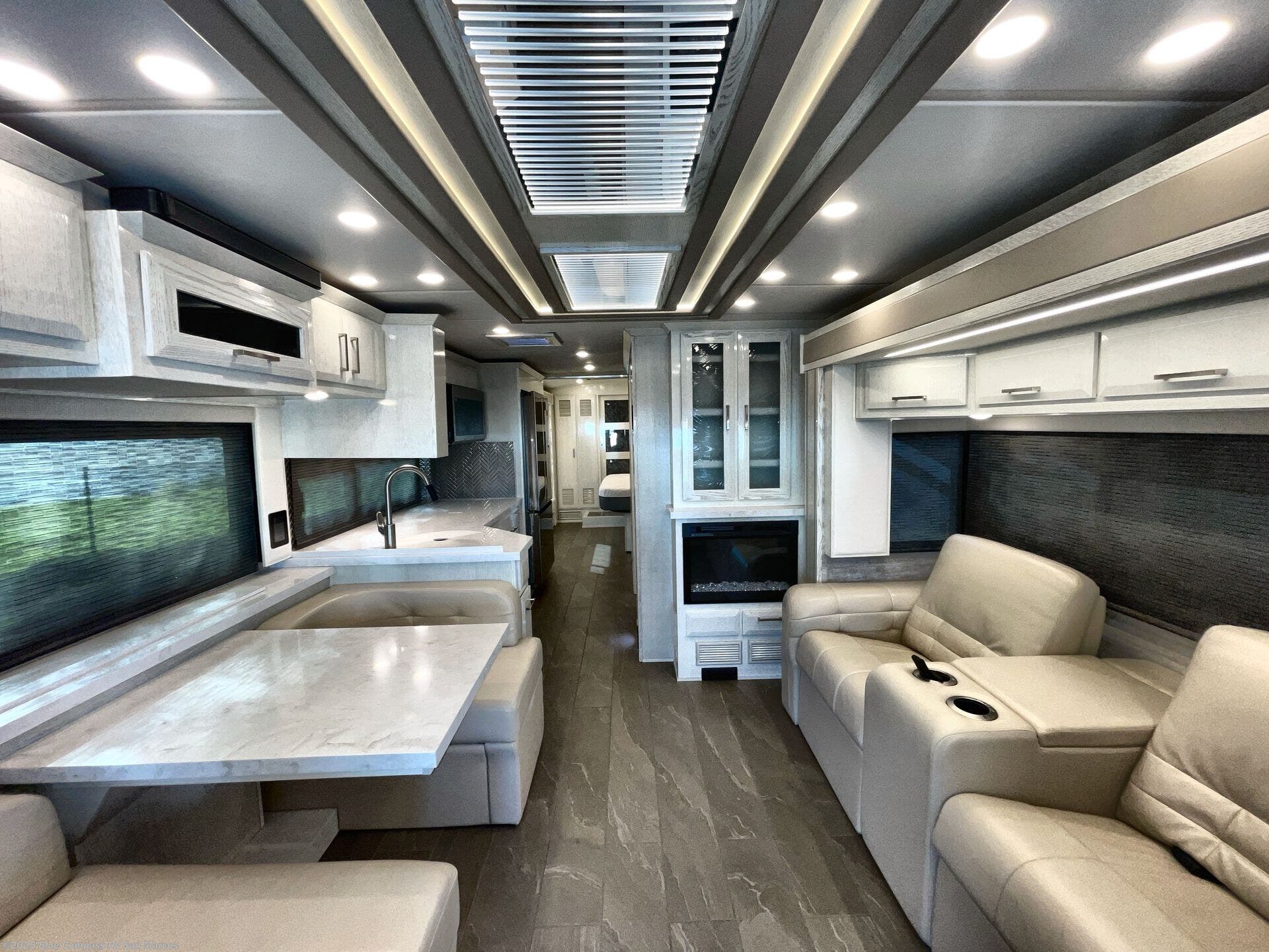 Looking to relax in the great outdoors, travel to see family cross-country, or shop at your favorite places while staying at an RV resort? You can do all of those activities plus more when you travel in this coach! The full-wall slide gives you plenty of room to walk from the front to the back and the two additional slide outs giving you even more space. The main living area offers a visionary sofa, and a Euro booth dinette with two table leaves and two folding chairs for more seating while dining or watching the 50" TV on power lift. You will also be able to utilize the driver/passenger seats which include six-way power lumbar, recline, and footrest when drinking your glass of wine or cup of coffee. The kitchen suite offers everything you will need to make any meal, plus the stainless steel appliances are stylish. The feature ceiling, the flooring, the drawers with dove tail self closing full extension ball bearing guides, and the super polished solid surface countertop in the kitchen, bathroom and bedroom are even more reasons you will love this coach!