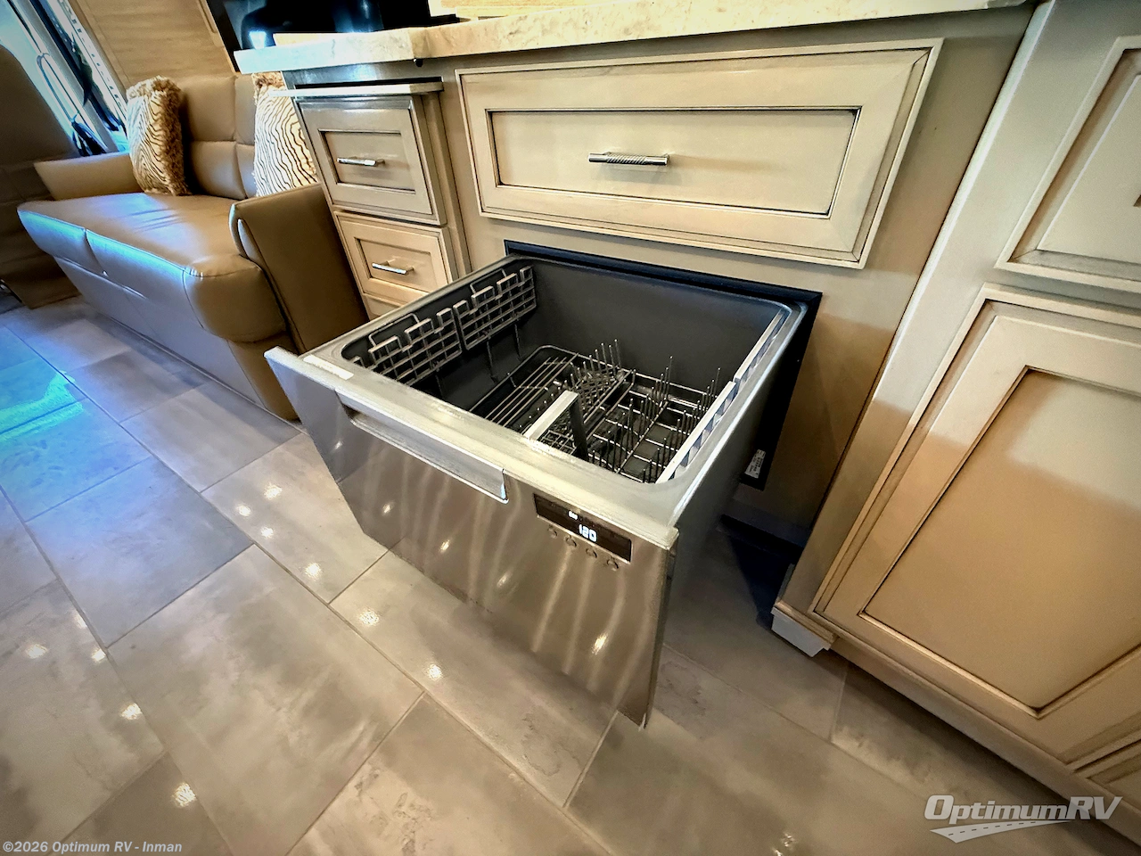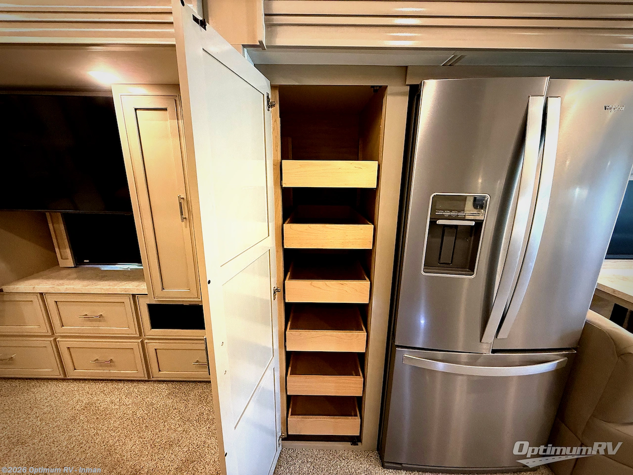 Experience a home away from home with this motorhome! Two can get ready at once in the full rear bathroom with the dual sink vanity, plus it has a 50" x 34" shower with a seat, a linen closet, a wardrobe with doors, adjustable shelves, and even an area prepped to add an optional washer and dryer. The master suite has access to the bathroom, a king bed slide, and a dresser with wardrobes on either side and a Samsung LED 4K TV. You can prepare your best meals with the three burner recessed gas cooktop, pull-out cabinet, and large pantry then enjoy them at the hide-a-leaf dinette. Now that your belly is full, head to either the 87" hide-a-bed sofa or the 74" jackknife sofa while a movie plays on the 50" Samsung LED 4K TV on a power lift!
