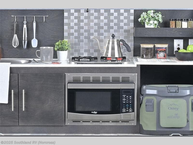 With any nuCamp RV TAG teardrop trailer, you can bring some of the comforts of home with you as you easily tow this lightweight trailer to the campgrounds. You can also camp off-grid thanks to the solar roof package and optional Boondock package which provides aggressive off-road tires, an aluminum utility platform for more gear, a heavy duty pitched axle and Boondock graphics. The outdoor kitchen includes a stainless steel sink, a two-burner stove, microwave, and premium travel cooler plus counter space. And the interior offers a composite floor, deluxe Ohio-Amish cabinetry, a portable Bluetooth speaker, sleeping accommodations, and a screen/shade system. Get ready for adventure in a TAG!