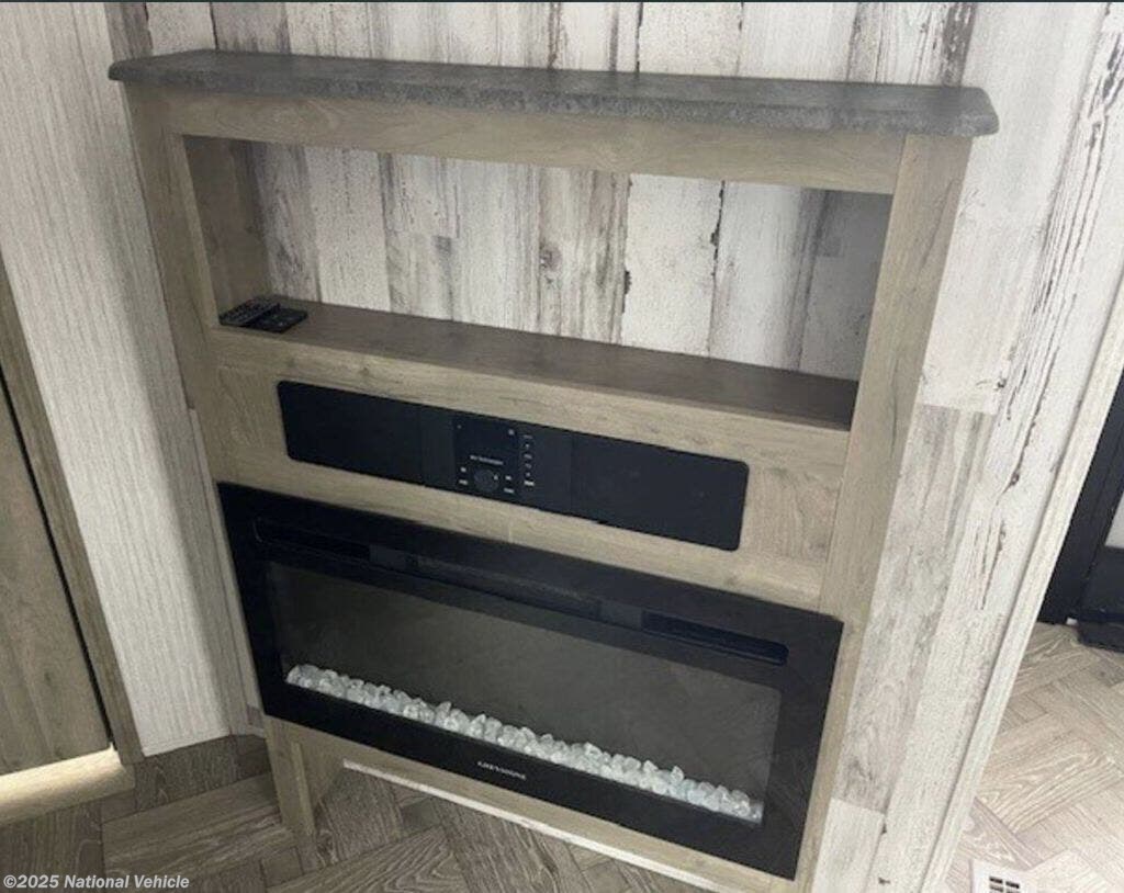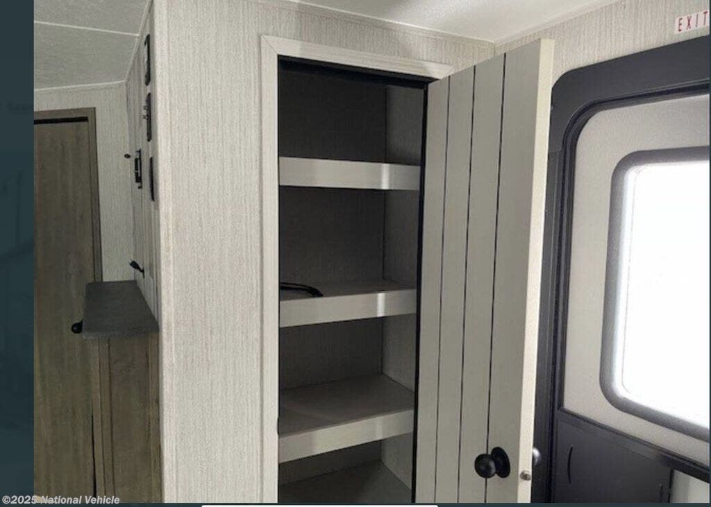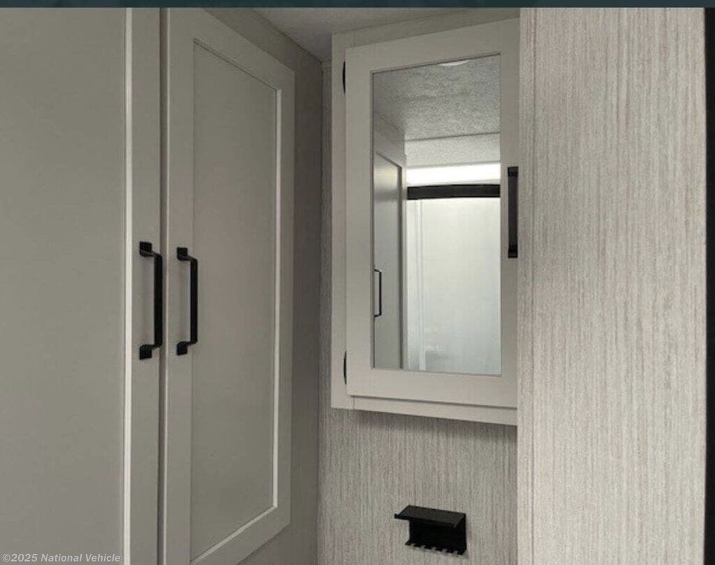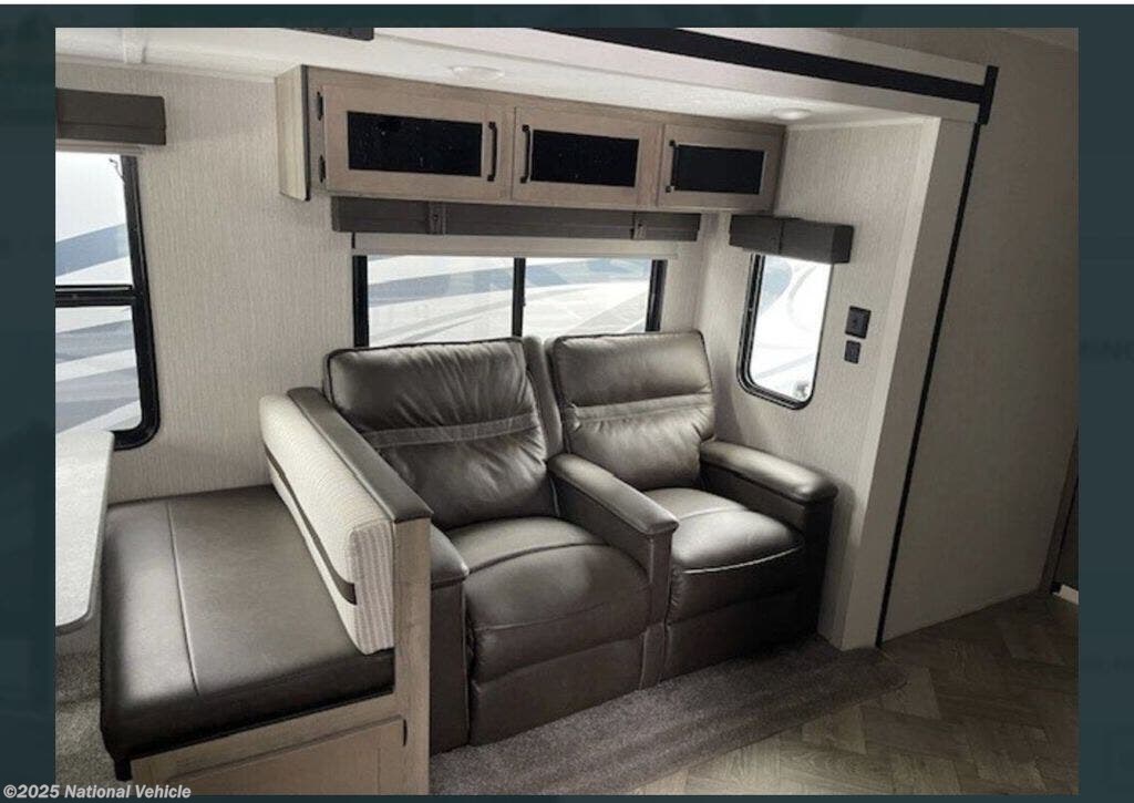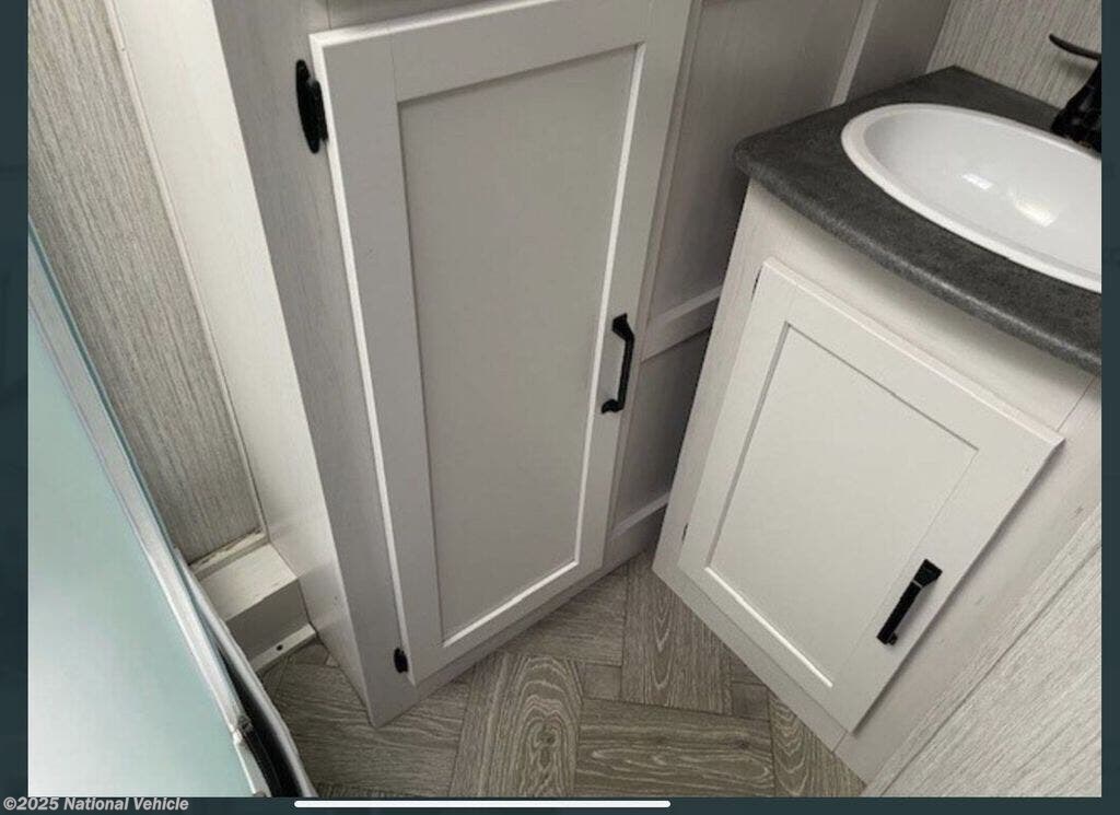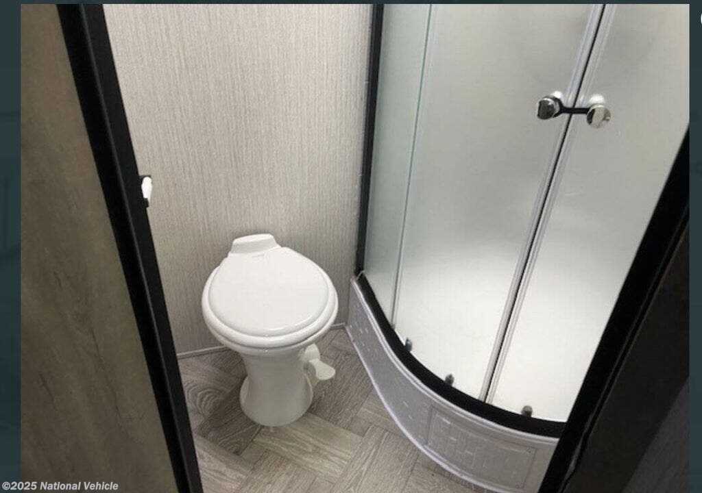 The private front bedroom includes a walk-around queen bed, dual closets, overhead storage, and sliding doors for added privacy. The spacious mid-bathroom features a corner shower, vanity with storage, and toilet, giving you refreshing comfort wherever you travel.