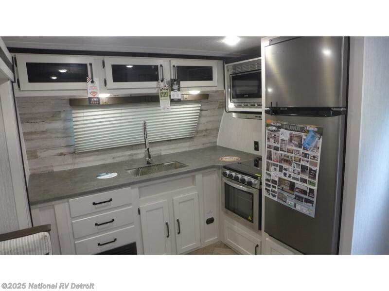 Walk into this travel trailer with one of the dual entry doors for a great camping trip! One entrance enters directly into the rear private bedroom which has a queen bed slide, a walk-in closet that is prepped for an optional washer and dryer, a wardrobe, and even an entrance into the dual entry bathroom. Grab a snack from the walk-in pantry then relax on the sofa while you watch a movie with the entertainment center or play a game at the booth dinette. The front kitchen has everything you will need to prepare your best home cooked meals including lots of countertop space, a three burner cooktop, and a residential refrigerator!