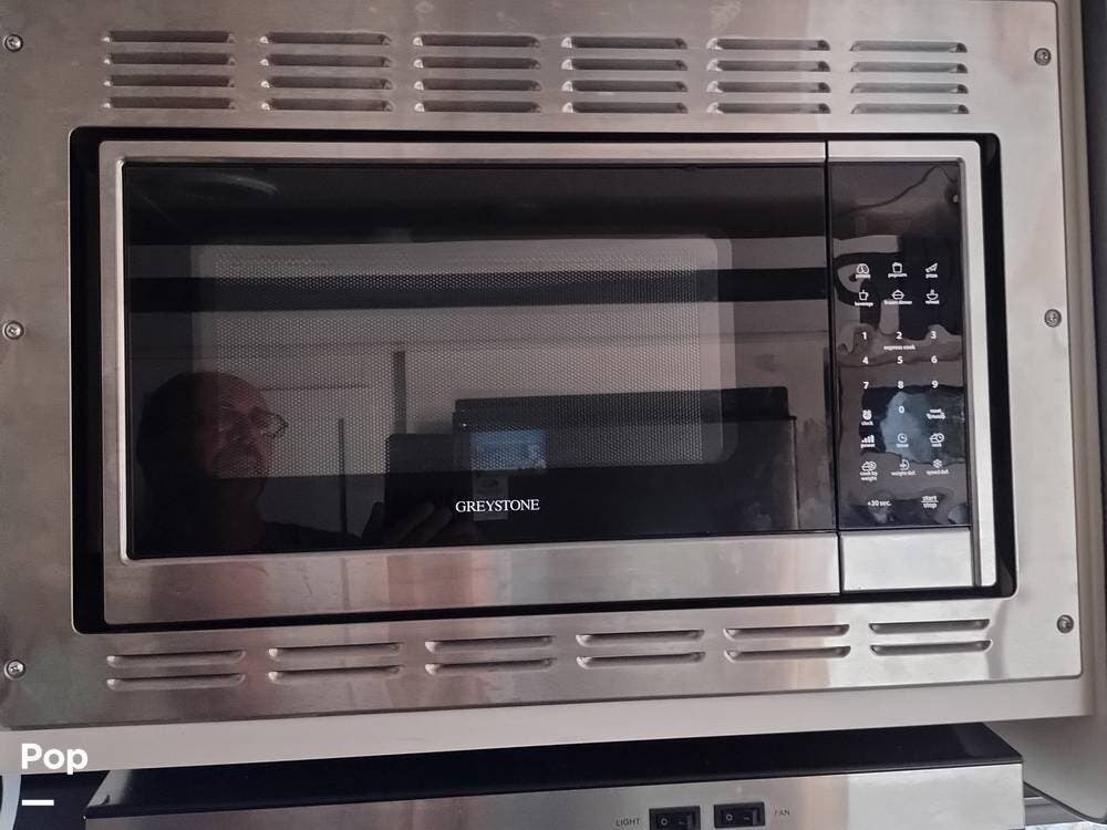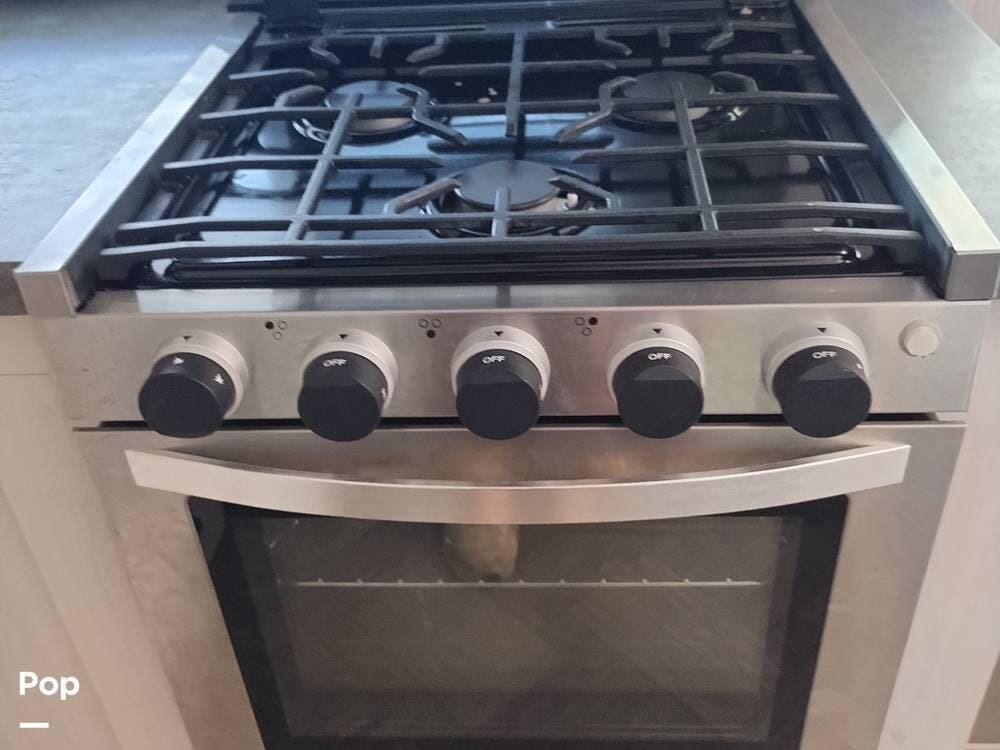 The kitchen features a three-burner cooktop, microwave, and refrigerator.