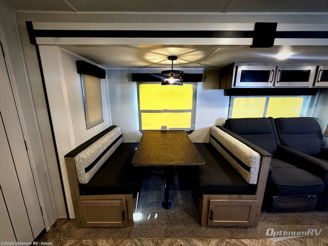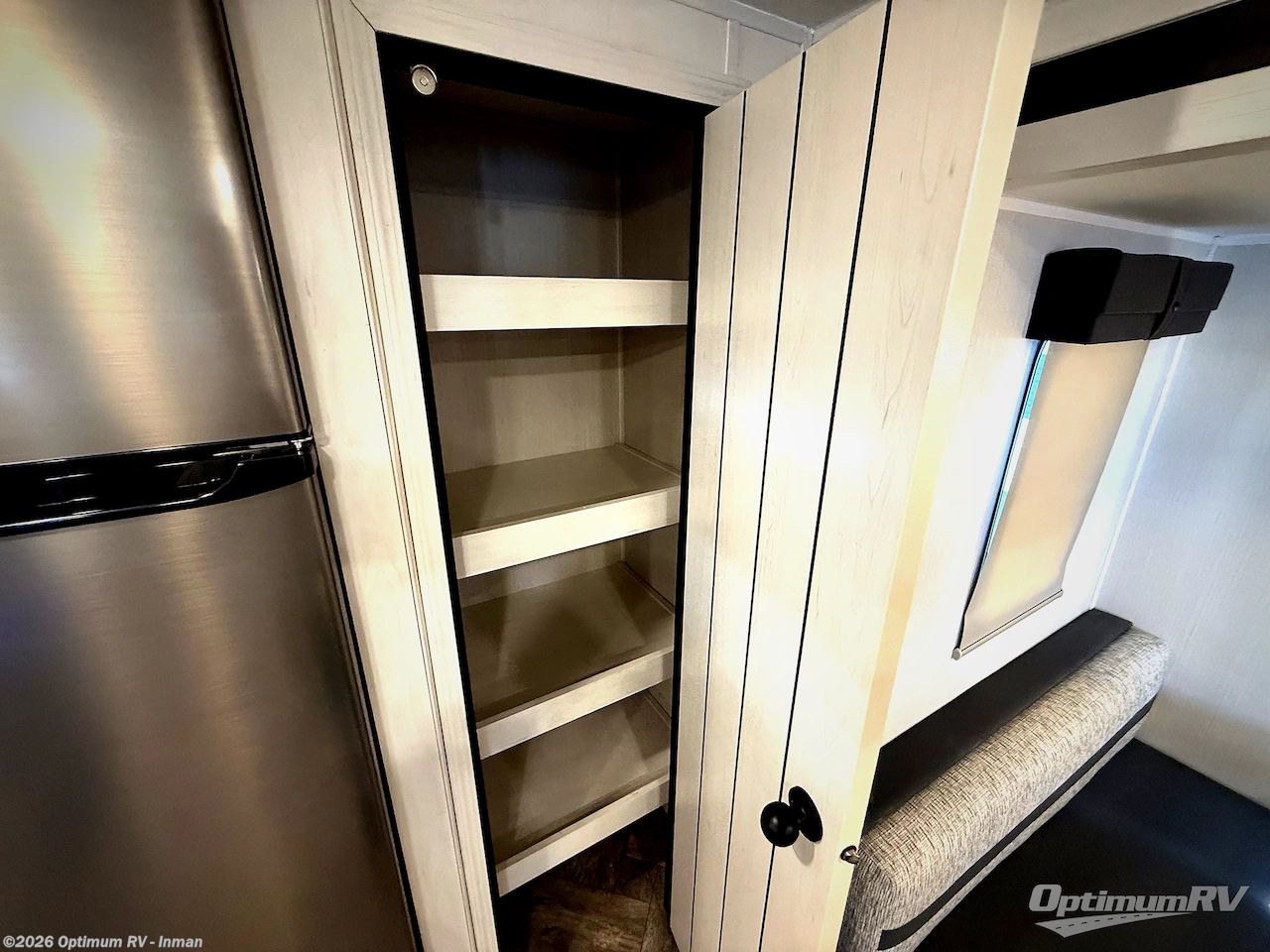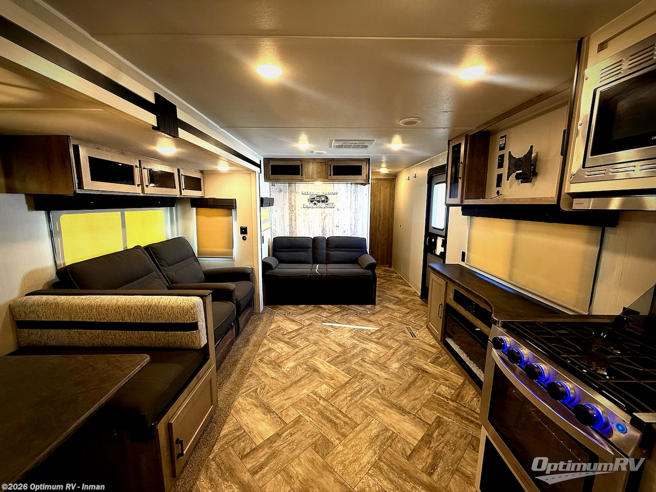 Pick your favorite camping spot and hitch this travel trailer up for a great weekend getaway! The rear kitchen has a three burner cooktop to prepare your best meals, an 11 cu. ft. stainless steel refrigerator to keep your perishables fresh, and a walk-in pantry for your canned goods and snacks for movie night. After a fun day at the beach, you can play a card game at the booth dinette, relax in either one of the two recliners and sofa, or rinse the sand out of your hair in the 32" x 40" shower with a seat in the full bathroom. There is also a front private bedroom with a queen bed to lay your head on at night, and dual shirt closets to keep your clothes tidy!