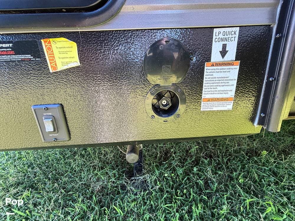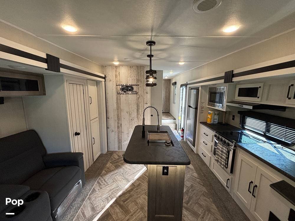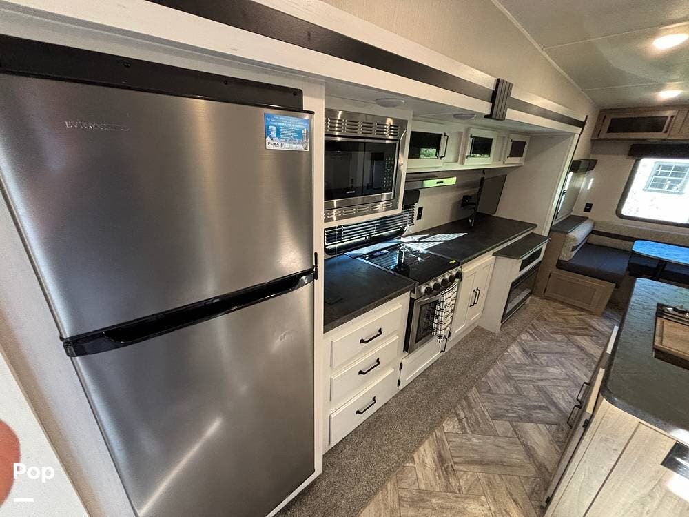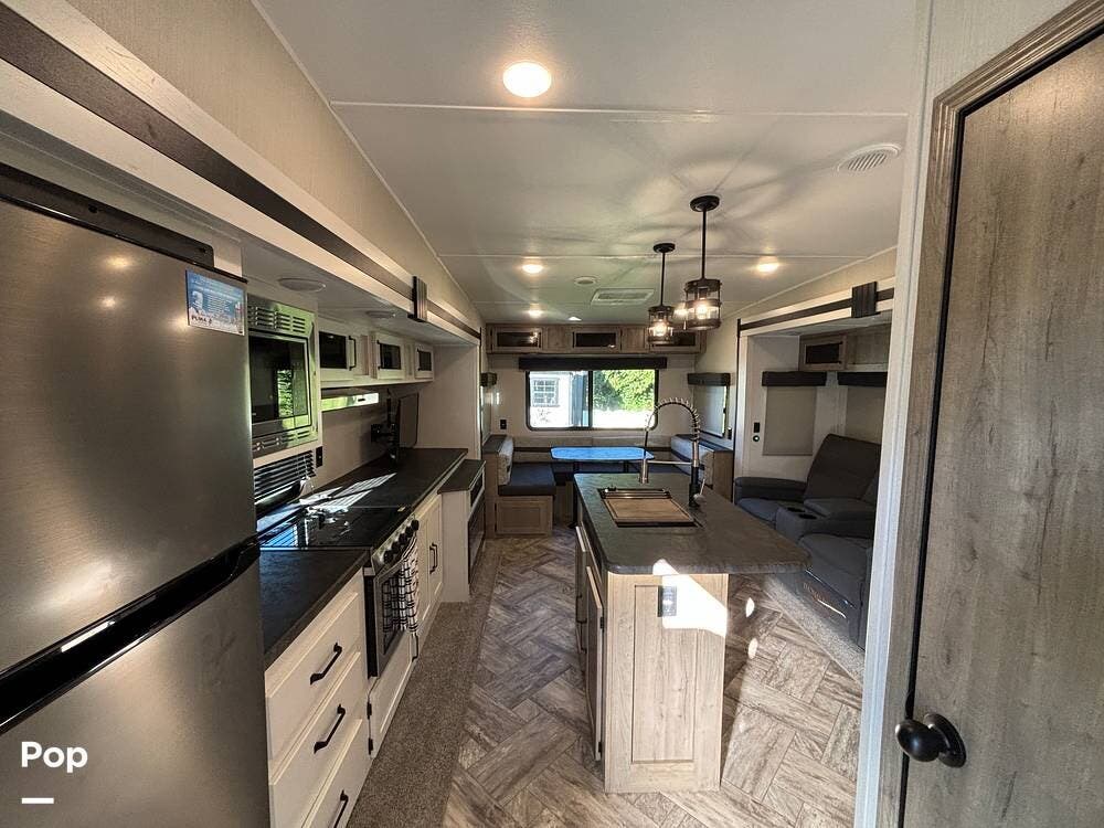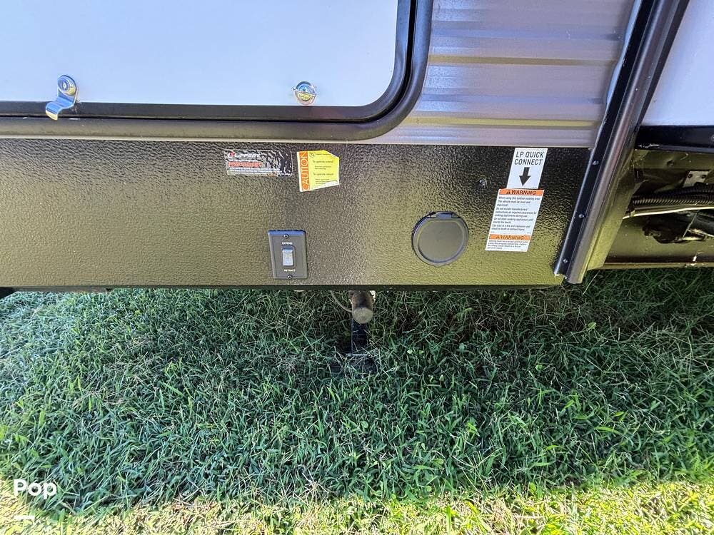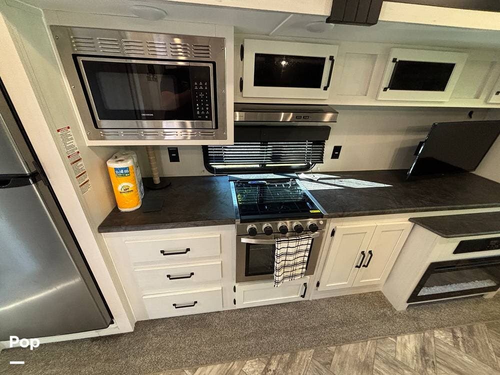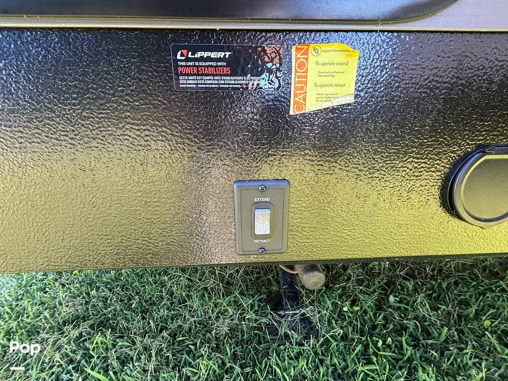 On the exterior, you'll find a sturdy construction with a fiberglass front cap, a large power awning, and pass-through storage for all your gear. The unit is equipped with multiple slide-outs, giving you expanded interior space once you're parked, and an outdoor kitchen that allows you to cook and enjoy meals under the open sky. Easy-to-use electric stabilizer jacks and an enclosed underbelly add both convenience and protection for year-round camping.